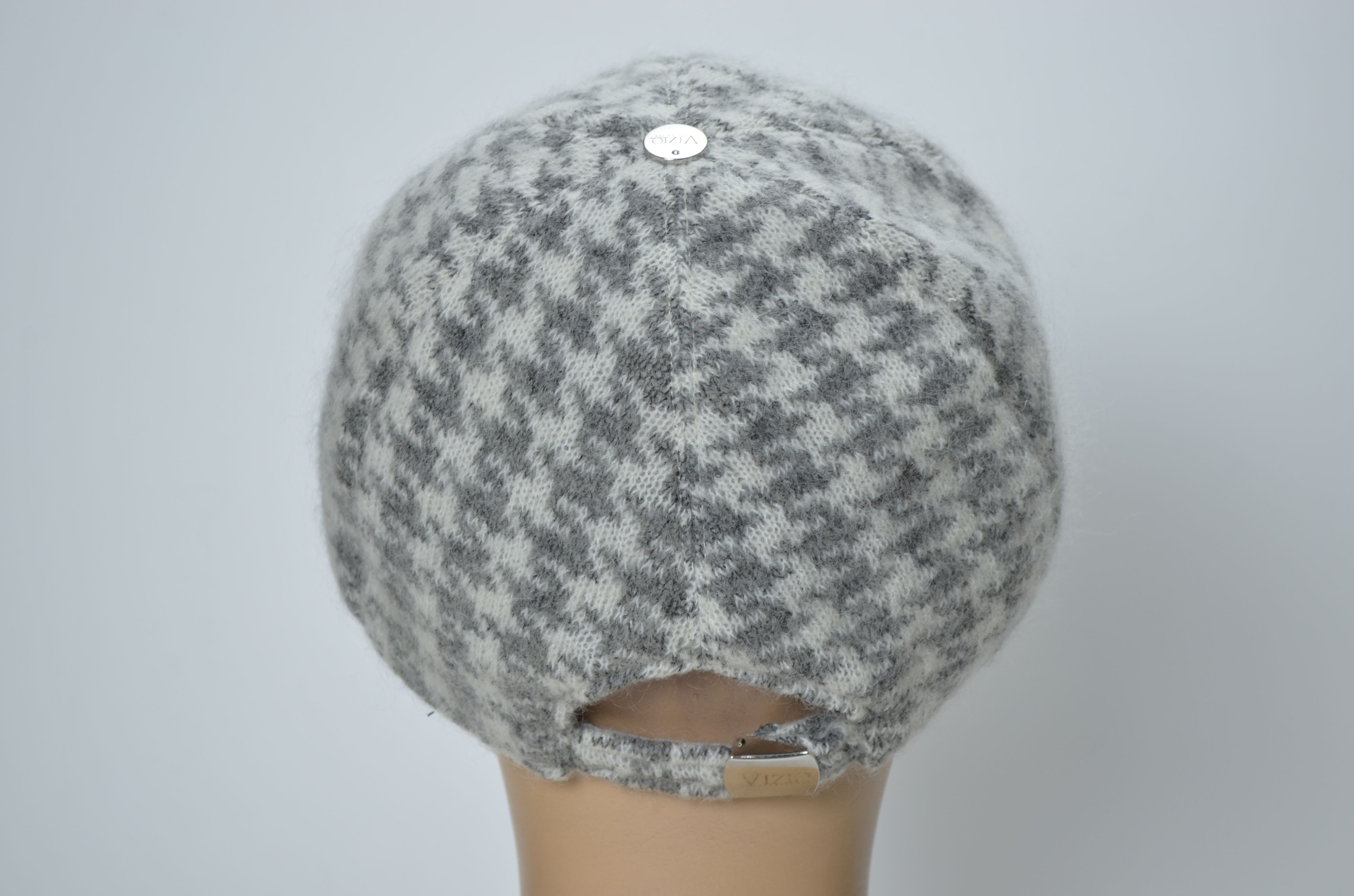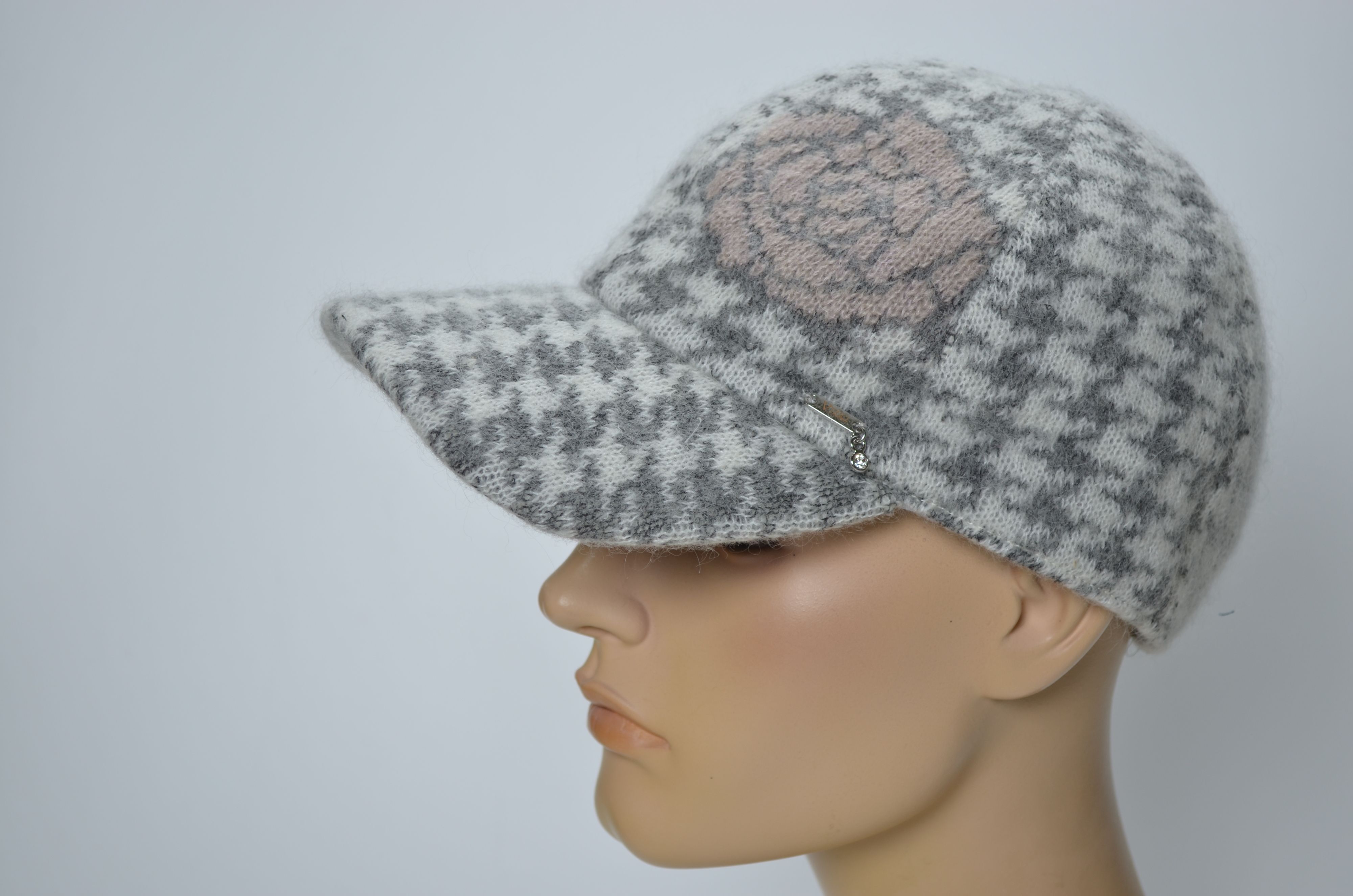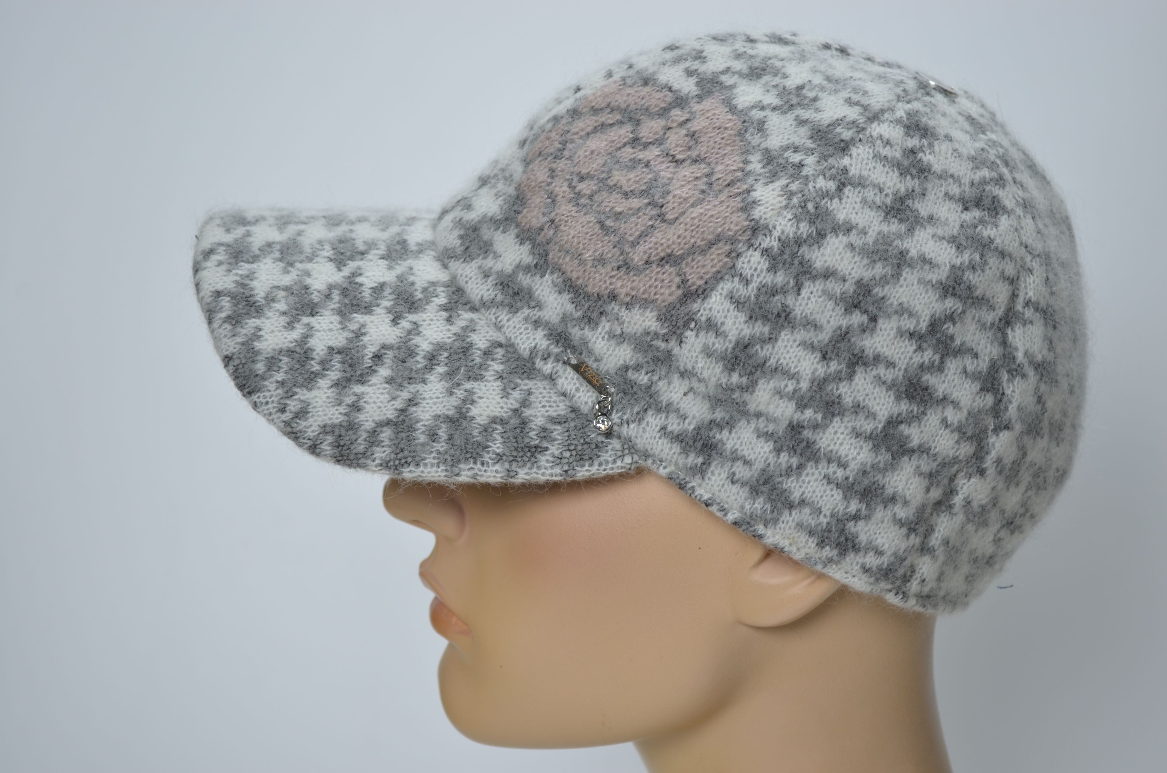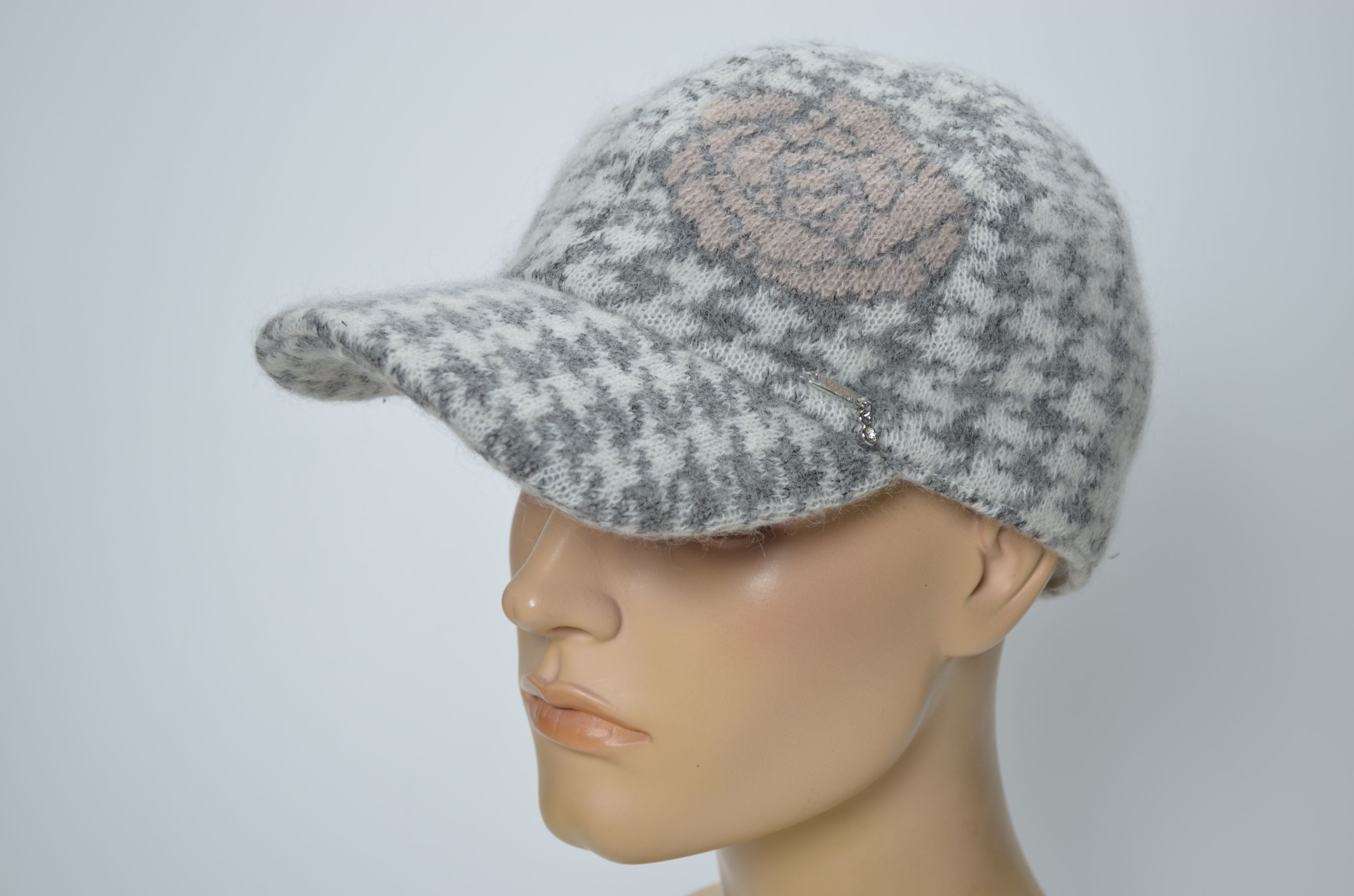 Зимняя женская бейсболка вязаная с цветком зима 2024 - 2025 Vizio Италия 1371 V бело серого цвета коллекция итальянского бренда вязаных бейсболок и кепок для женщин Vizio Collezione