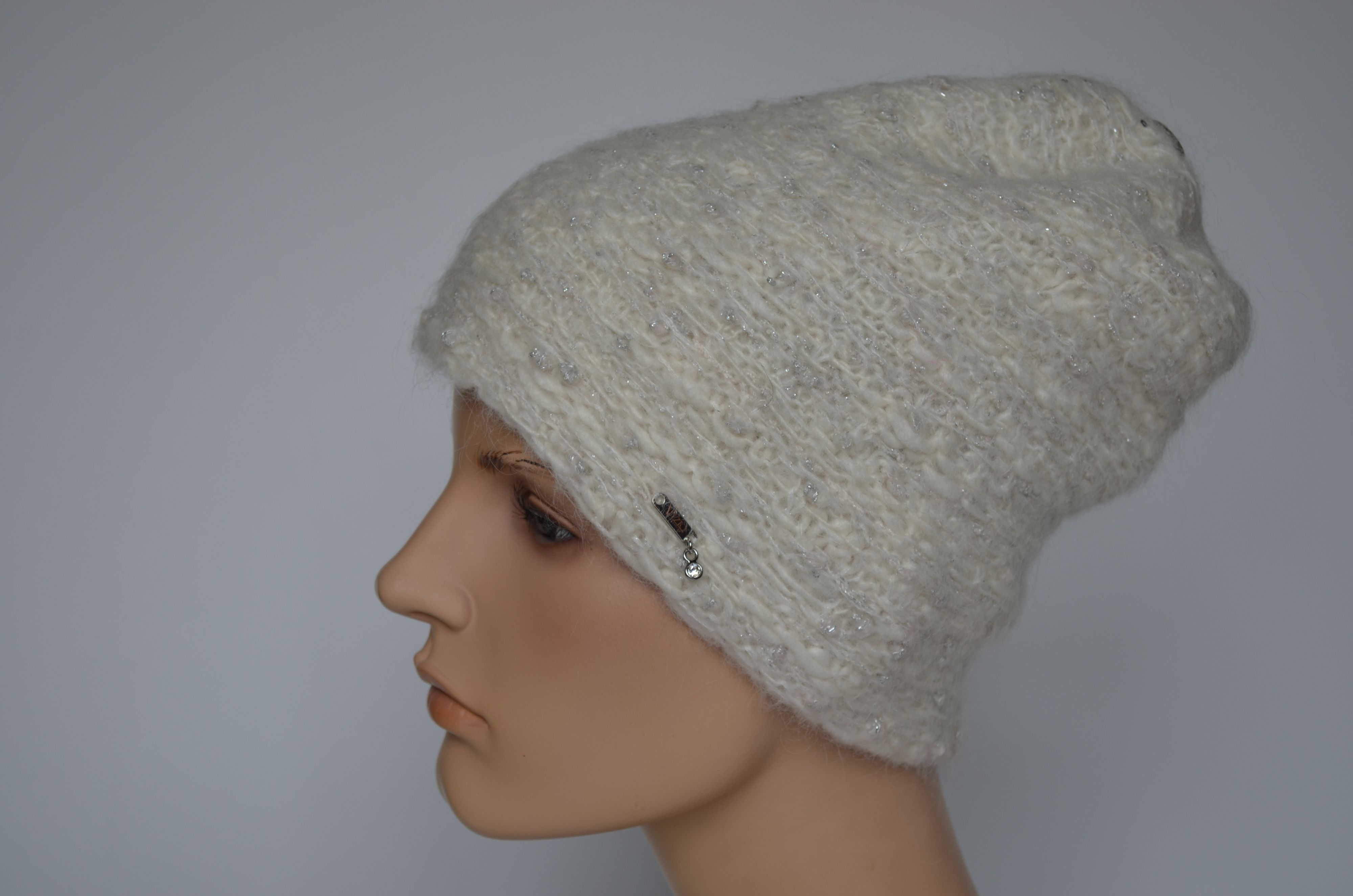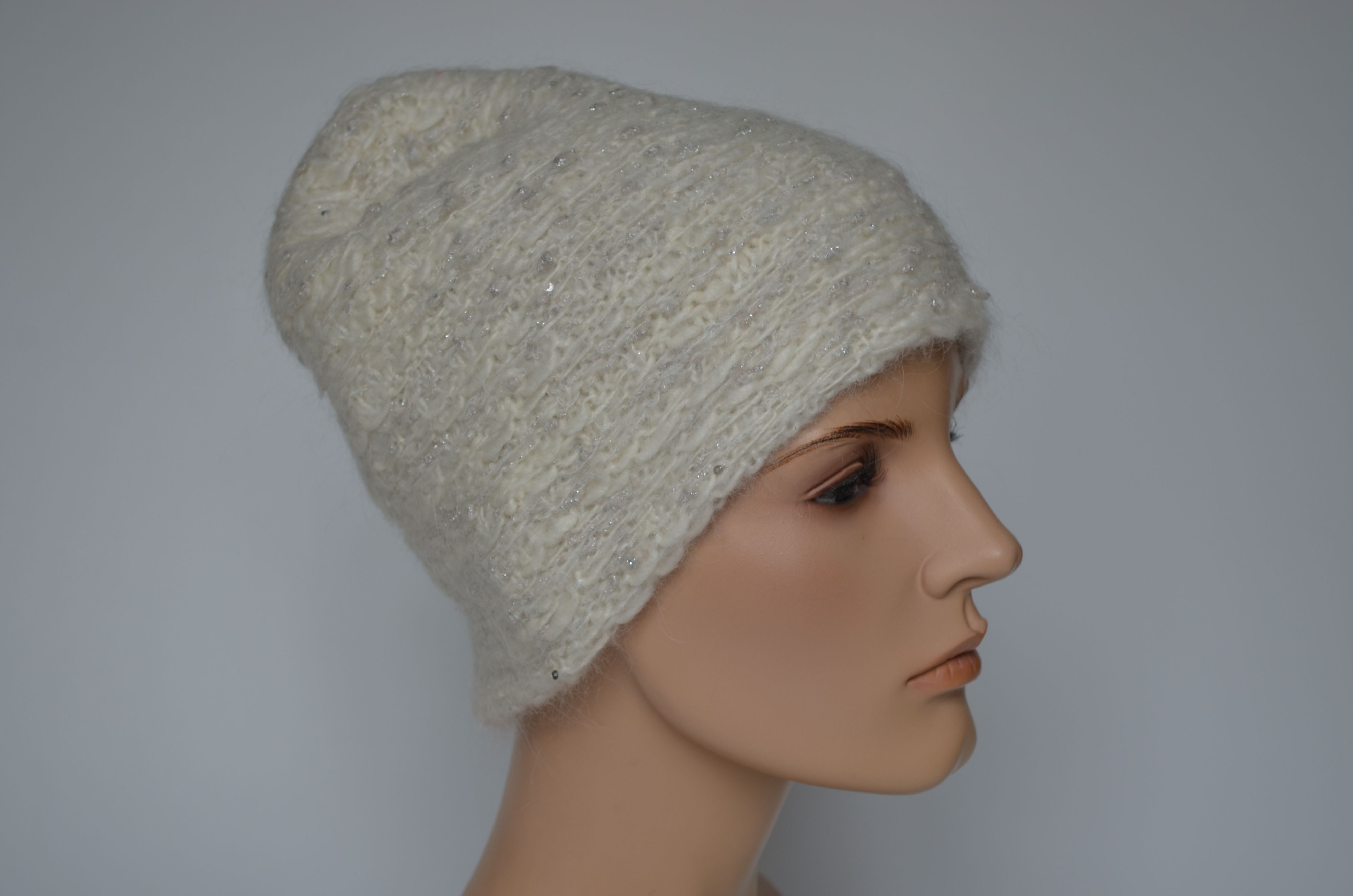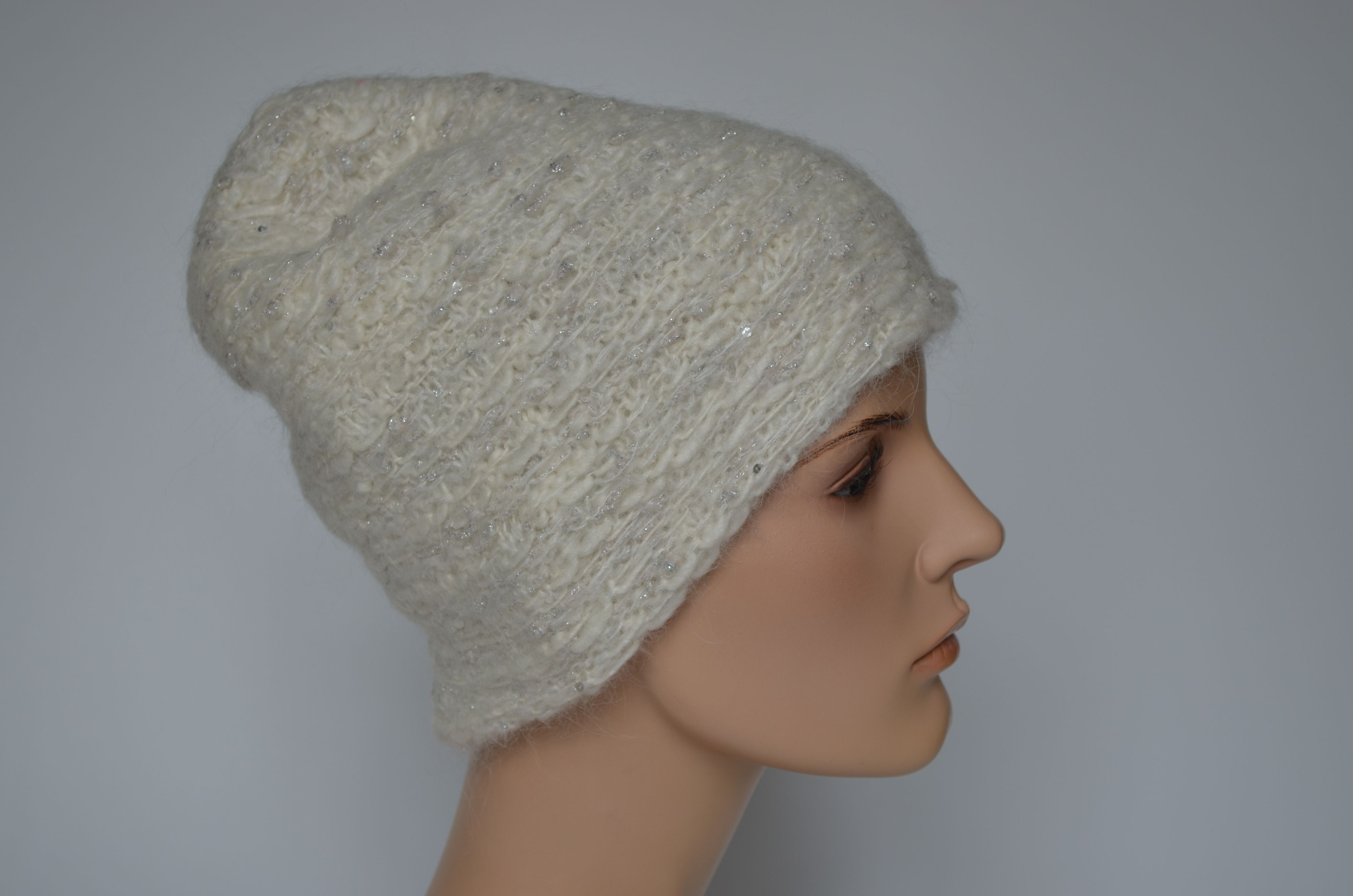 Зимняя белая шапка бини из шерсти альпака и мохера с вязаным подкладом