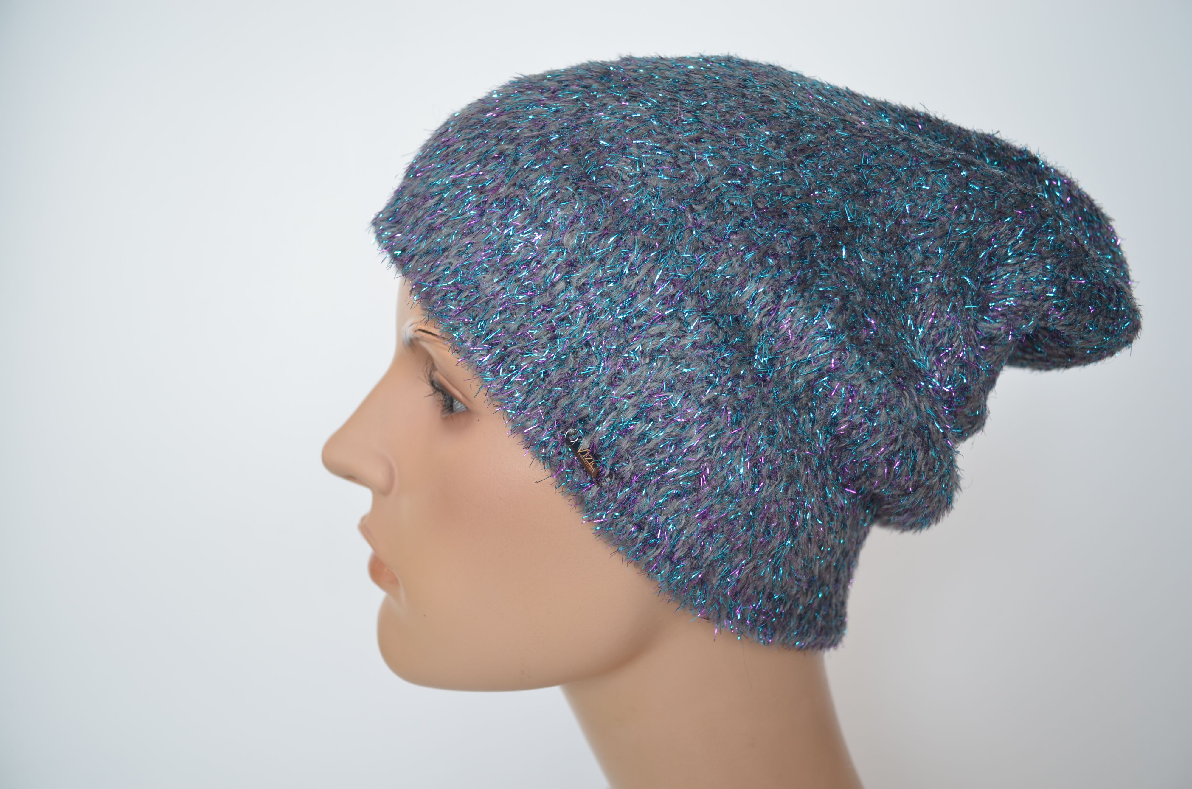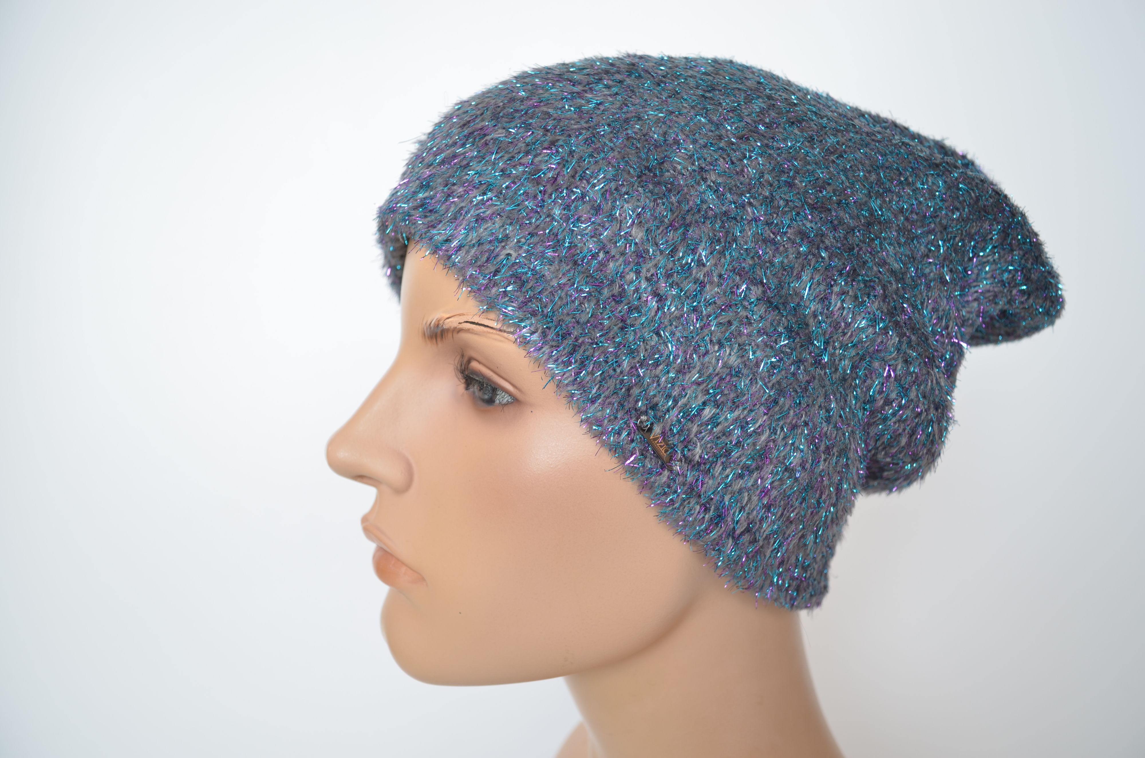Женская голубая серая шапка с блестками зимняя вязаная двойная