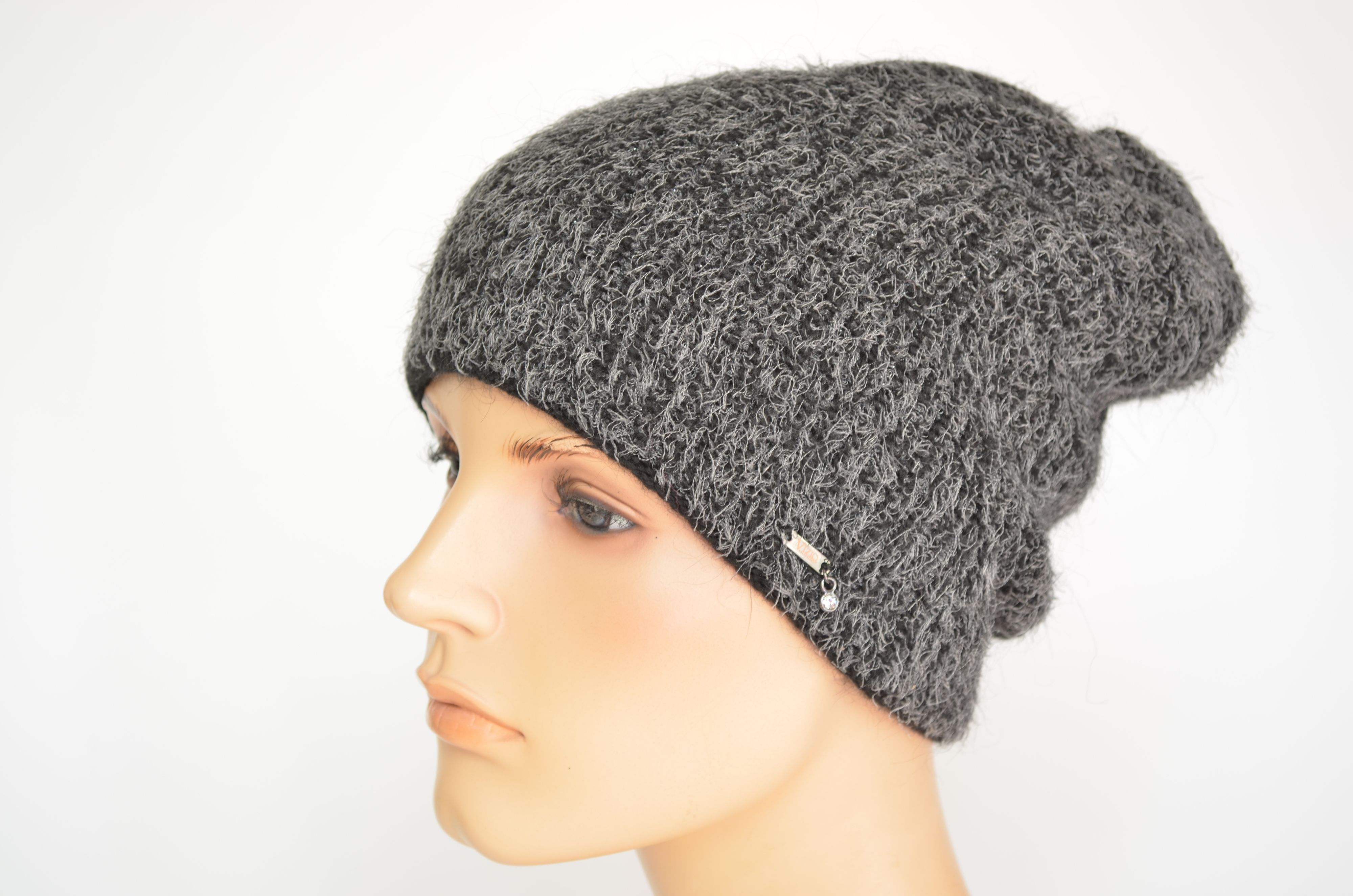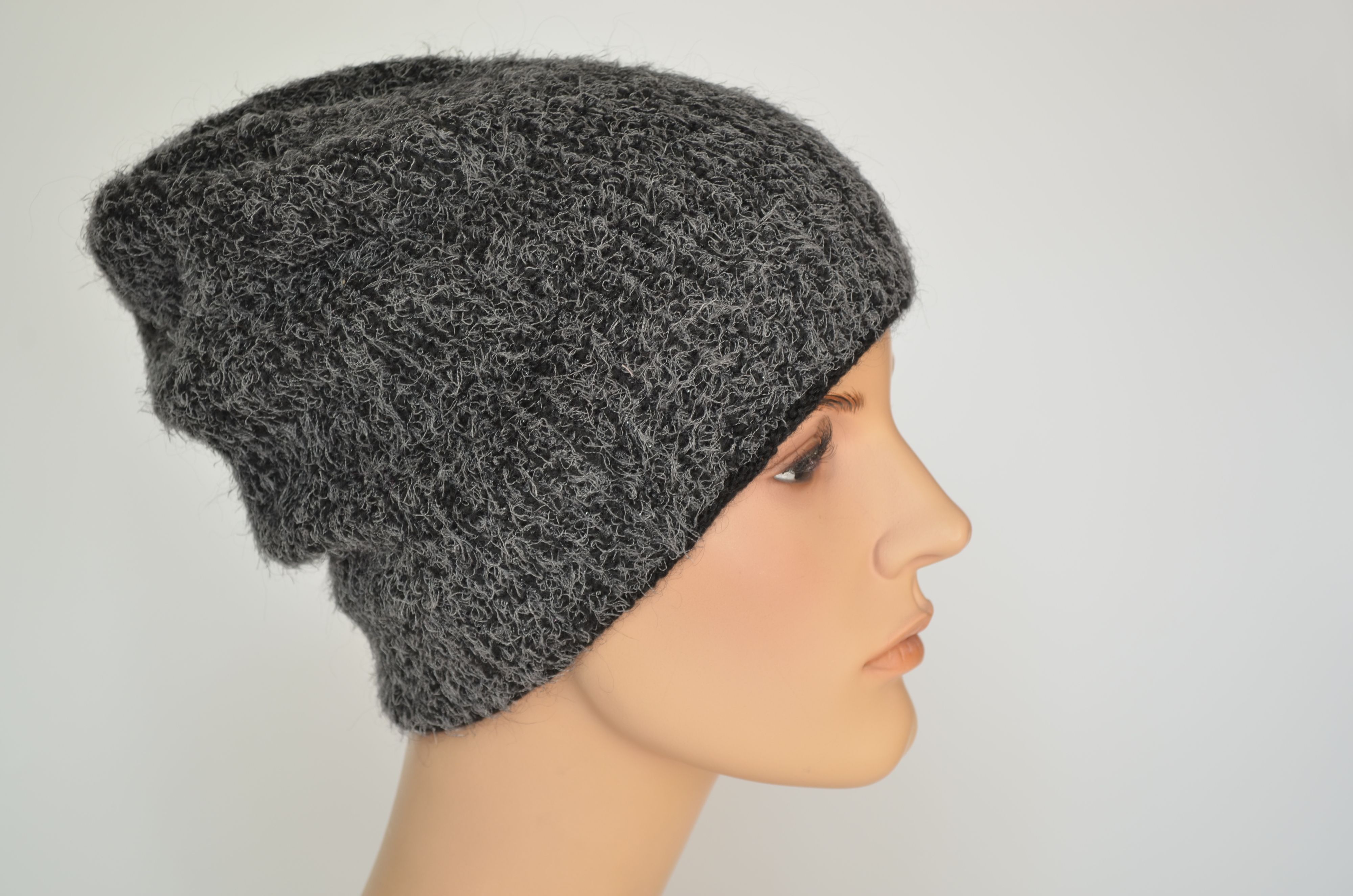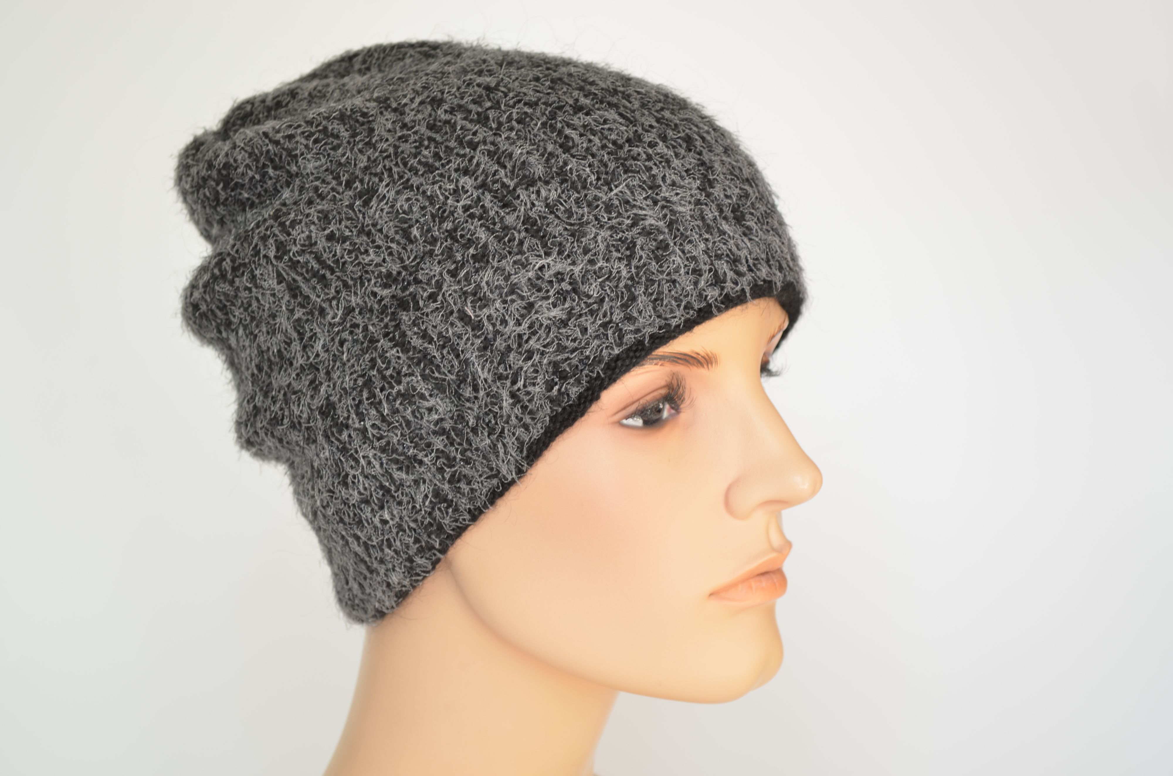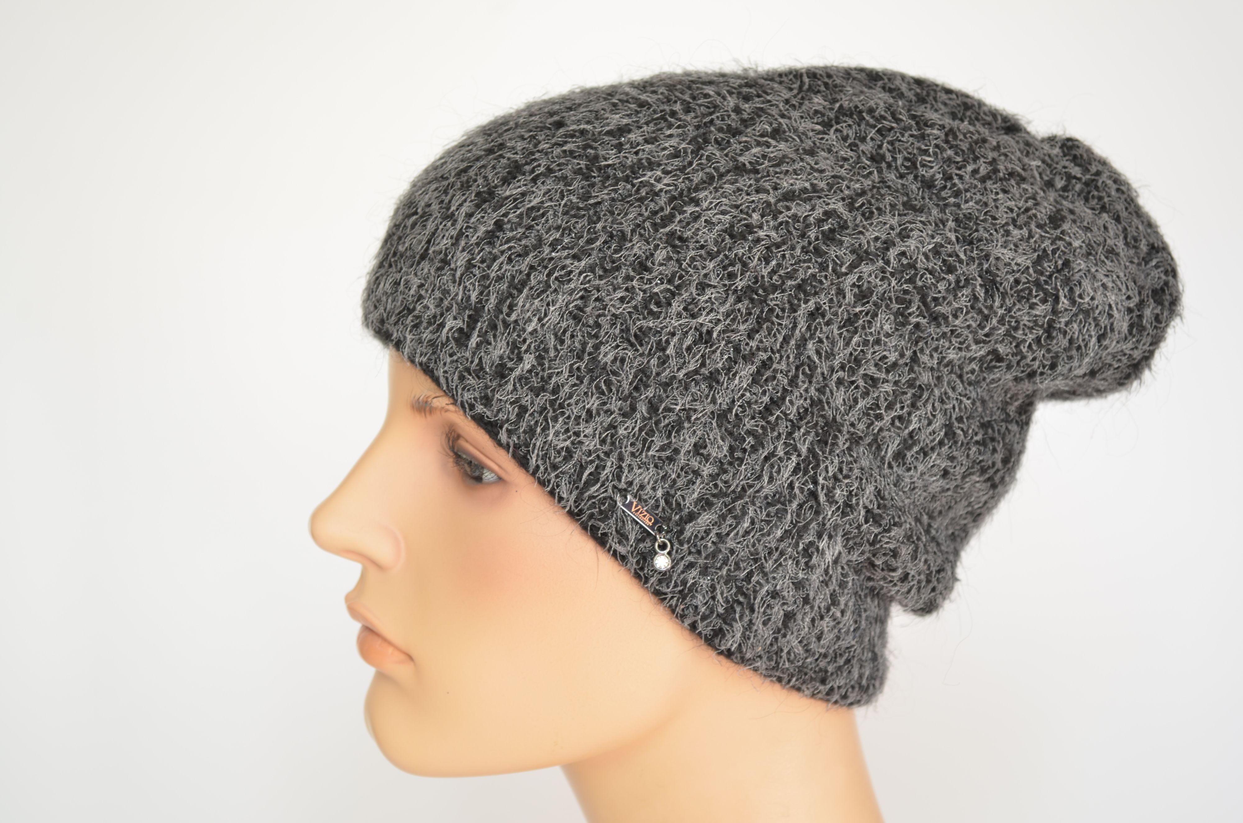 Женская черно серая вязаная шапка зимняя из мохера и шерсти осень зима 2024 - 2025 с вязаным подкладом