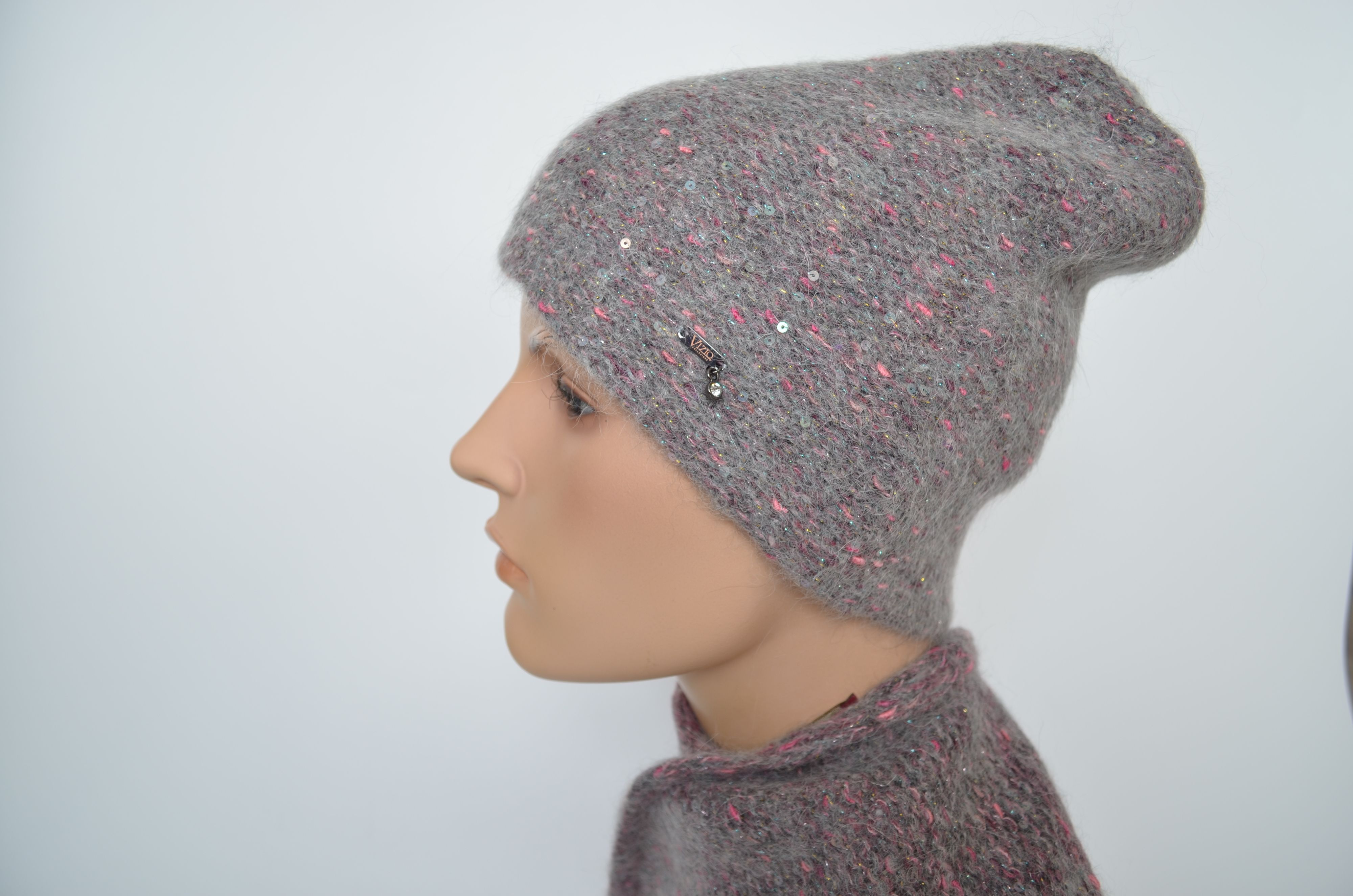 Женский вязаный зимний шарф с пайетками серый с фуксией