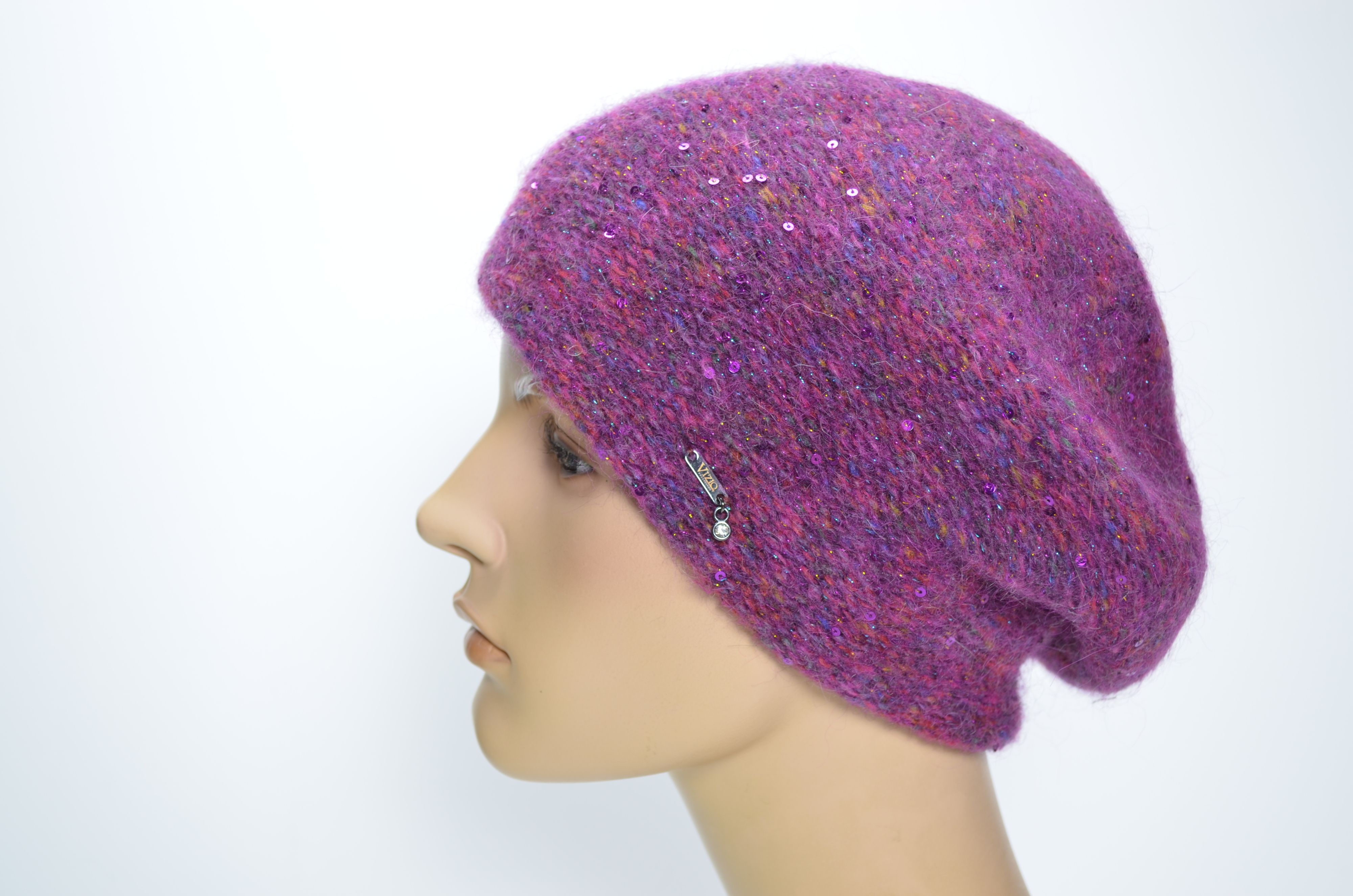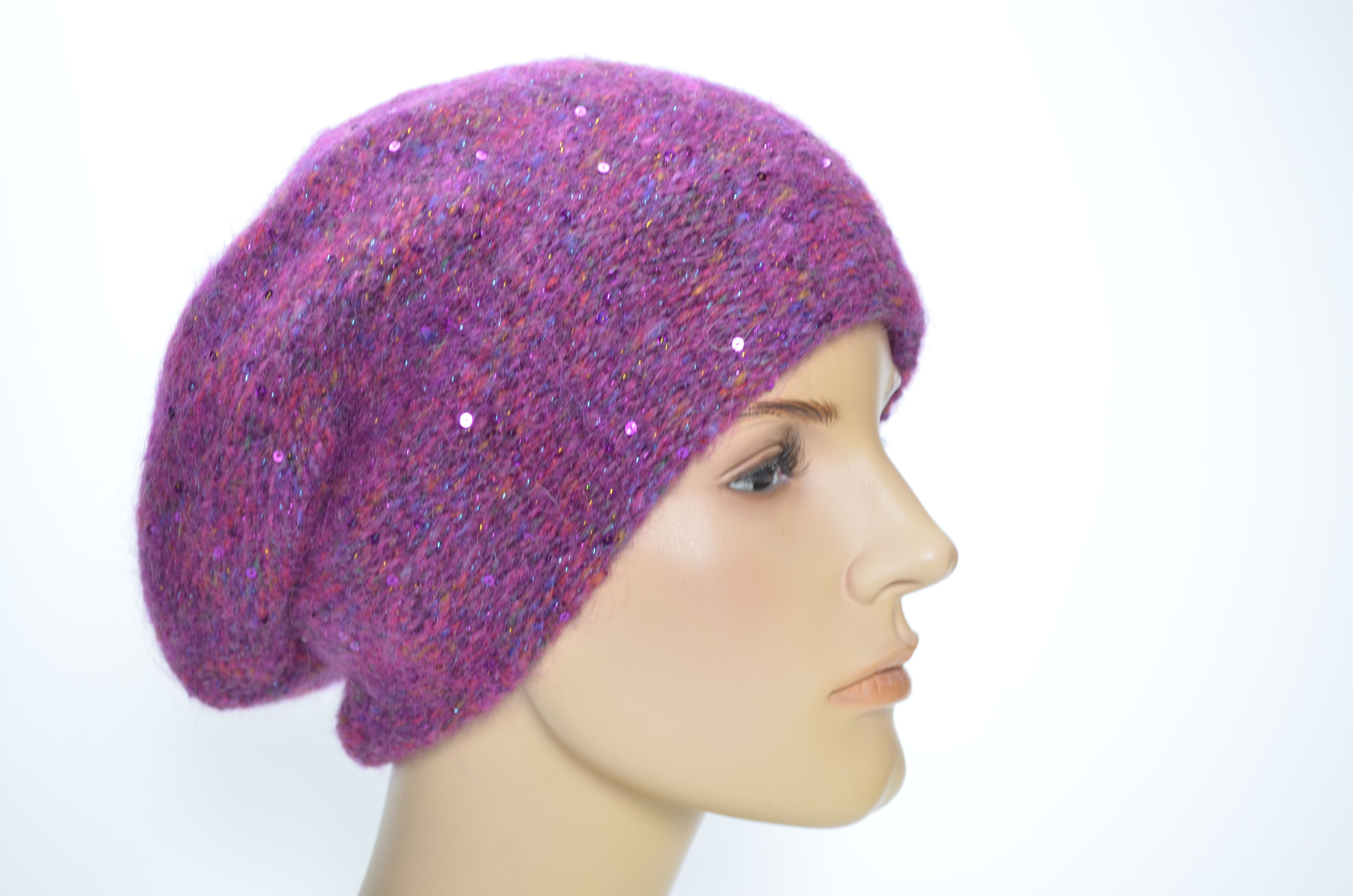 Женский берет вязаный зимний цвета фуксия с вязаным подкладом и пайетками