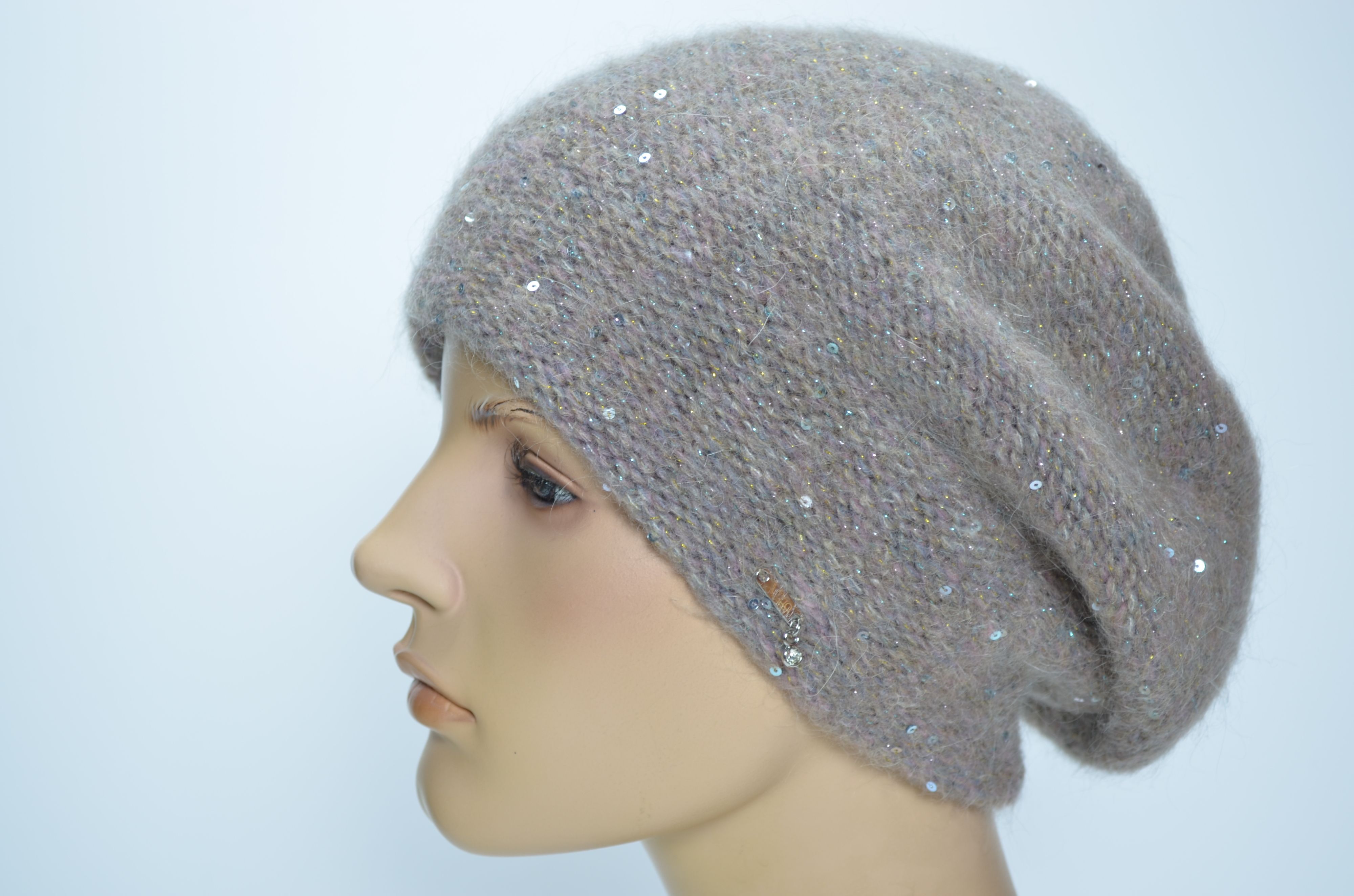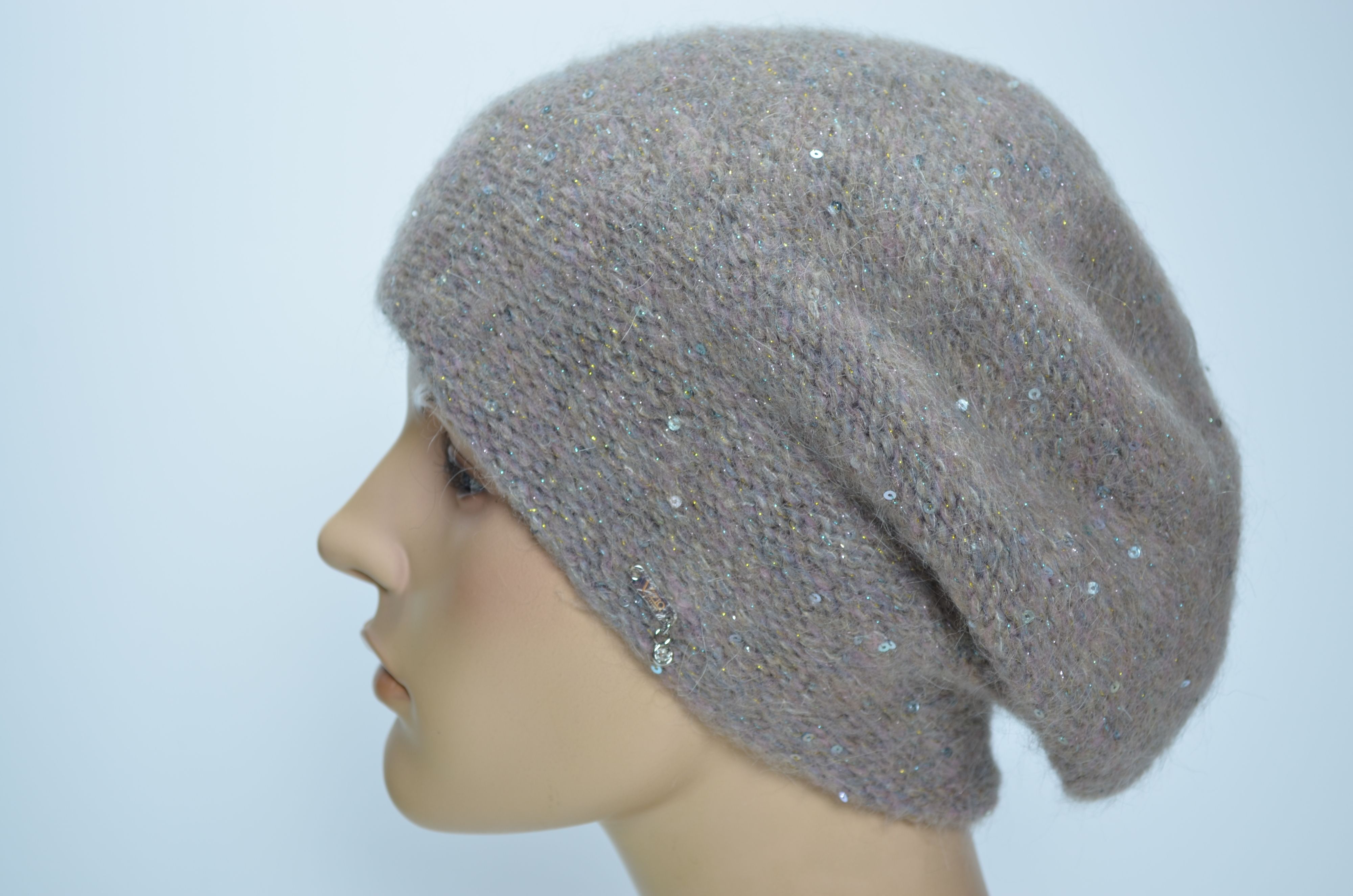 Ореховый женский берет вязаный зимний с вязаным подкладом и пайетками