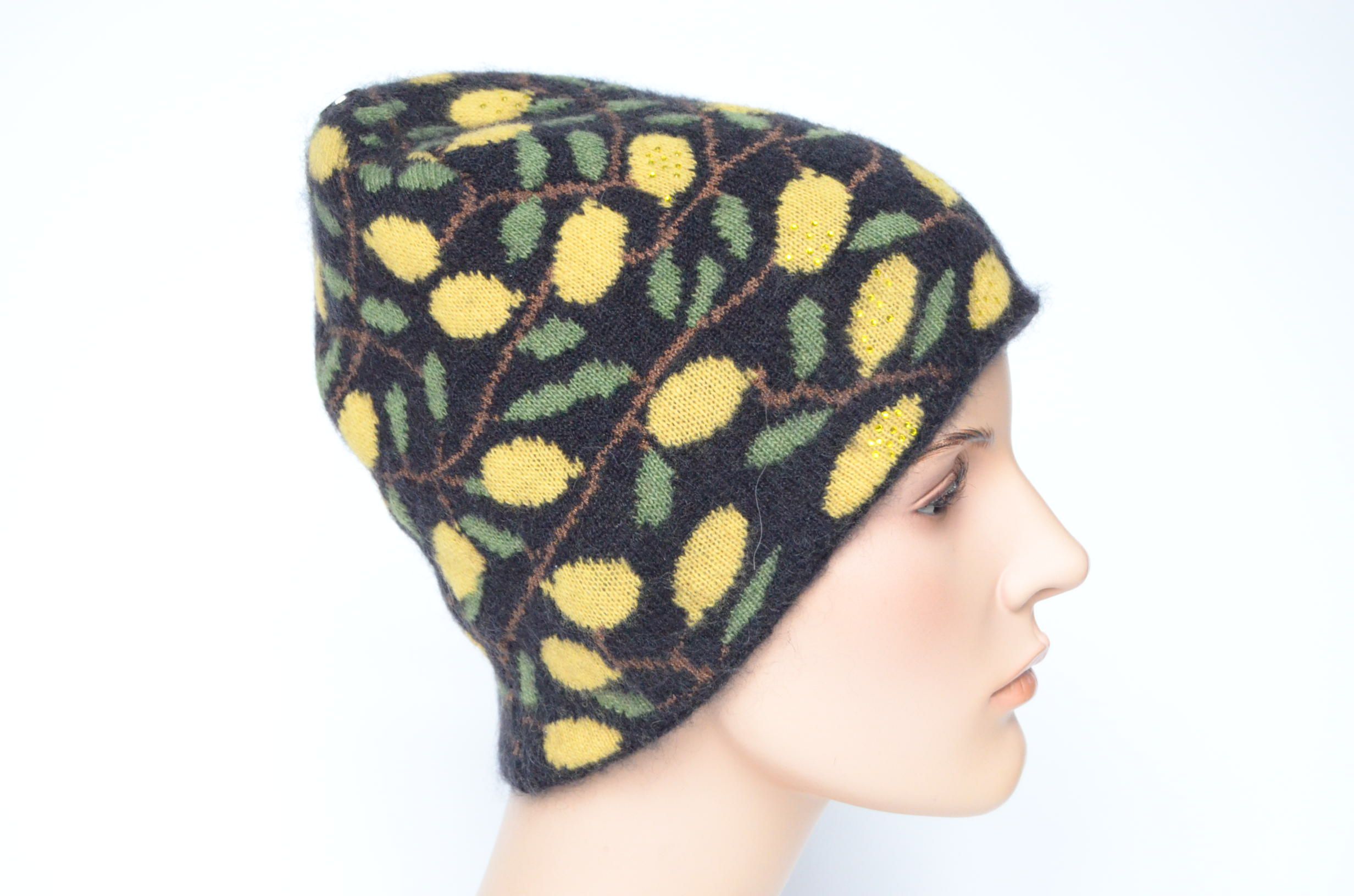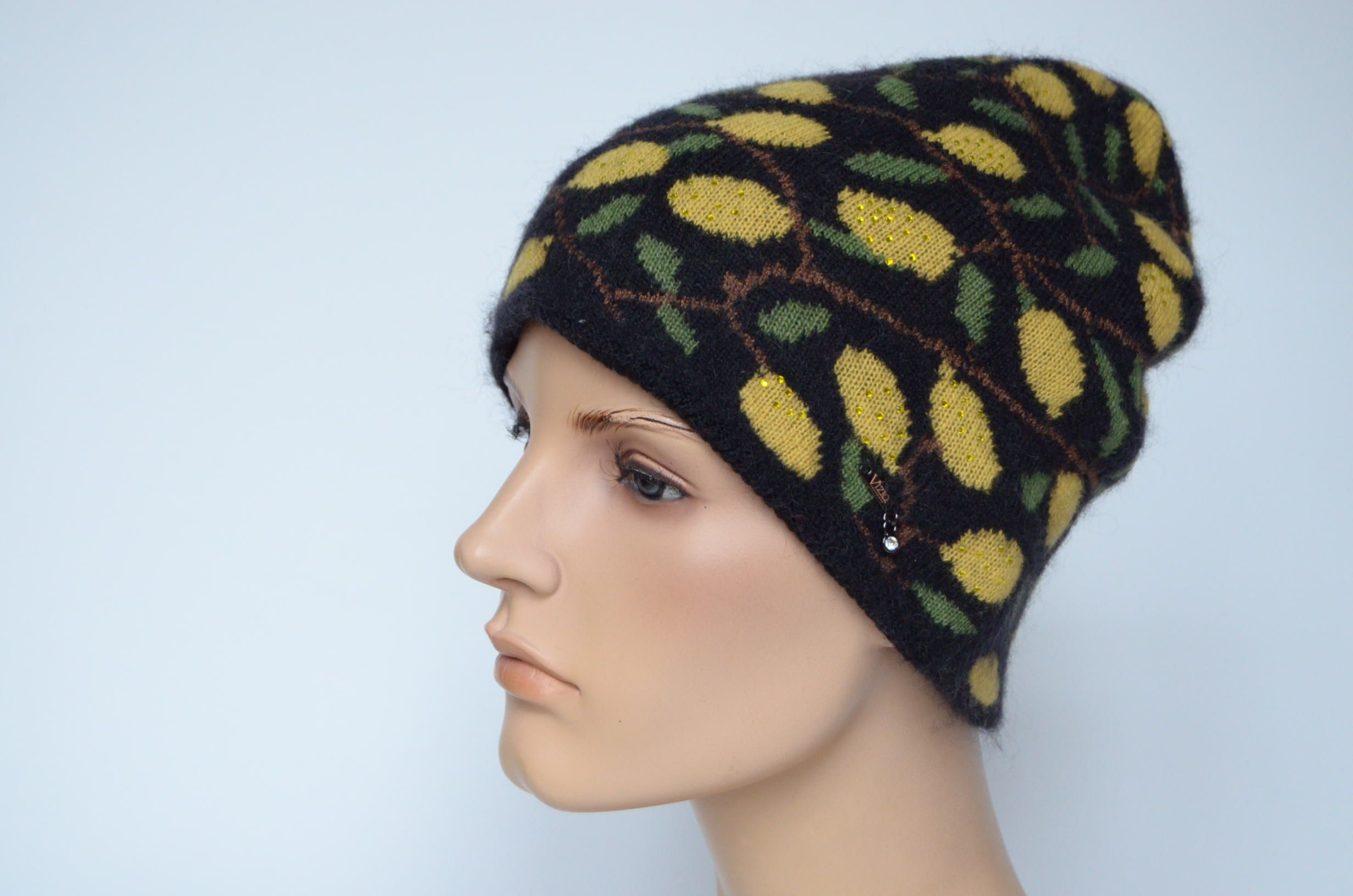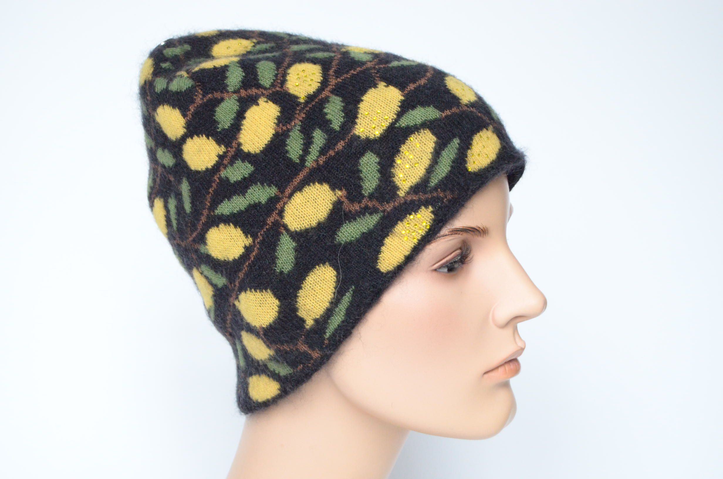 Купить черную вязаную шапку с лимонами итальянского дизайнера шапок и беретов Vizio Collezione в интернет магазине с доставкой по Москве и России