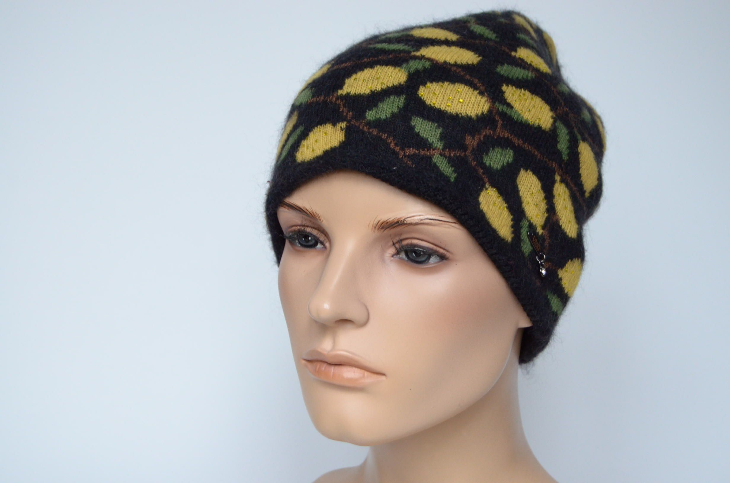 Черная вязаная шапка с вязаным принтом лимоны зимняя женская