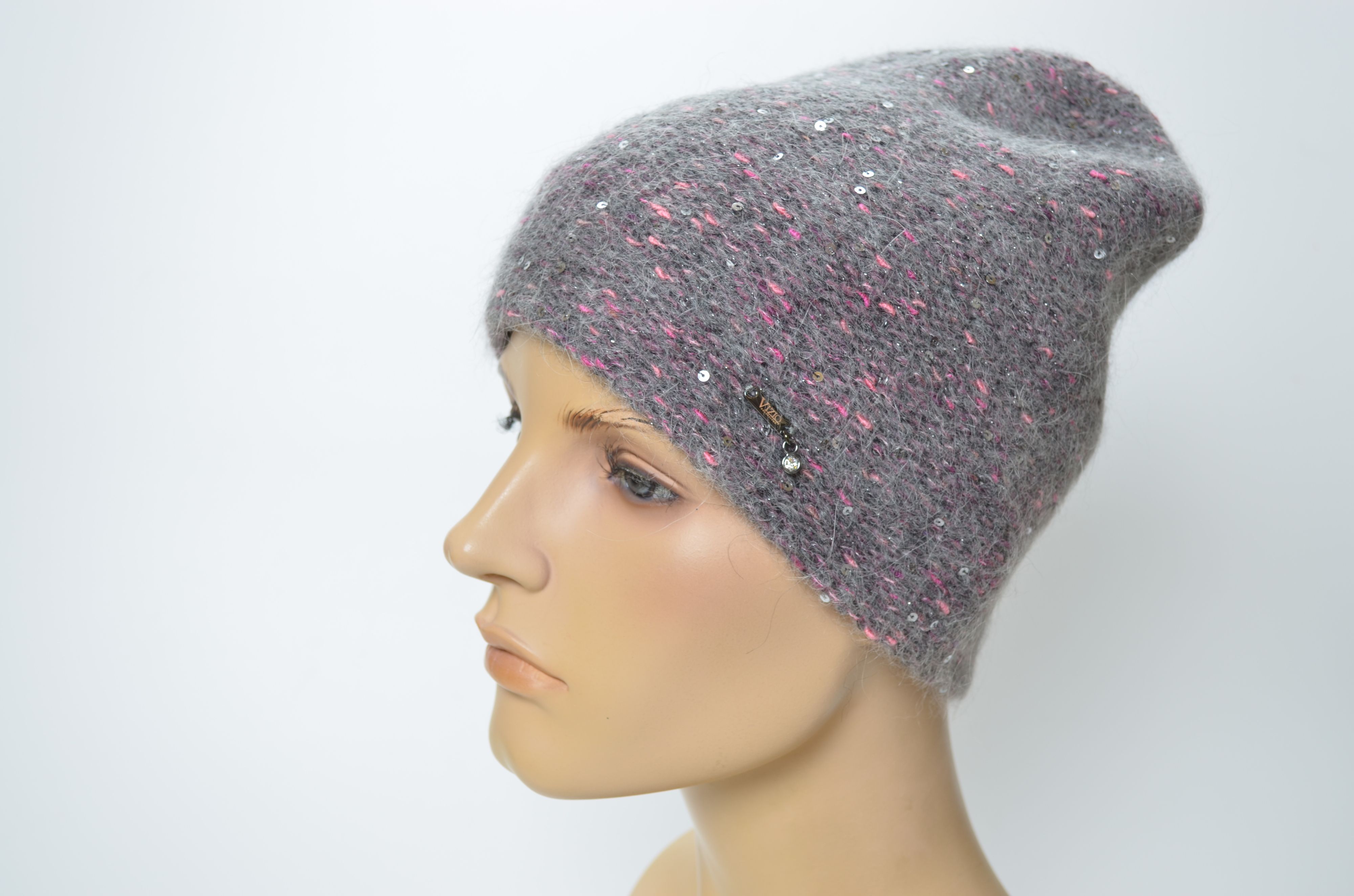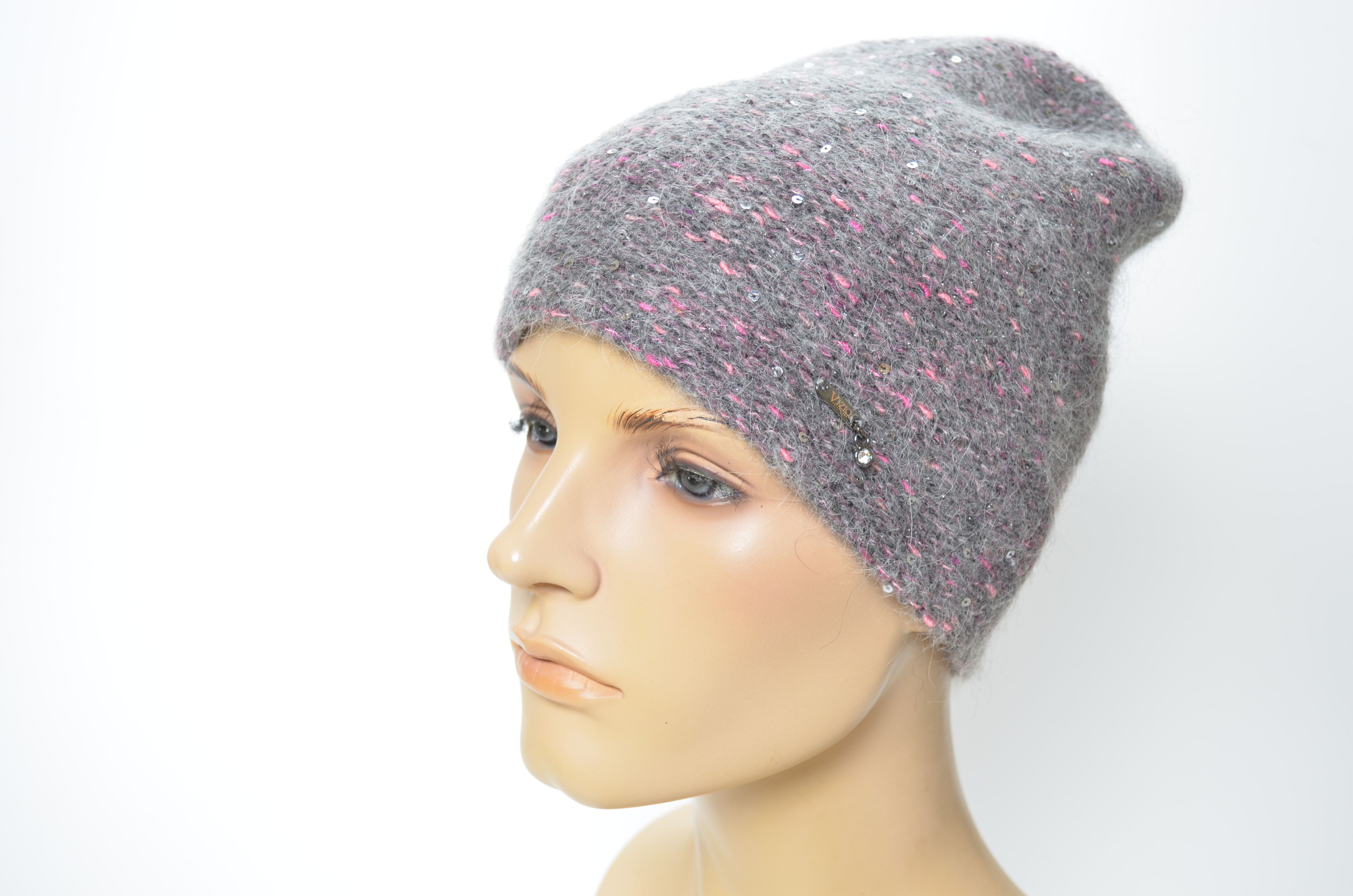 Итальянская вязаная шапка из меланжевой пряжи серая с фуксией и пайетками Vizio 1010 CL купить в интернет магазине головных уборов Италии Визио