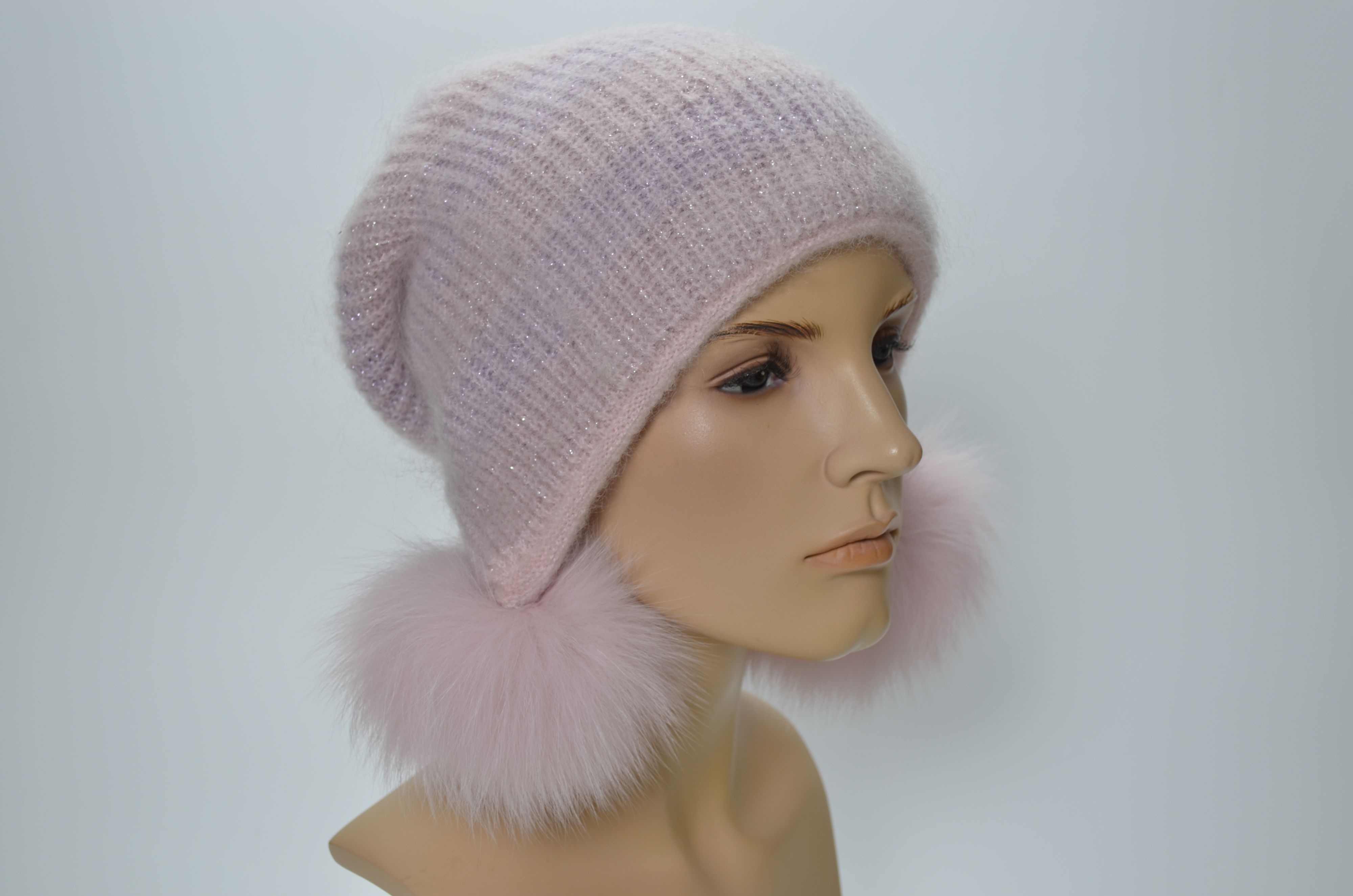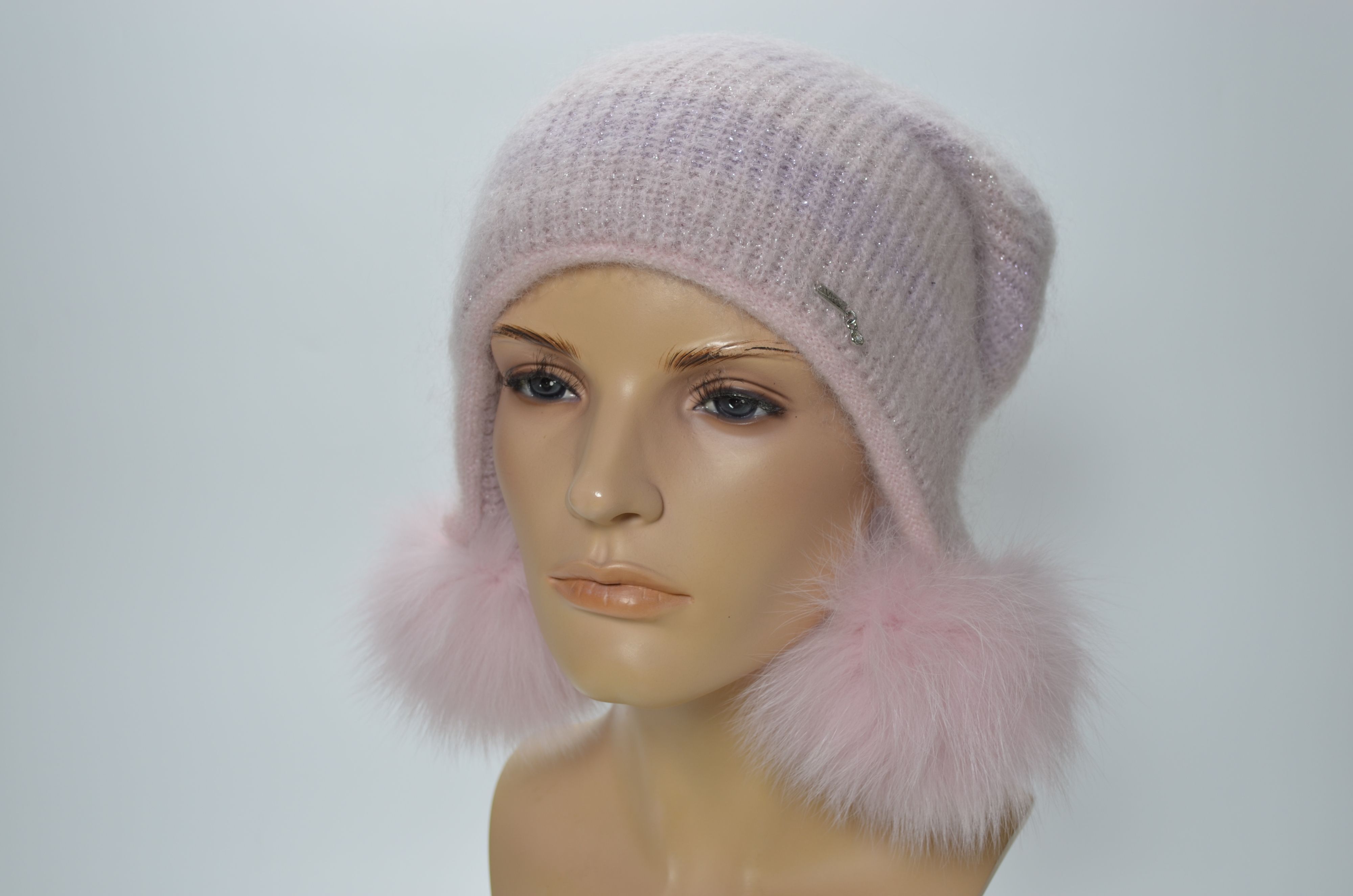 Вязаная розовая шапка ушанка мохеровая Vizio Италия 1444 PP 66 со съемными помпонами из коллекции итальянских беретов и шапок Вицио зима 2024 - 2025 бренда женских головных уборов Визио Vizio Collezione