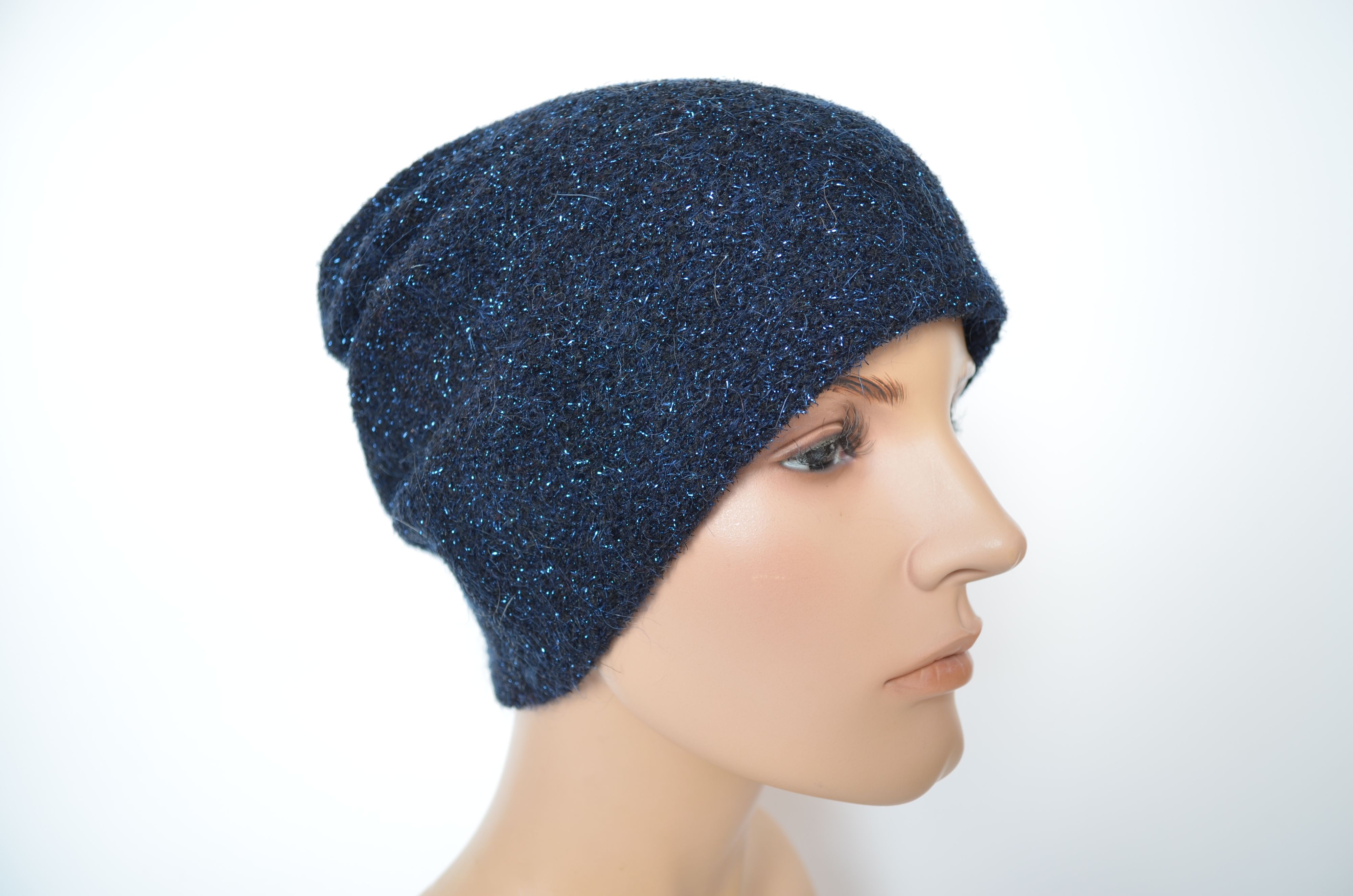 Женская синяя шапка с блестками зимняя вязаная двойная