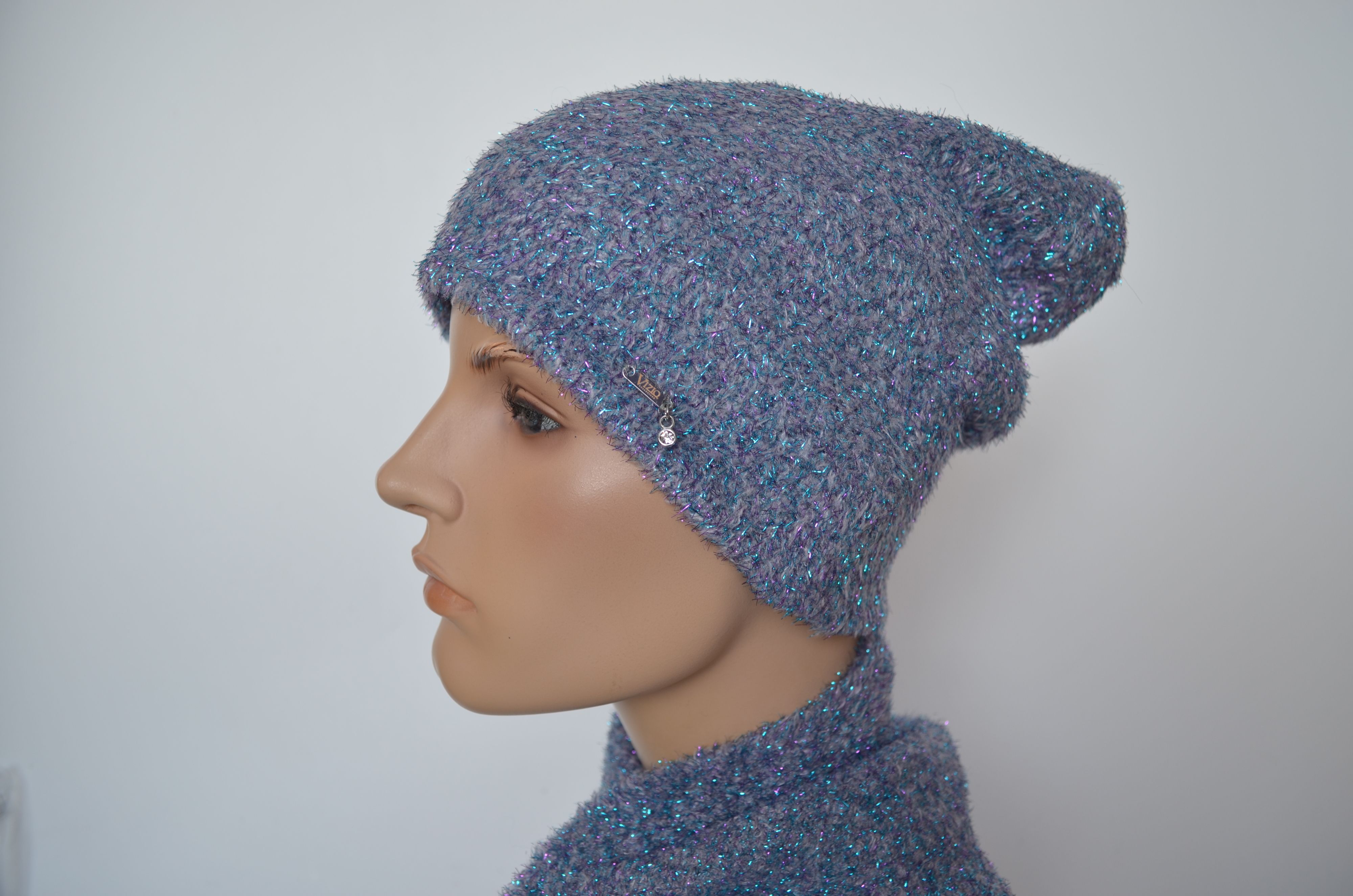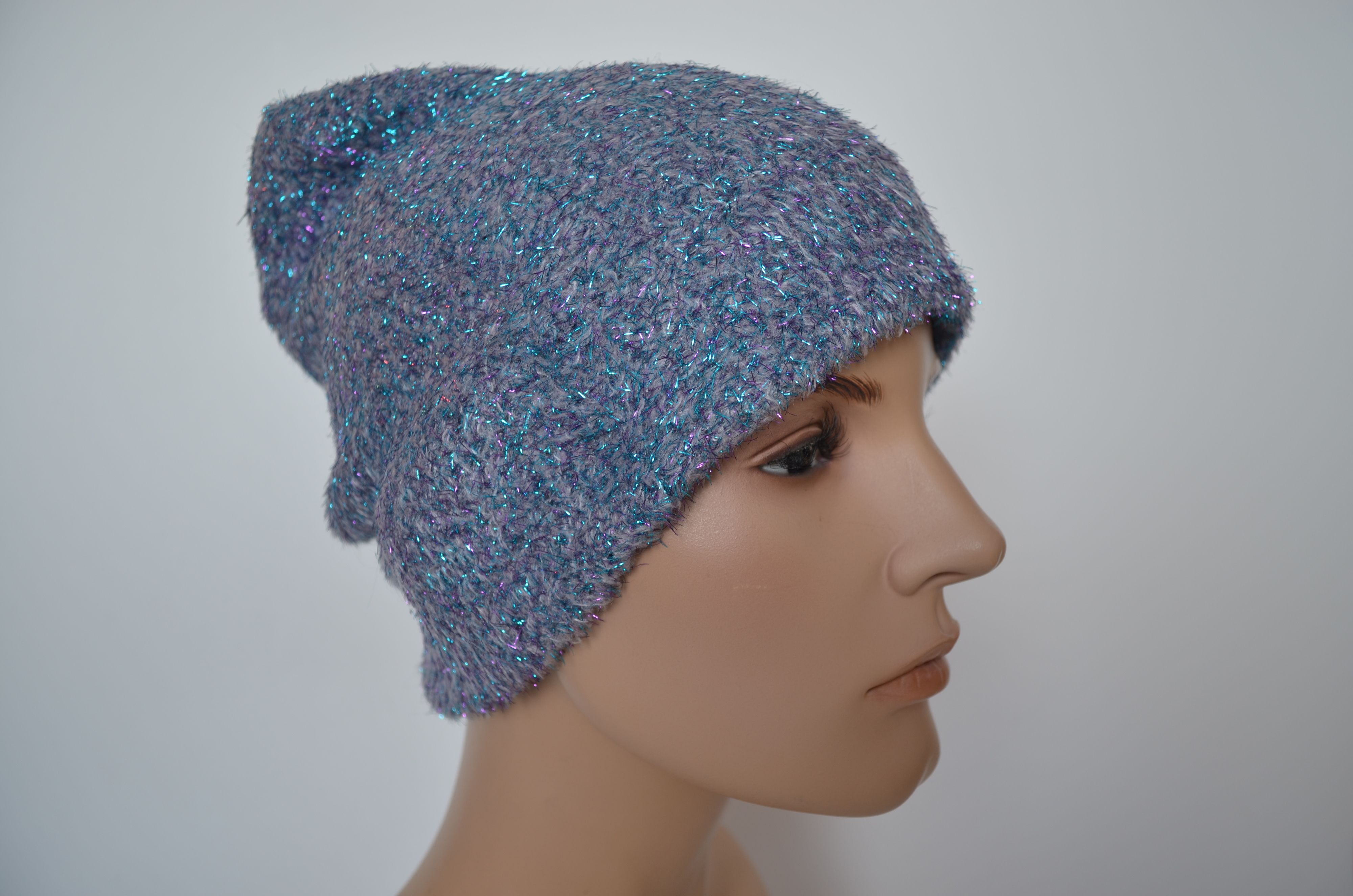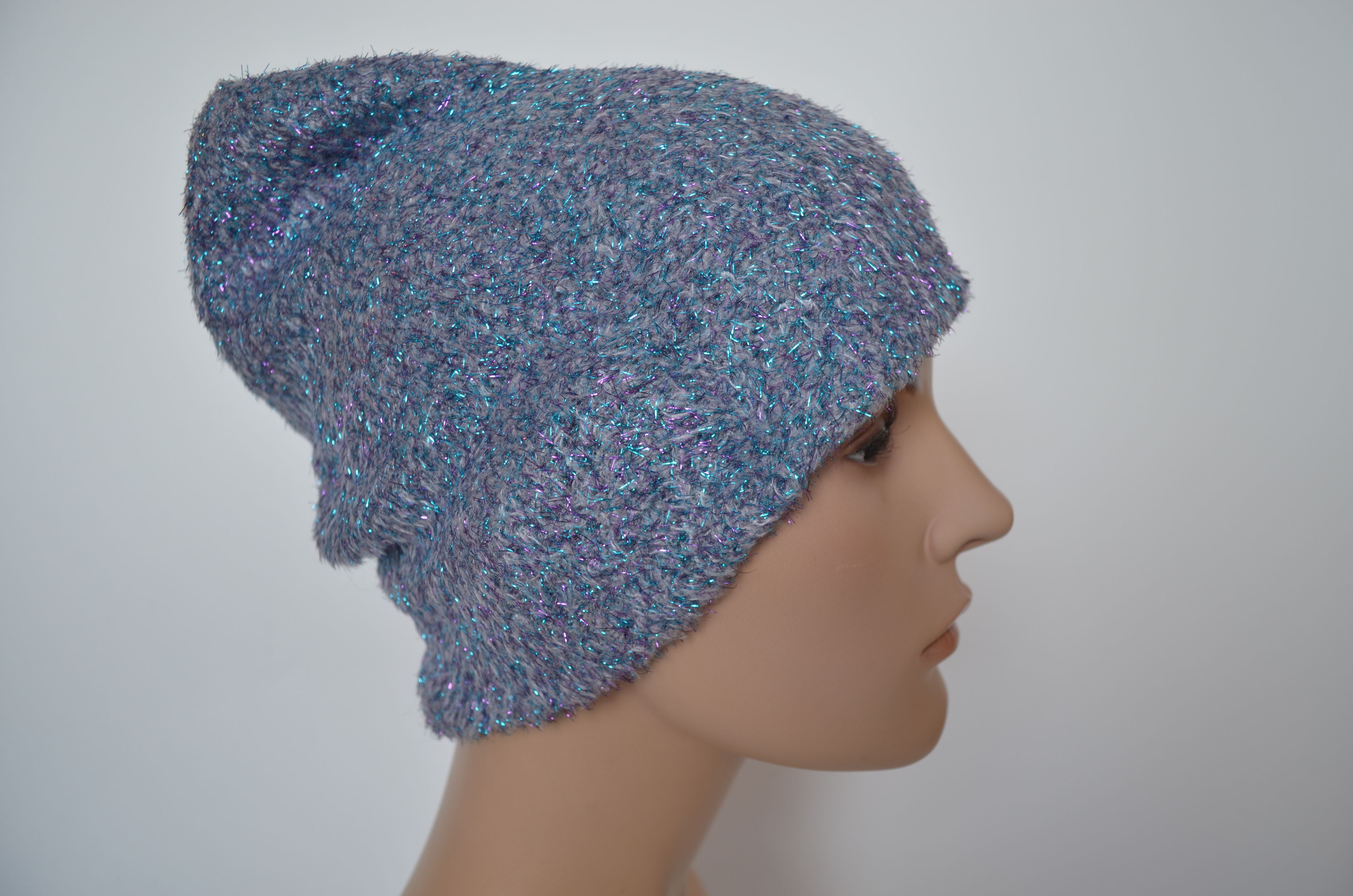 Женская голубая светло серая шапка с блестками зимняя вязаная двойная