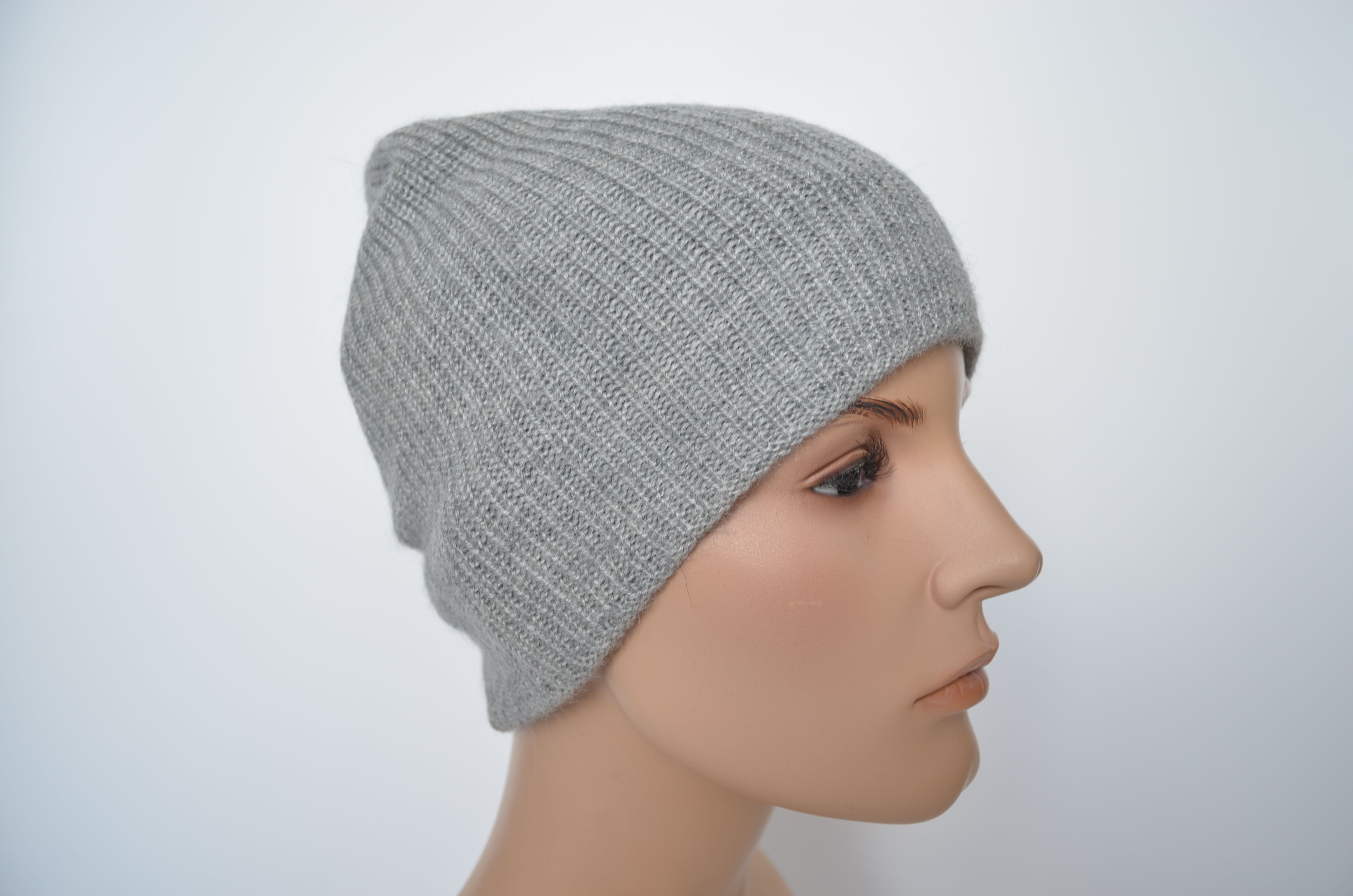 Вязаная двойная женская вязаная зимняя шапка светло серая из альпака и шелка