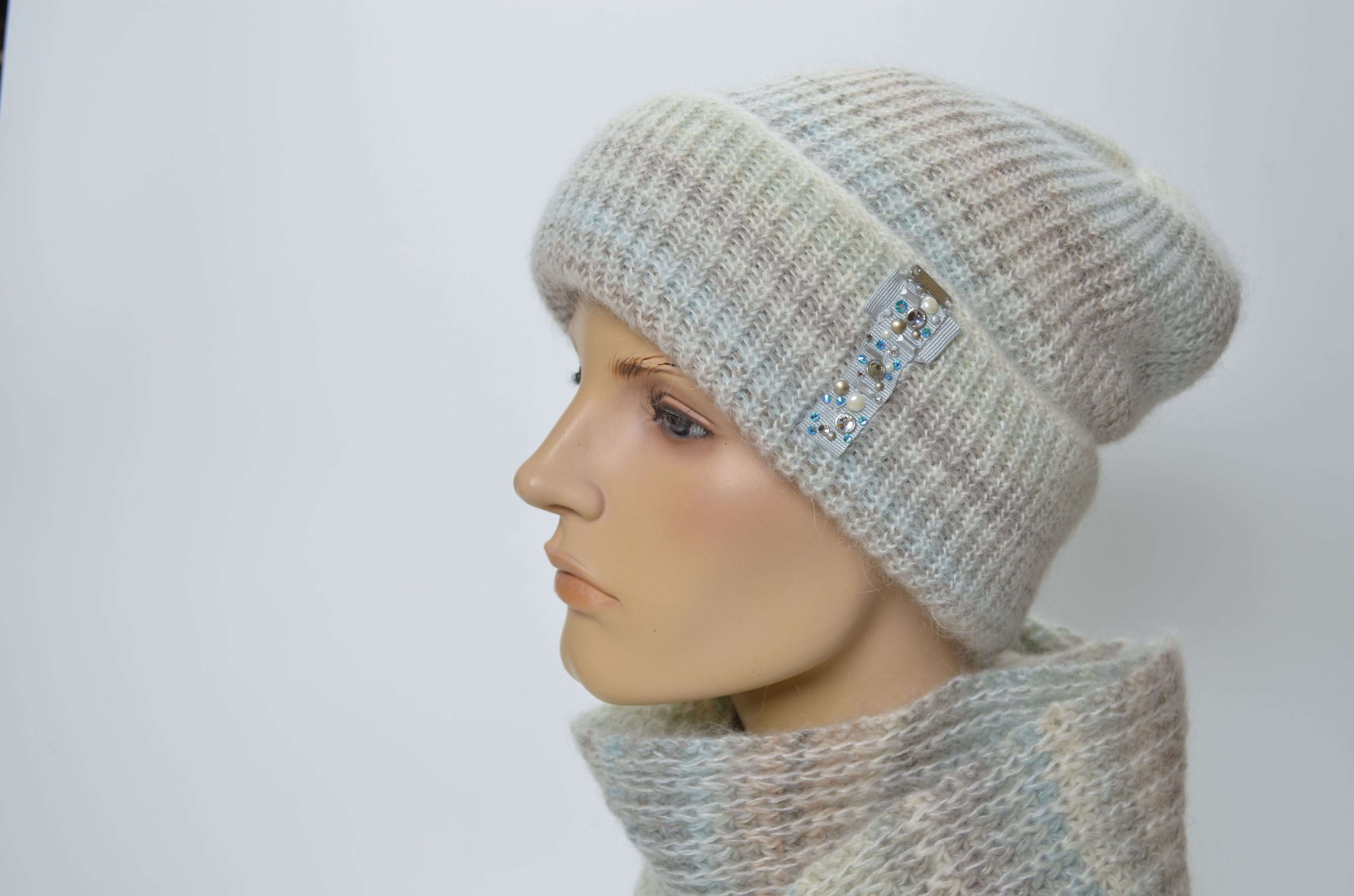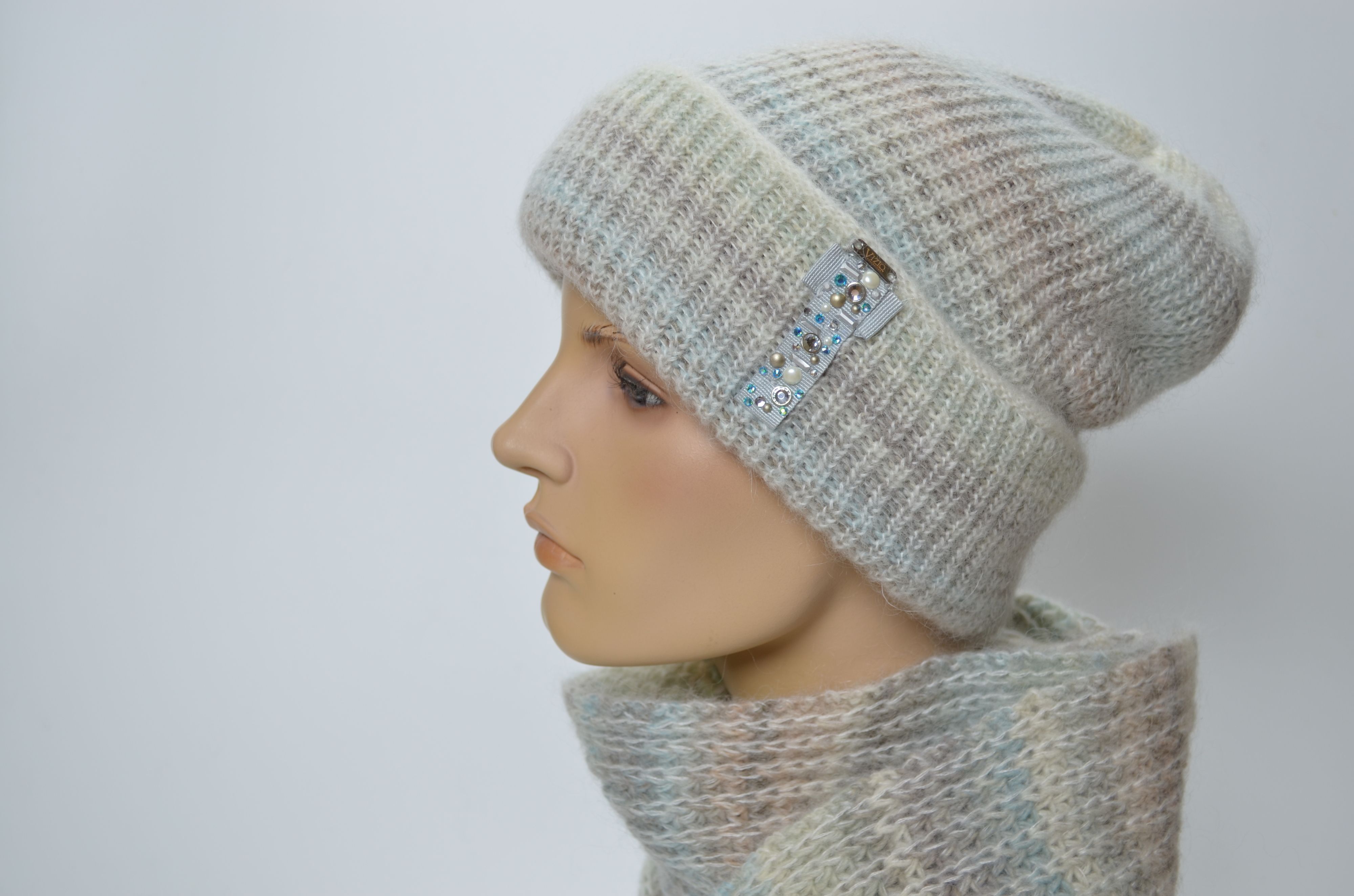 Женская разноцветная белая вязаная шапка зимняя двойная с вязаным подкладом и шарф комплект зима 2025
