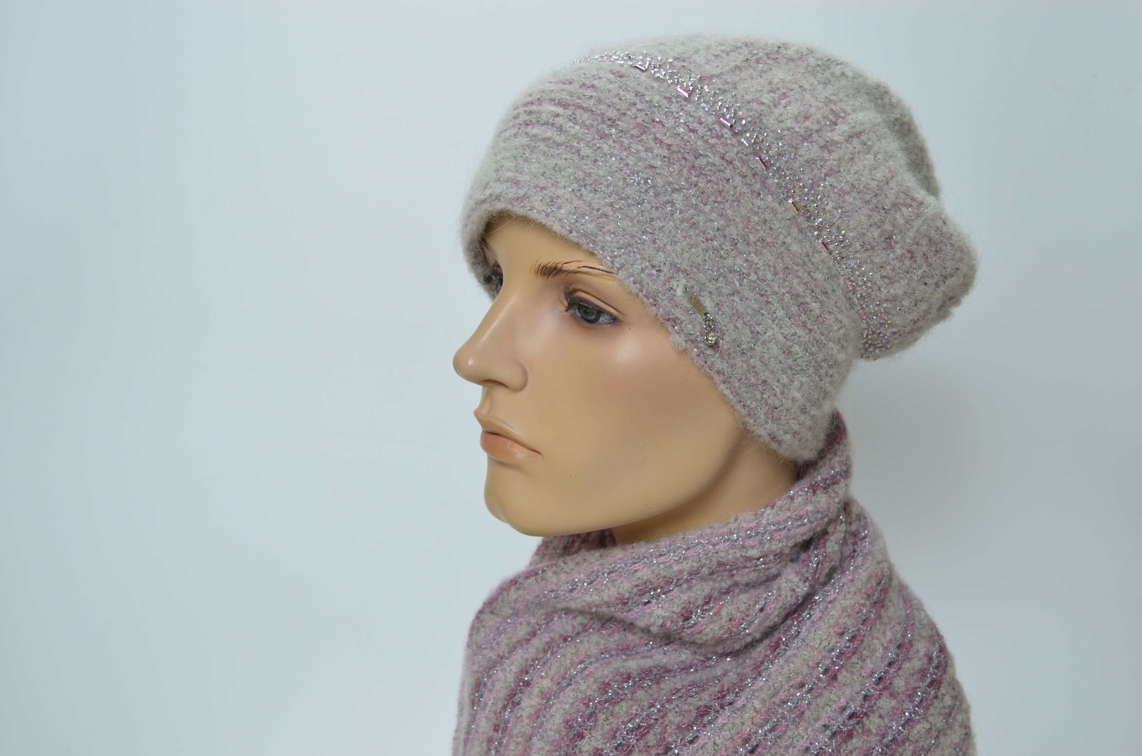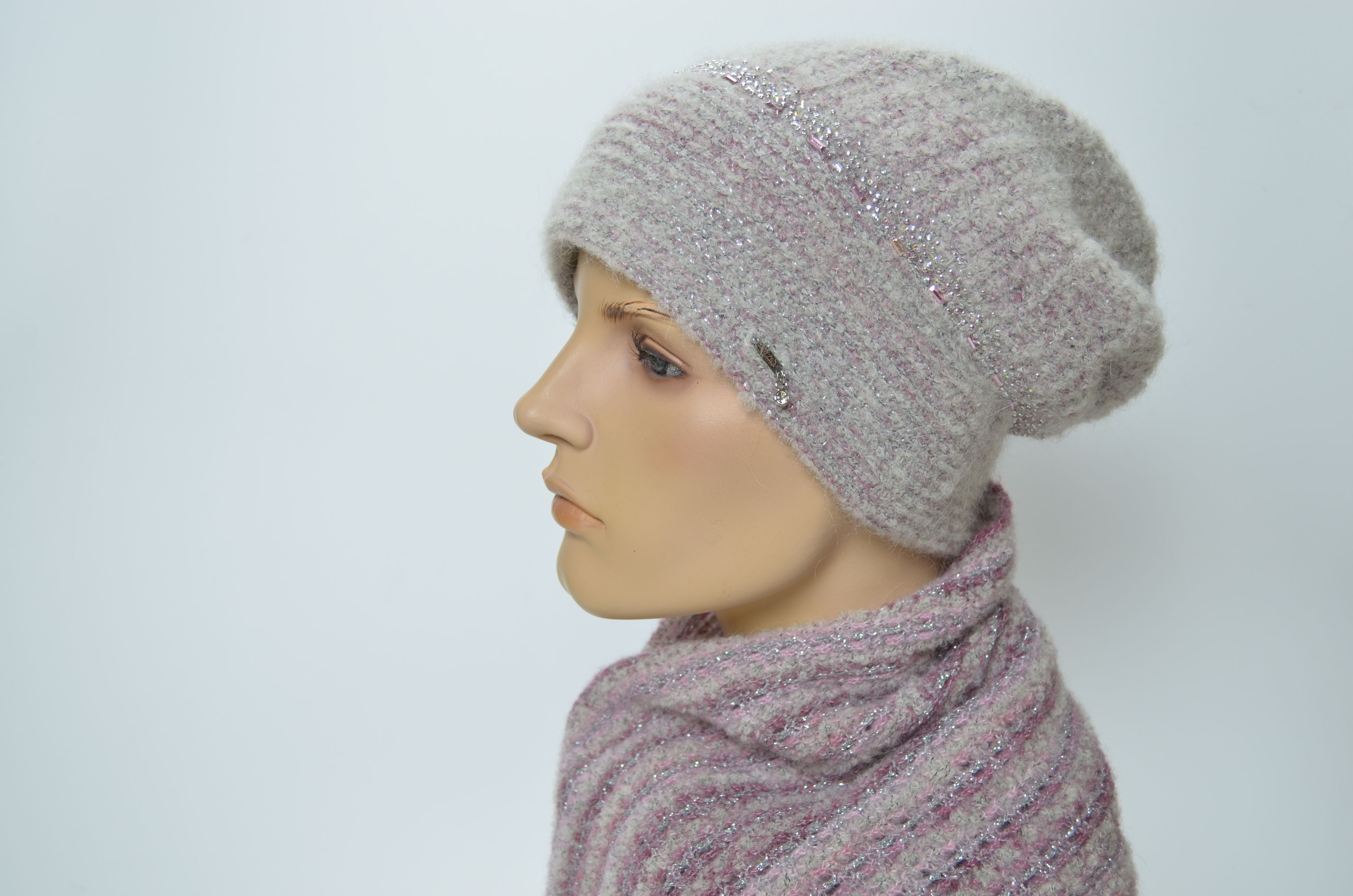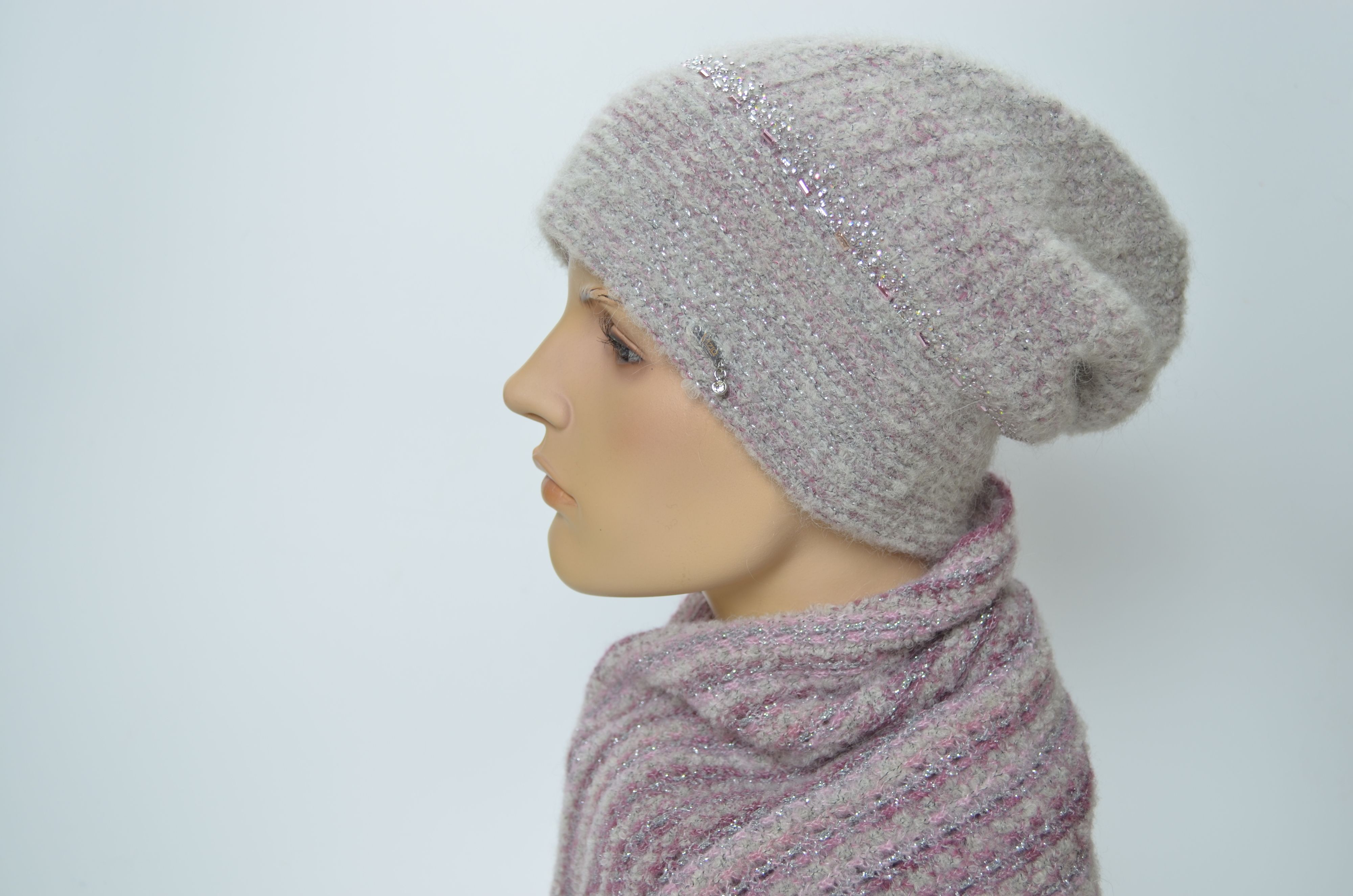 Женский розовый шарф и шапка с пайеткамии стразами вязаный комплект зимний