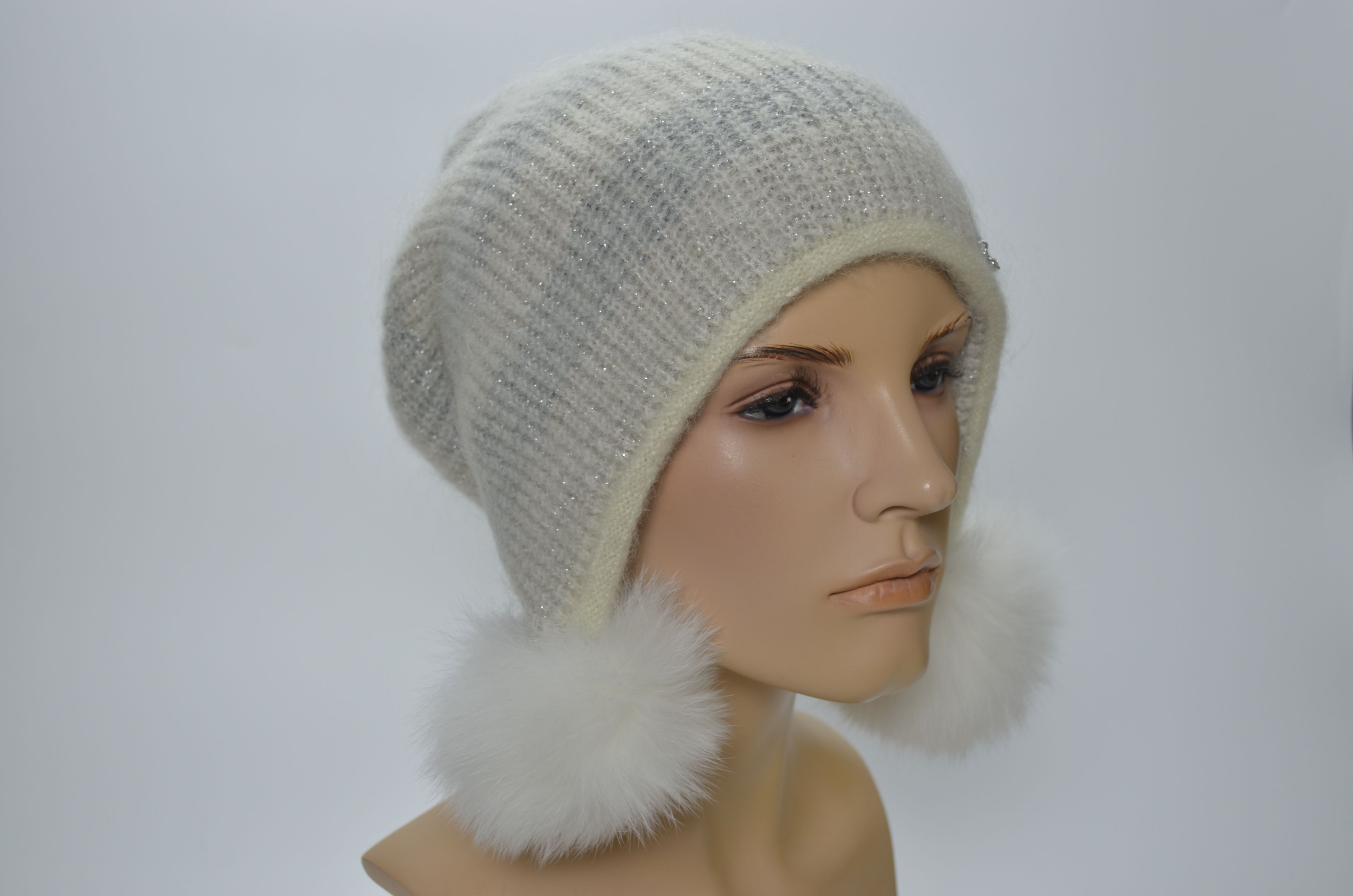 Вязаная белая шапка ушанка мохеровая Vizio Италия 1444 PP 66 со съемными помпонами из коллекции итальянских беретов и шапок Вицио зима 2024 - 2025 бренда женских головных уборов Визио Vizio Collezione