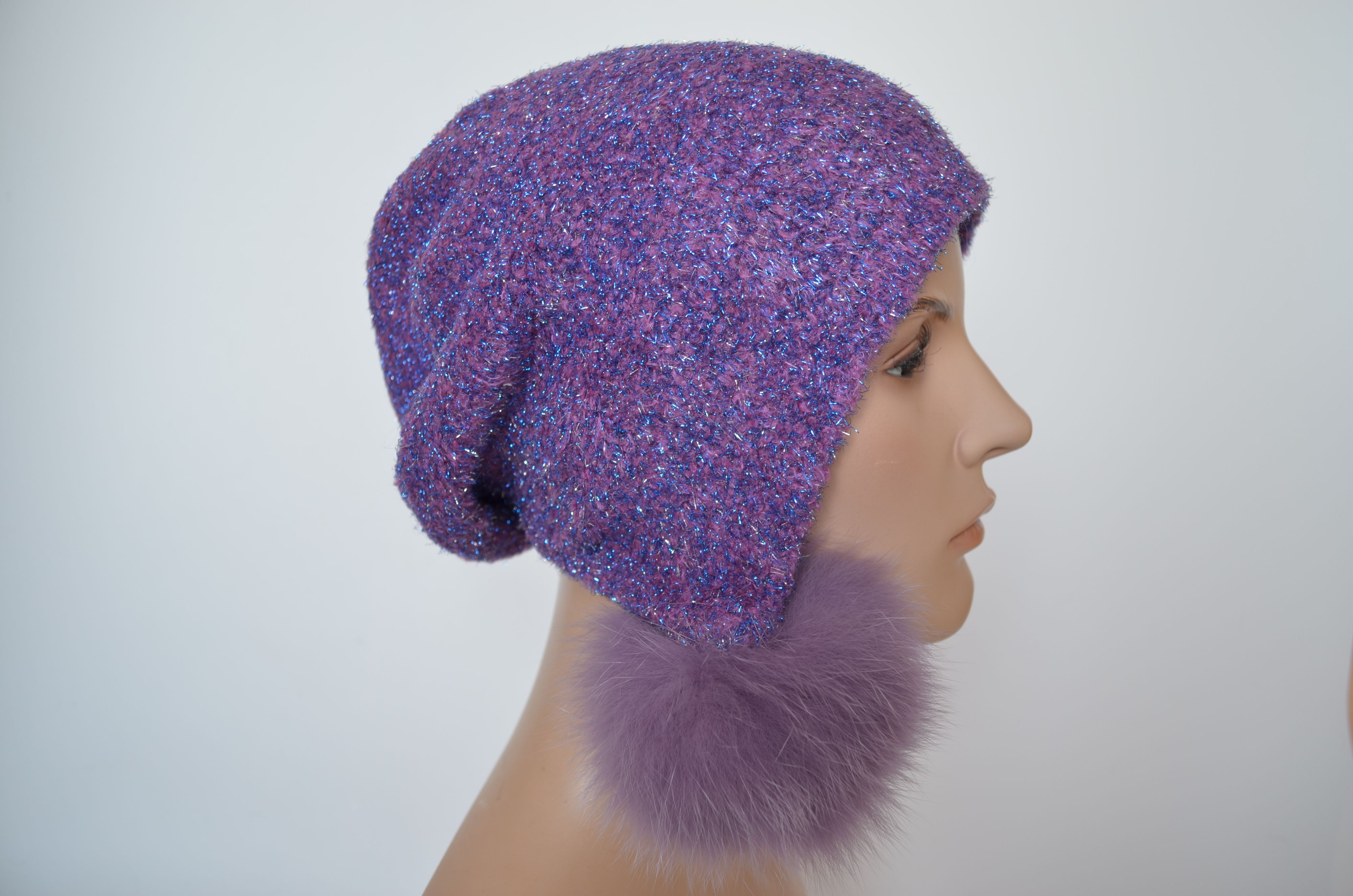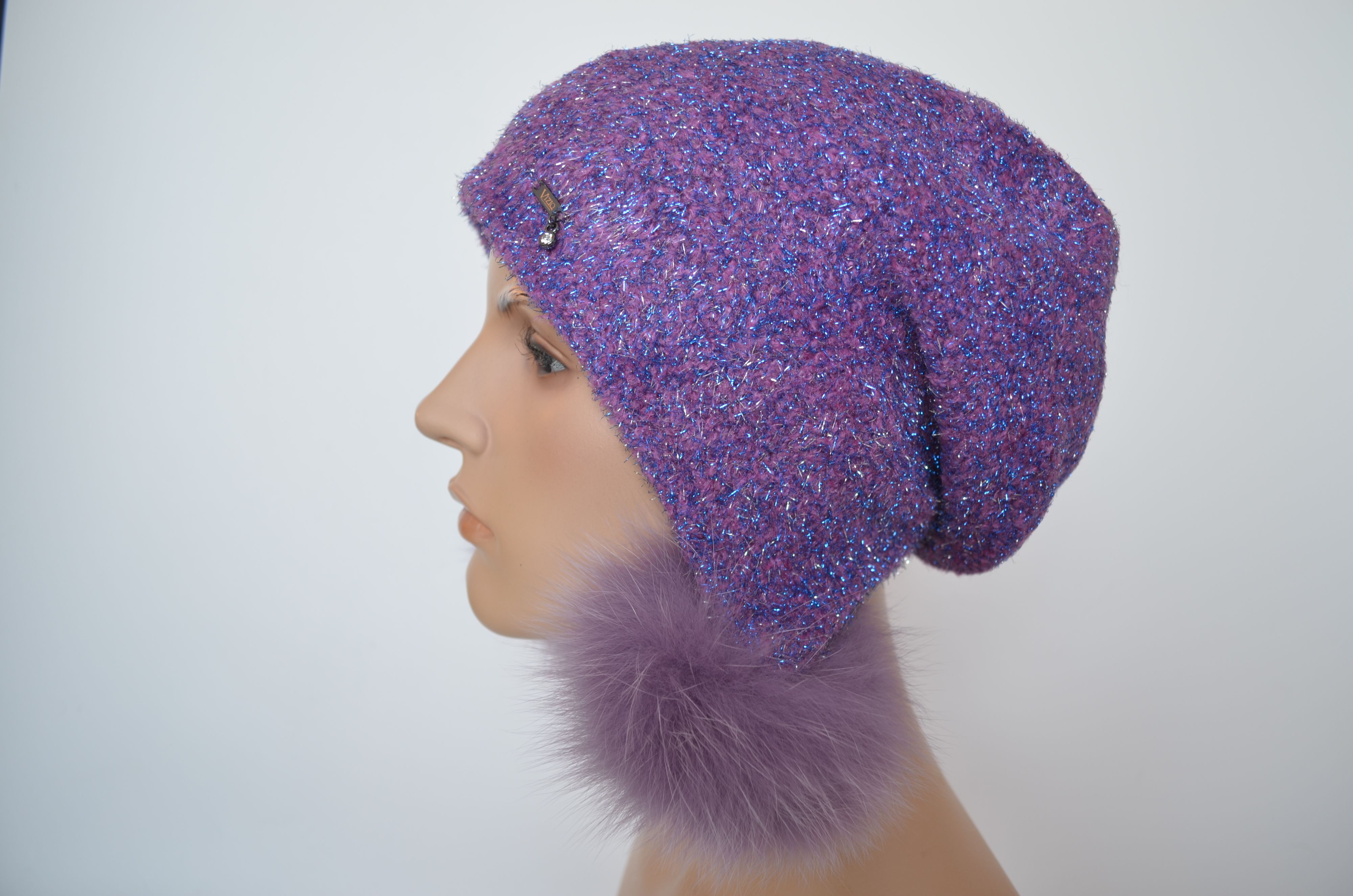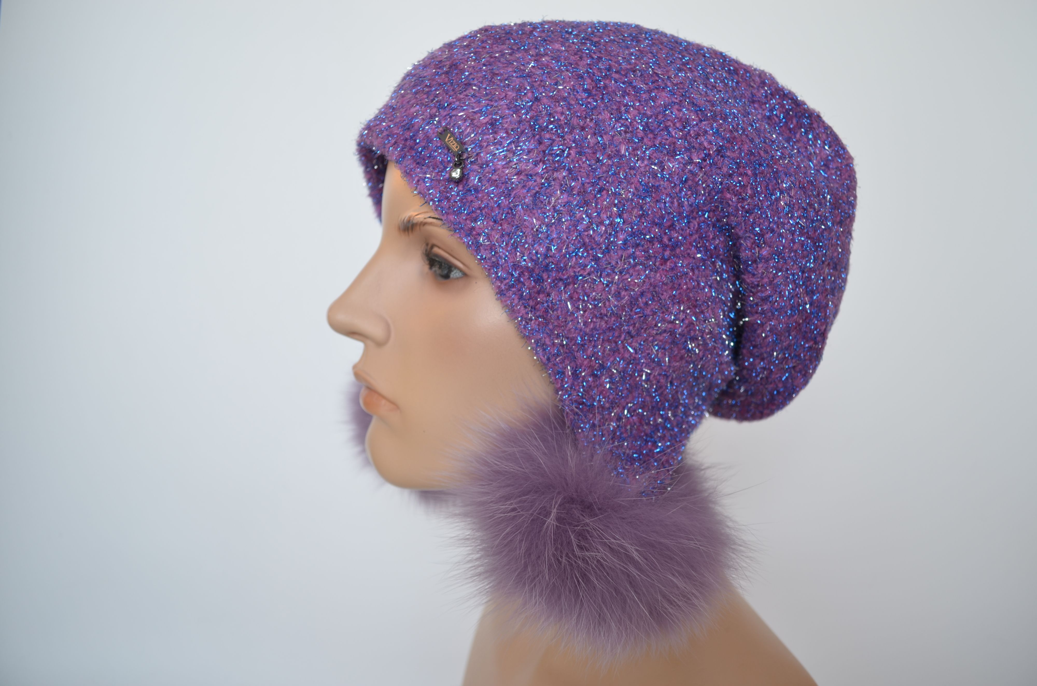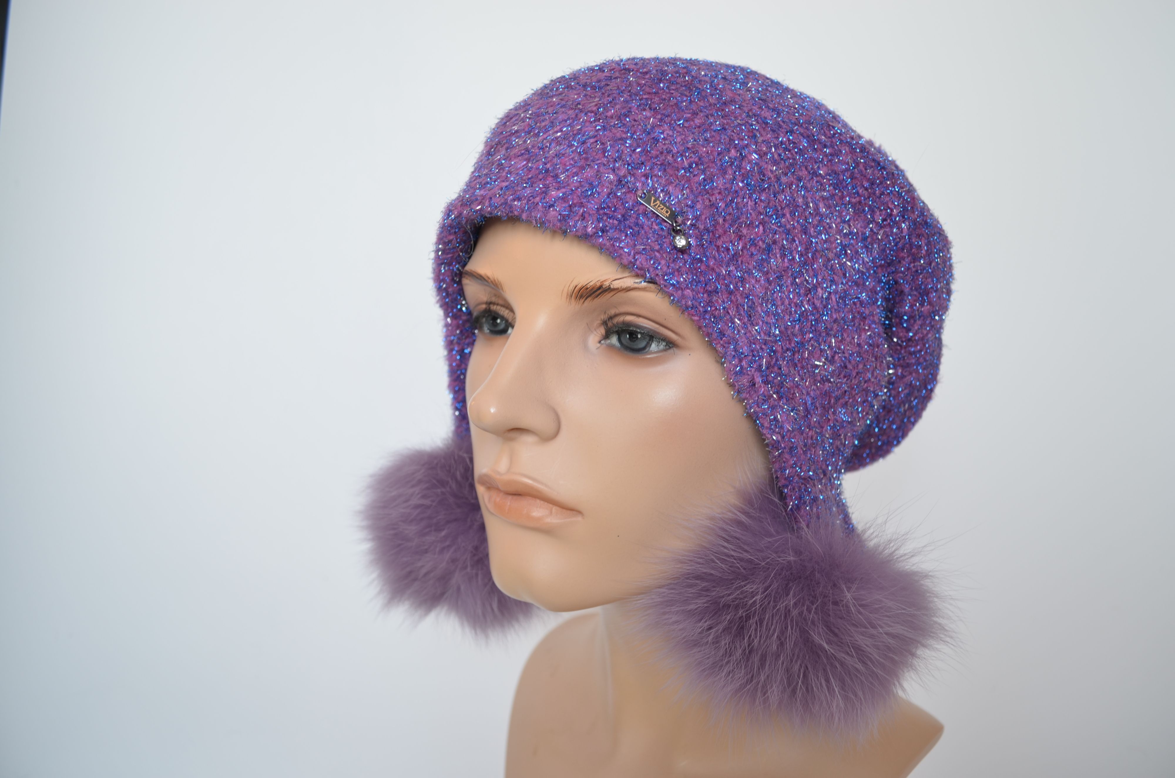 Вязаная шапка ушанка цвета фуксия с помпонами и блестками женская Vizio Италия 1627 коллекция вязаных шапок ушанок Италии для женщин