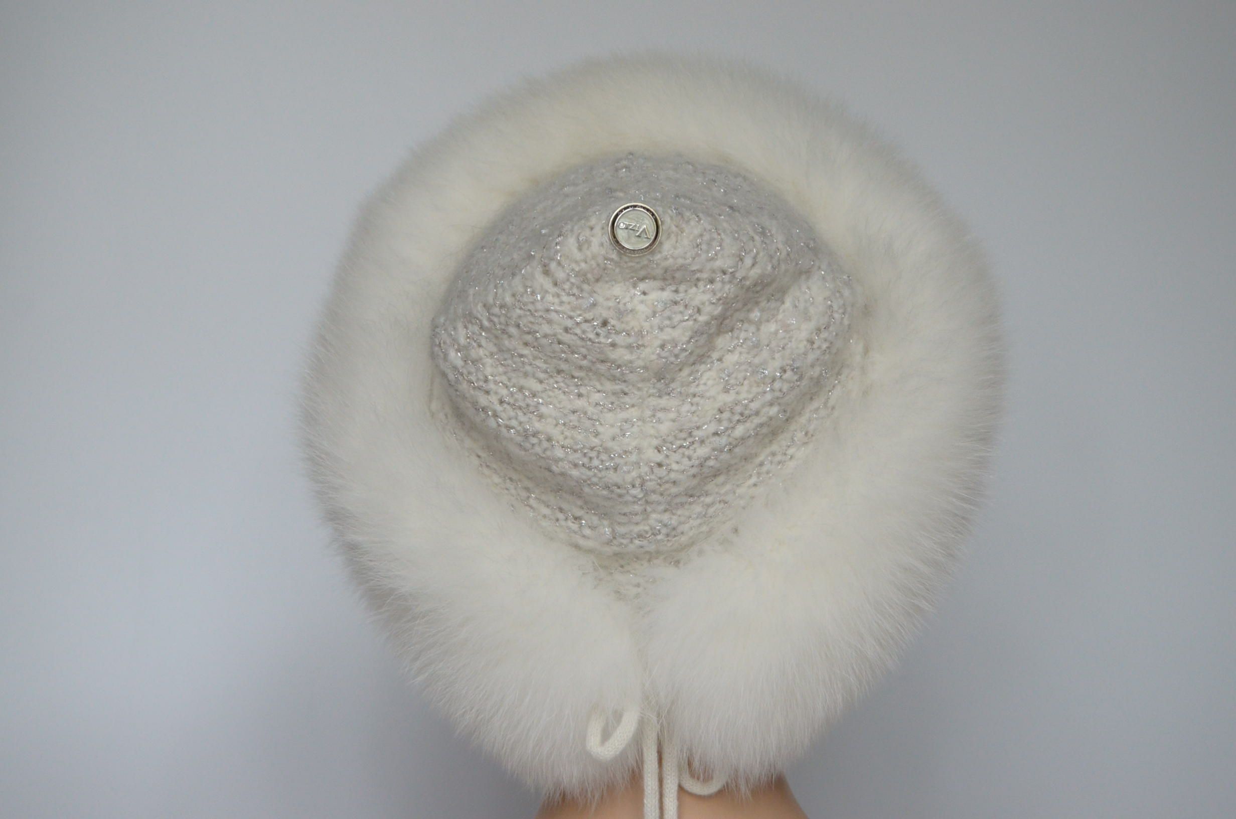 Вязаная белая шапка с меховой отделкой мехом песца Vizio Италия 1024 CCP V купить в интернет магазине стильных головных уборов для женщин Vizio Collezione