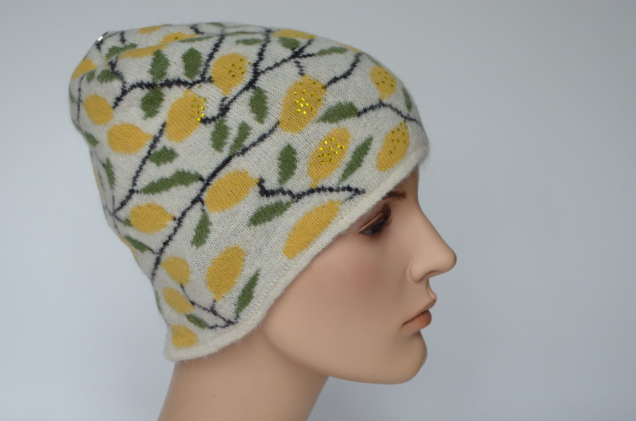 Вязаная шапка с лимонами женская коллекция модных беретов и шапок 2024 с лимонным принтом