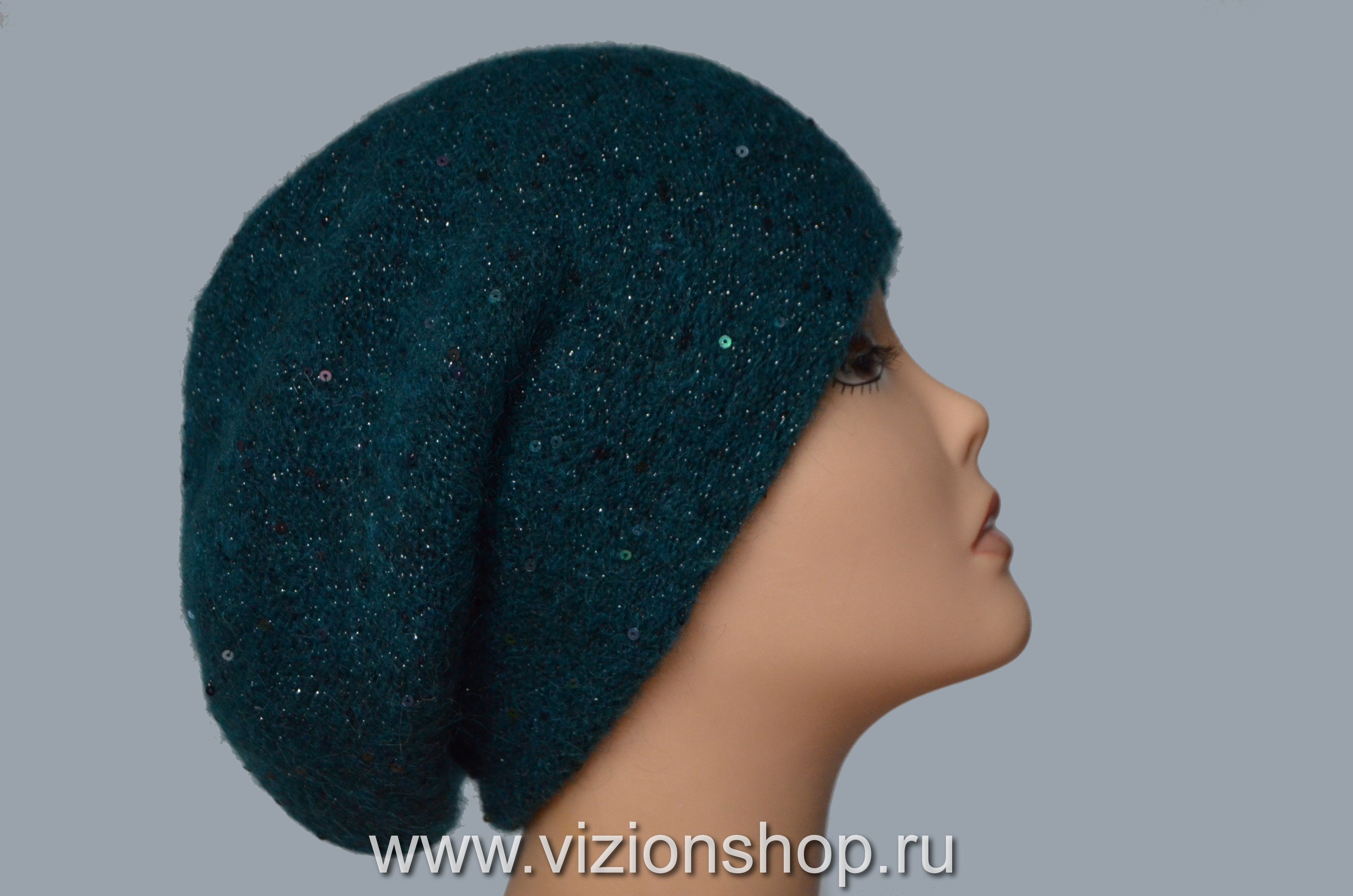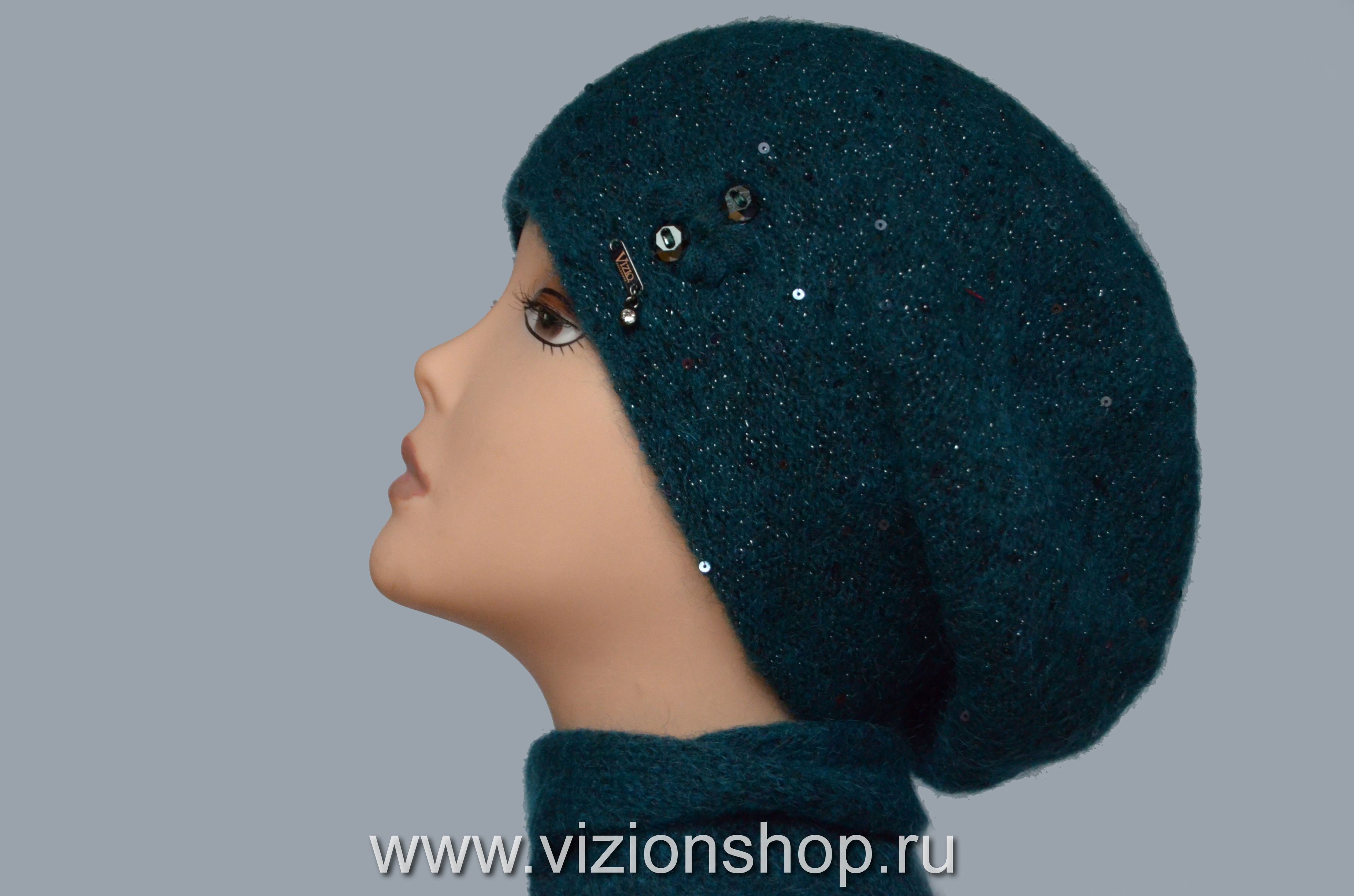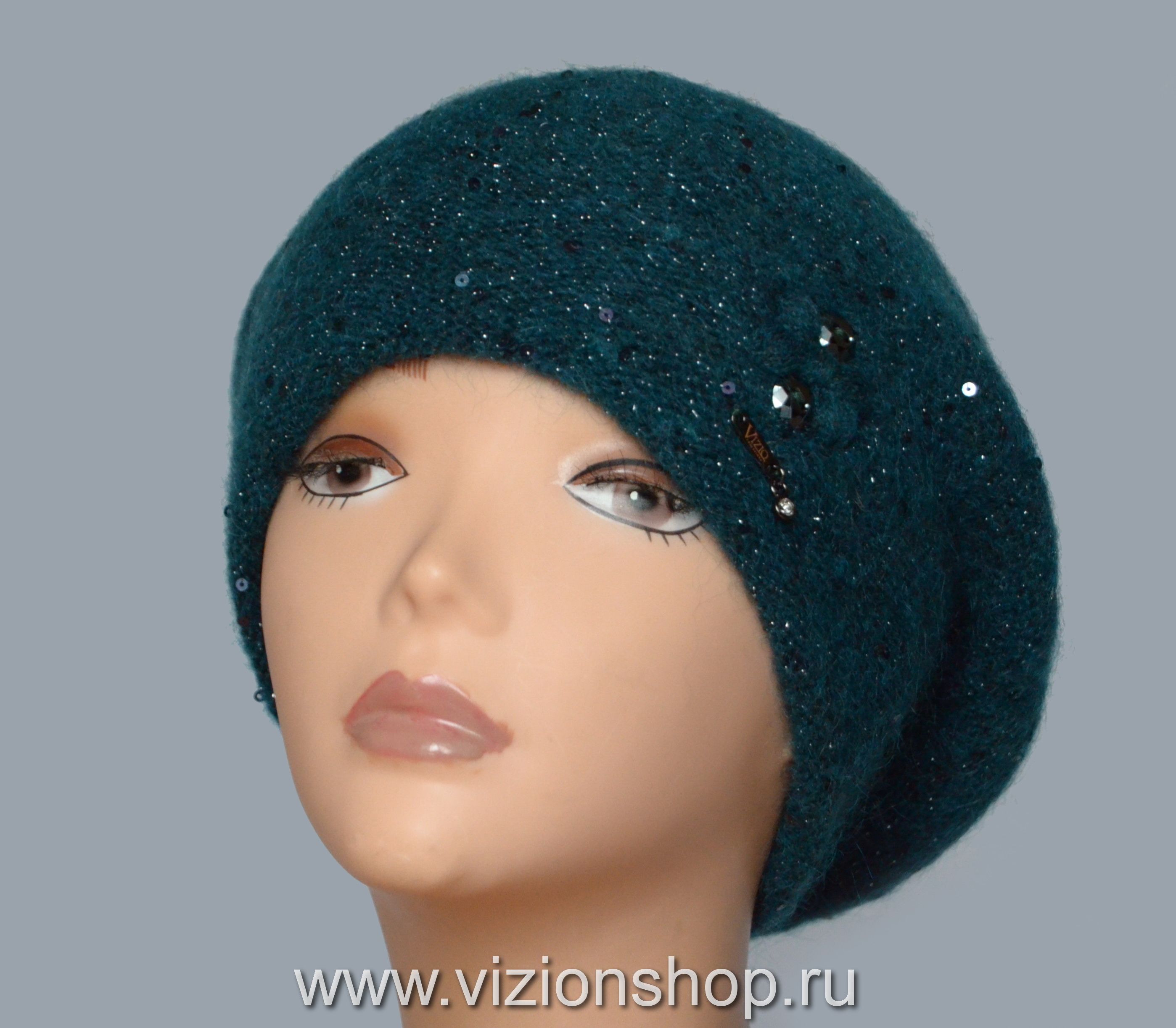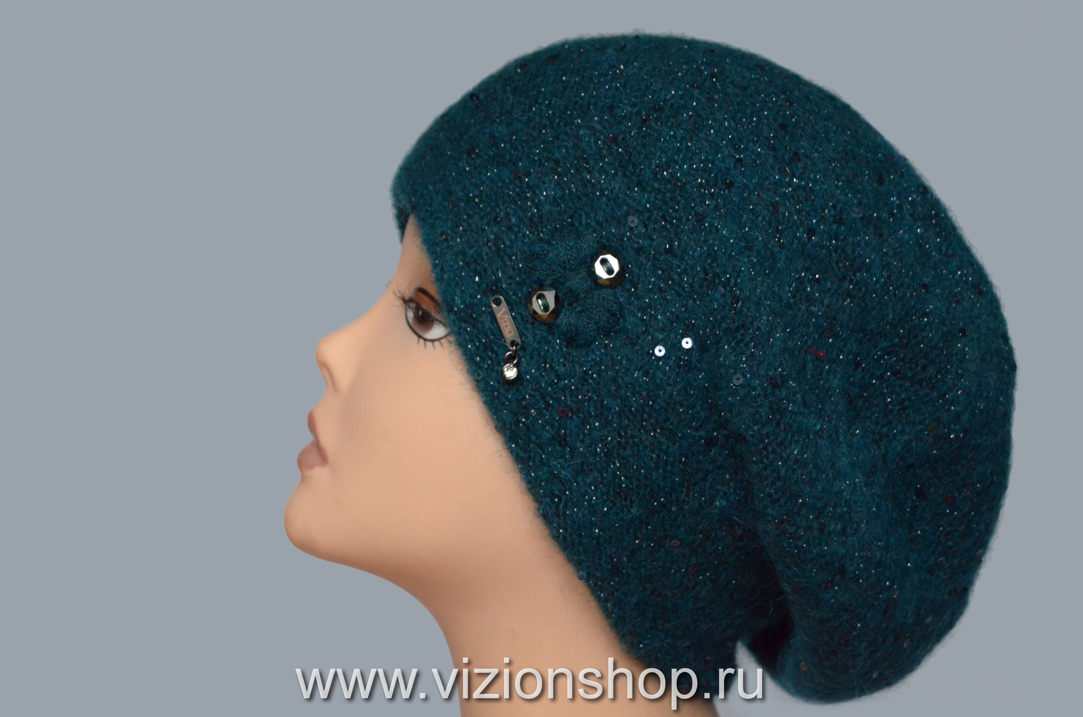 Берет вязаный изумрудного цвета женский с пайетками Визио 6457 Италия от производителя вязаных женских беретов Vizio Collezione в интернет магазине головных уборов в Москве