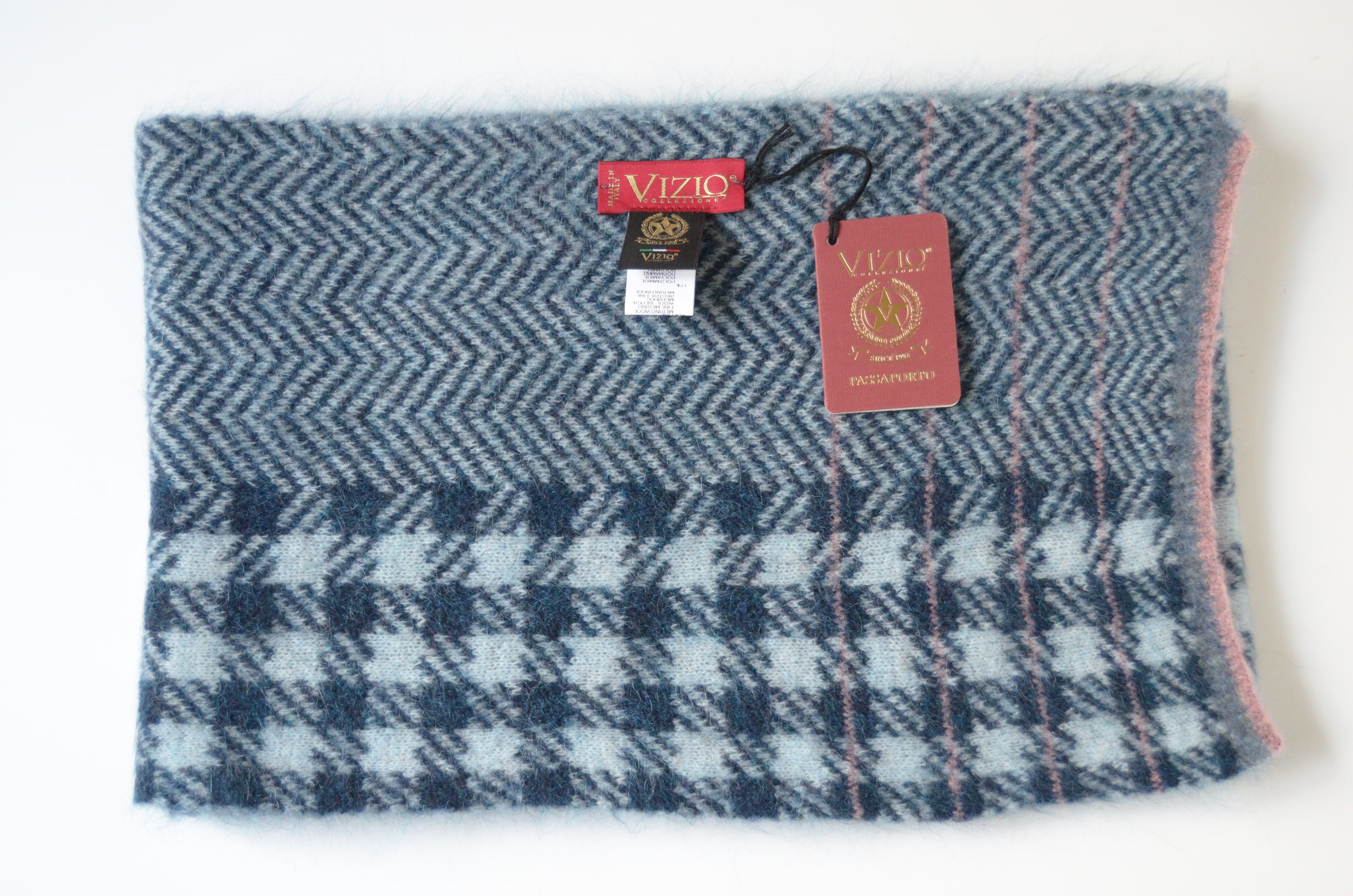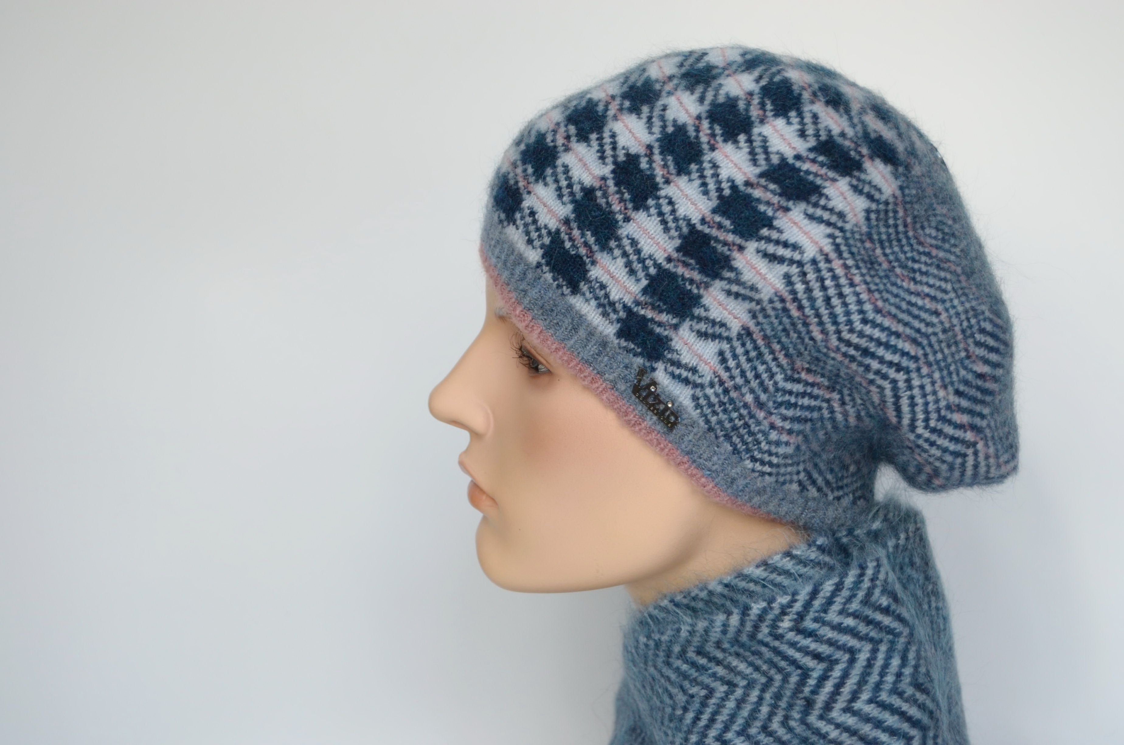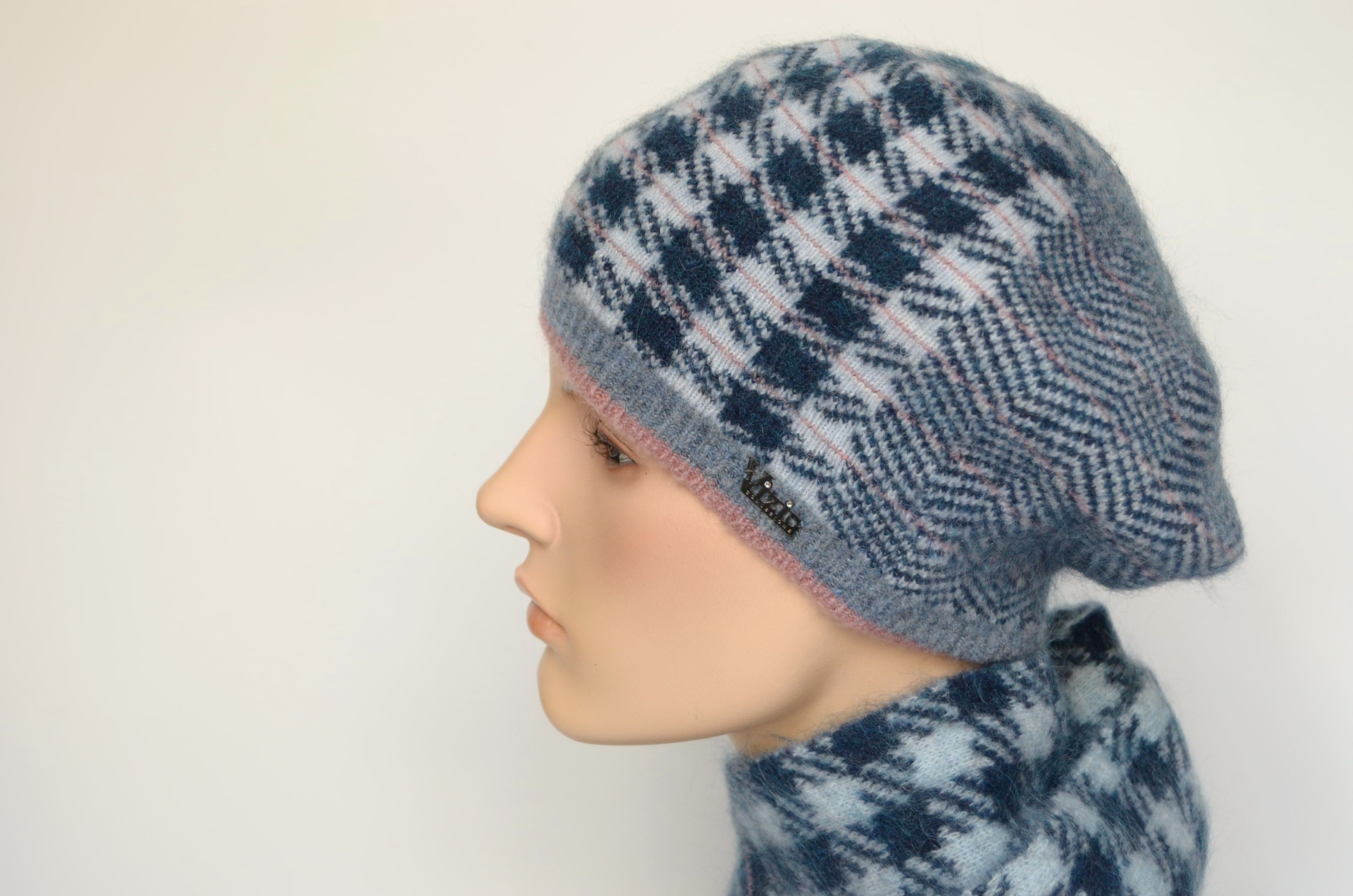 Вязаный берет в клетку голубого цвета для женщин Vizio Италия 8076 ВО одинарный теплый зимний берет вязаный из мохера и шерсти мериноса. Новая коллекция зимних головных уборов для женщин зима 2022- 2023 итальянского бренда Vizio Collezione