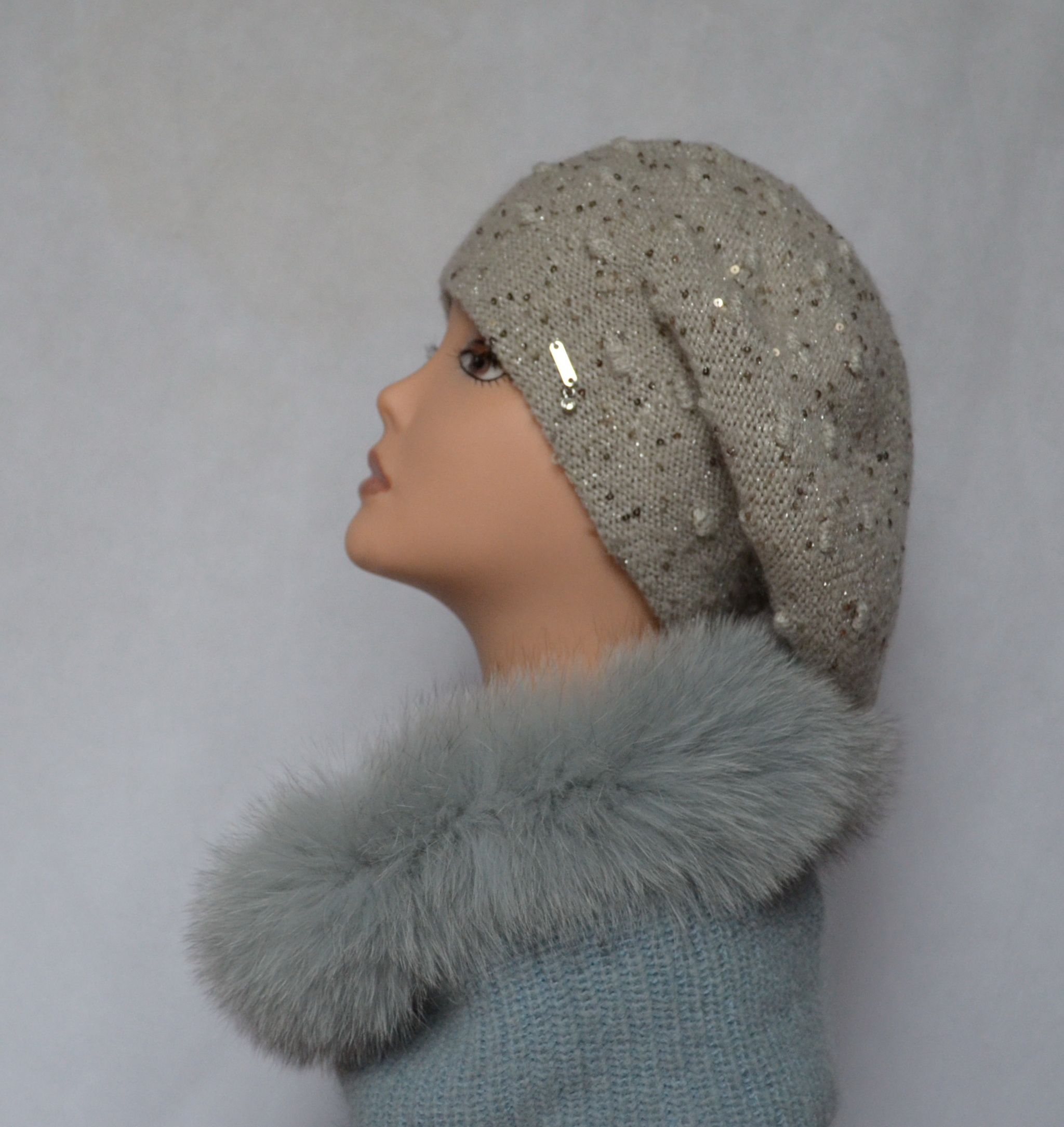 Вязаный голубой женский шарф труба Vizio Италия Quebec SZP итальянский шарф с меховой отделкой из коллекции взаных шарфов зима 2020 купить в интернет магазине головных уборов Италии в Москве или с доставкой по России