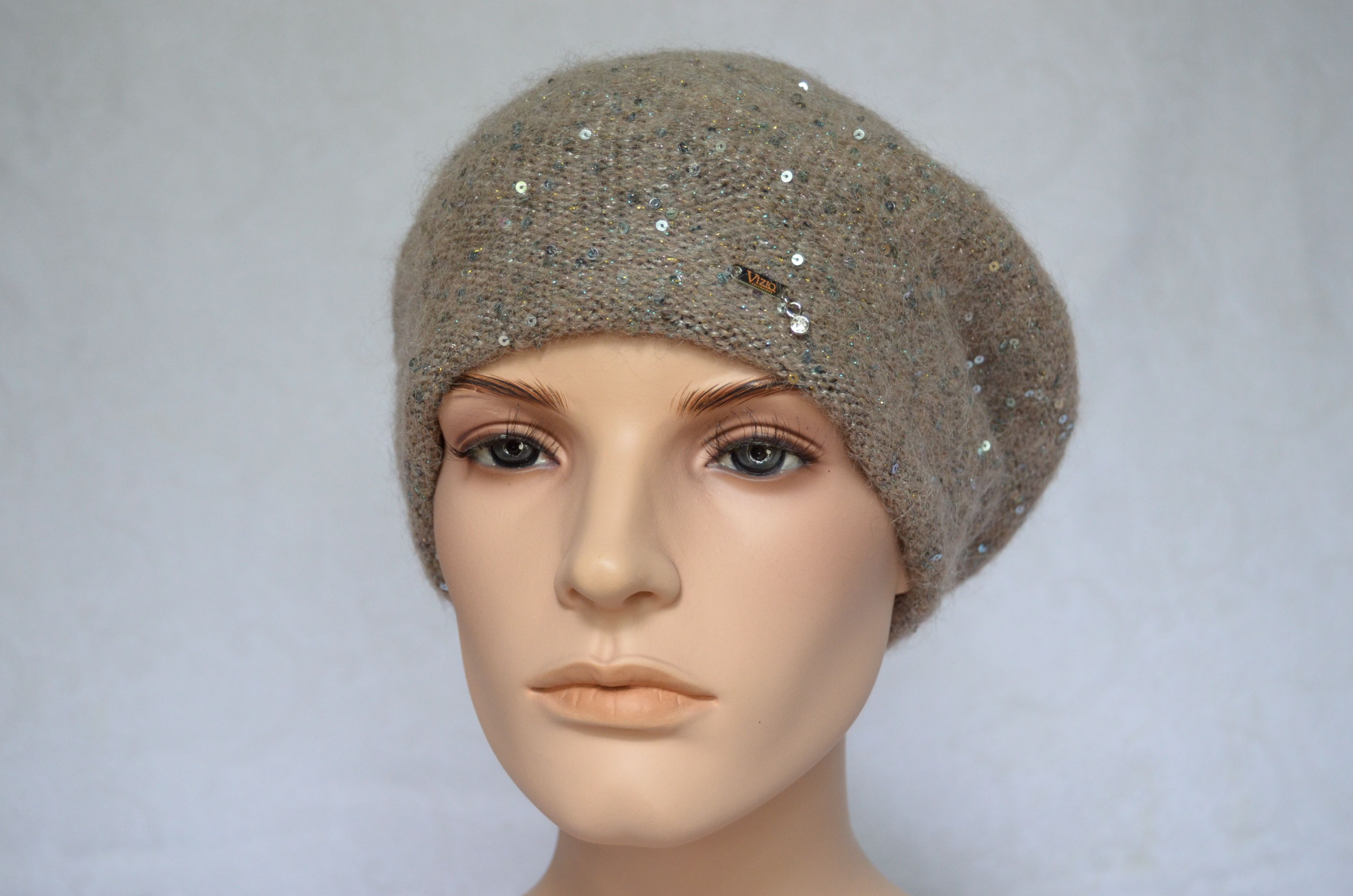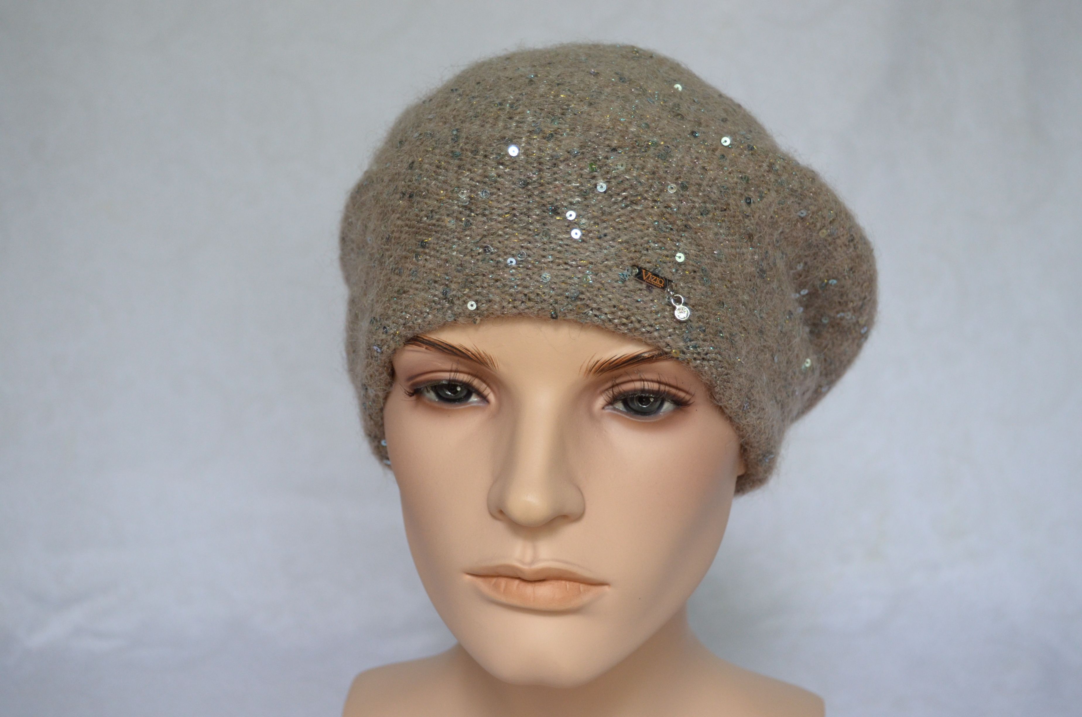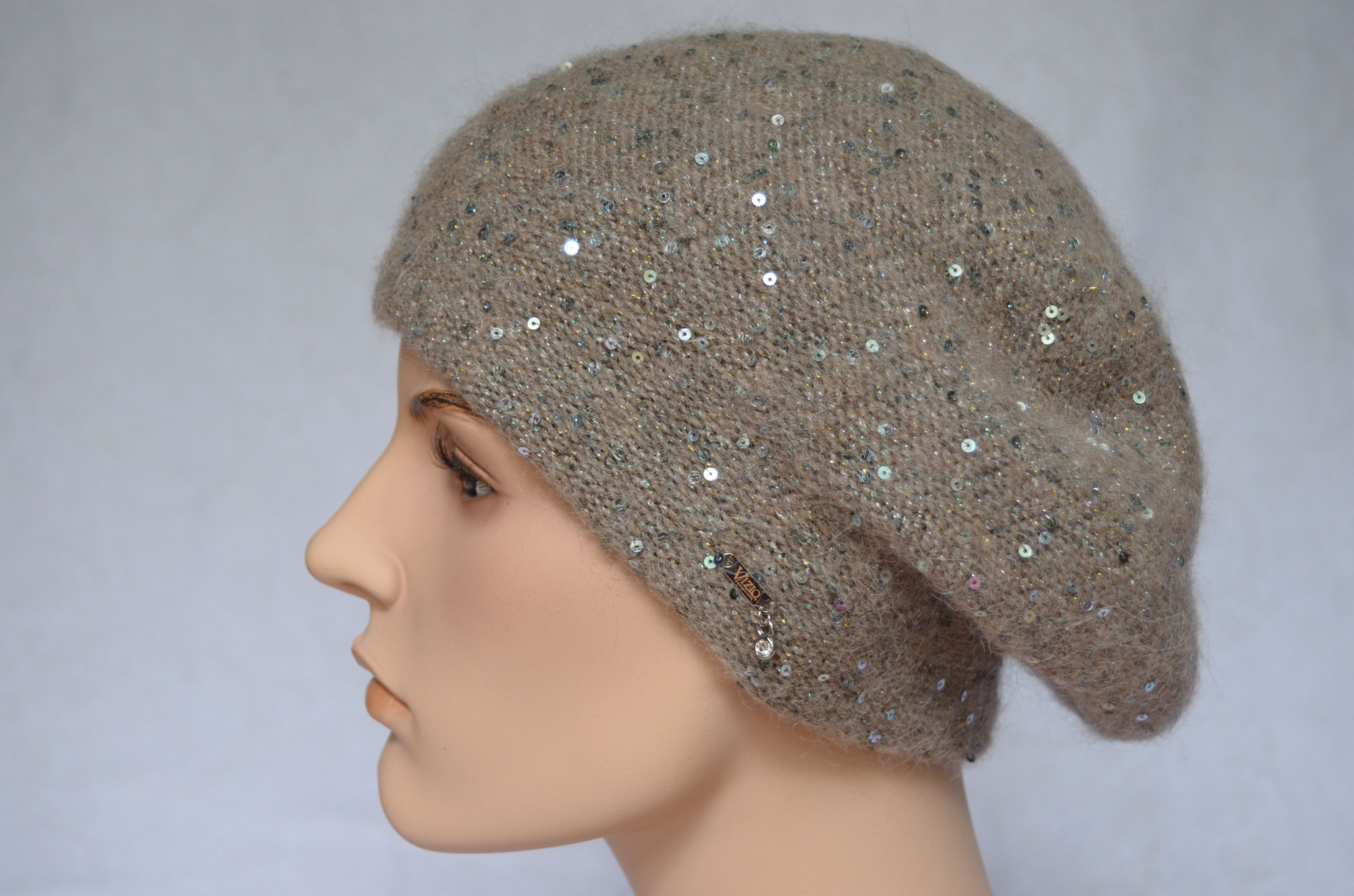 Вязаный ореховый берет с пайетками зимний Vizio Италия 6917 новая коллекция итальянских головных уборов с пайетками осень - зима 2021 - 2022 купить в интернет магазине стильных женских шапок и беретов для женщин