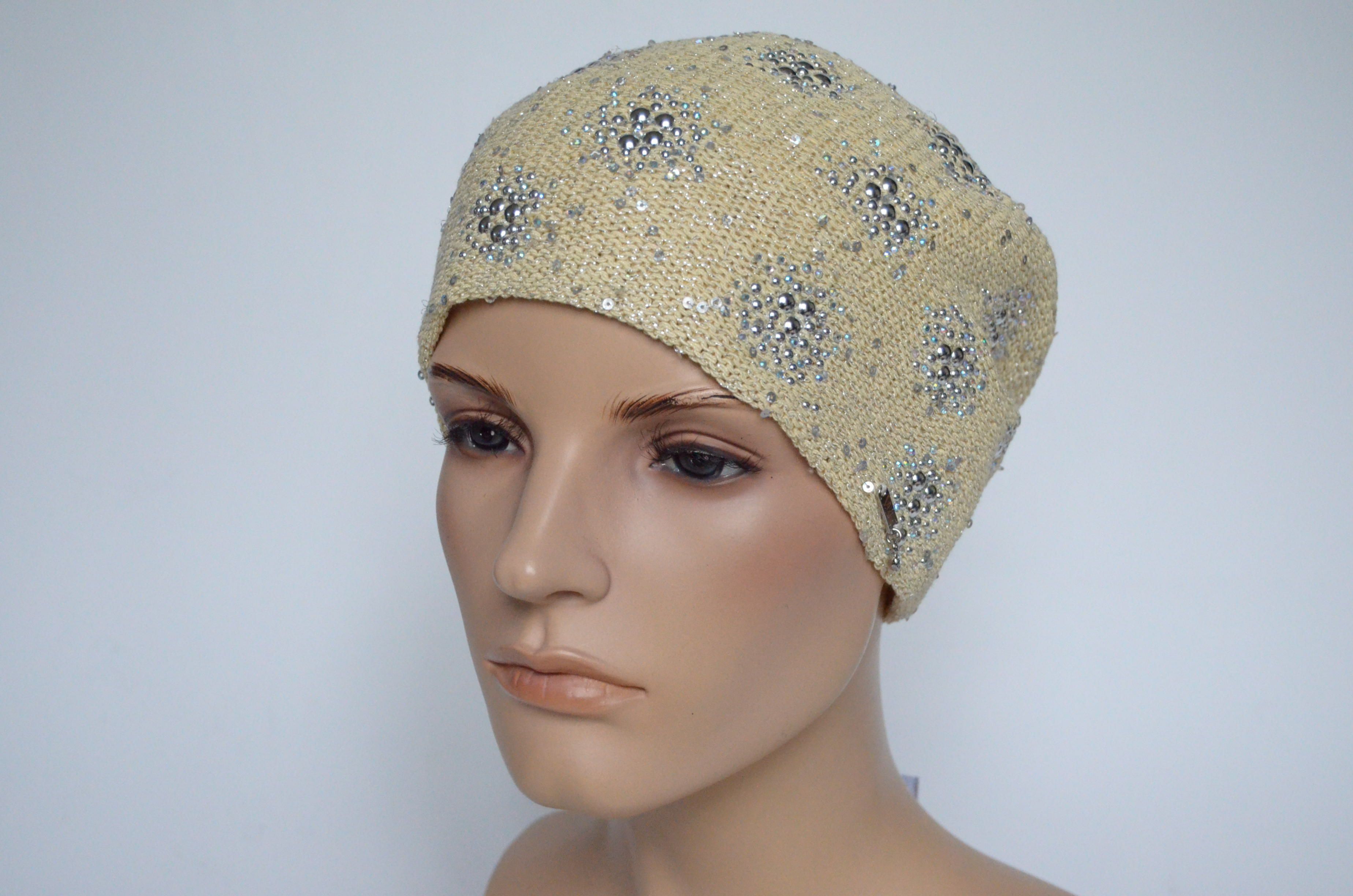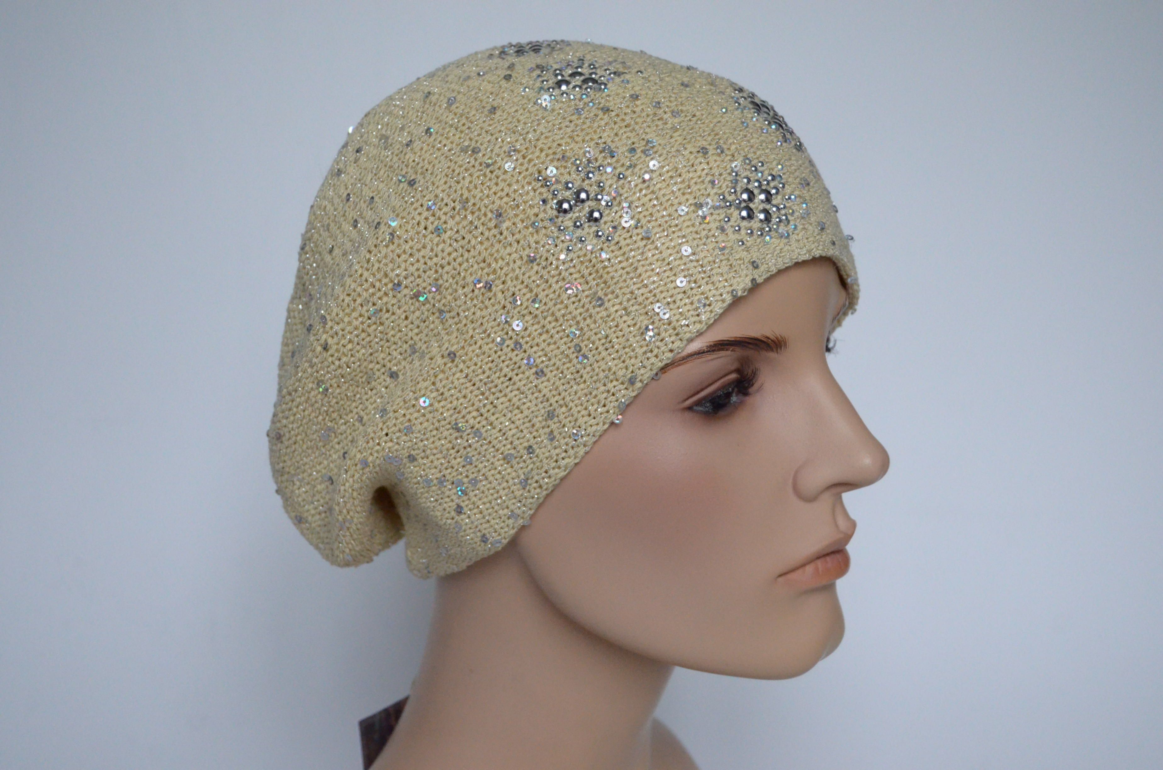 Женский вязаный демисезонный берет желтого цвета лето - осень - весна Vizio 6625 с украшениями купить из коллекции весенних и осенних головных уборов для женщин Визио с бесплатной доставкой по Москве и России