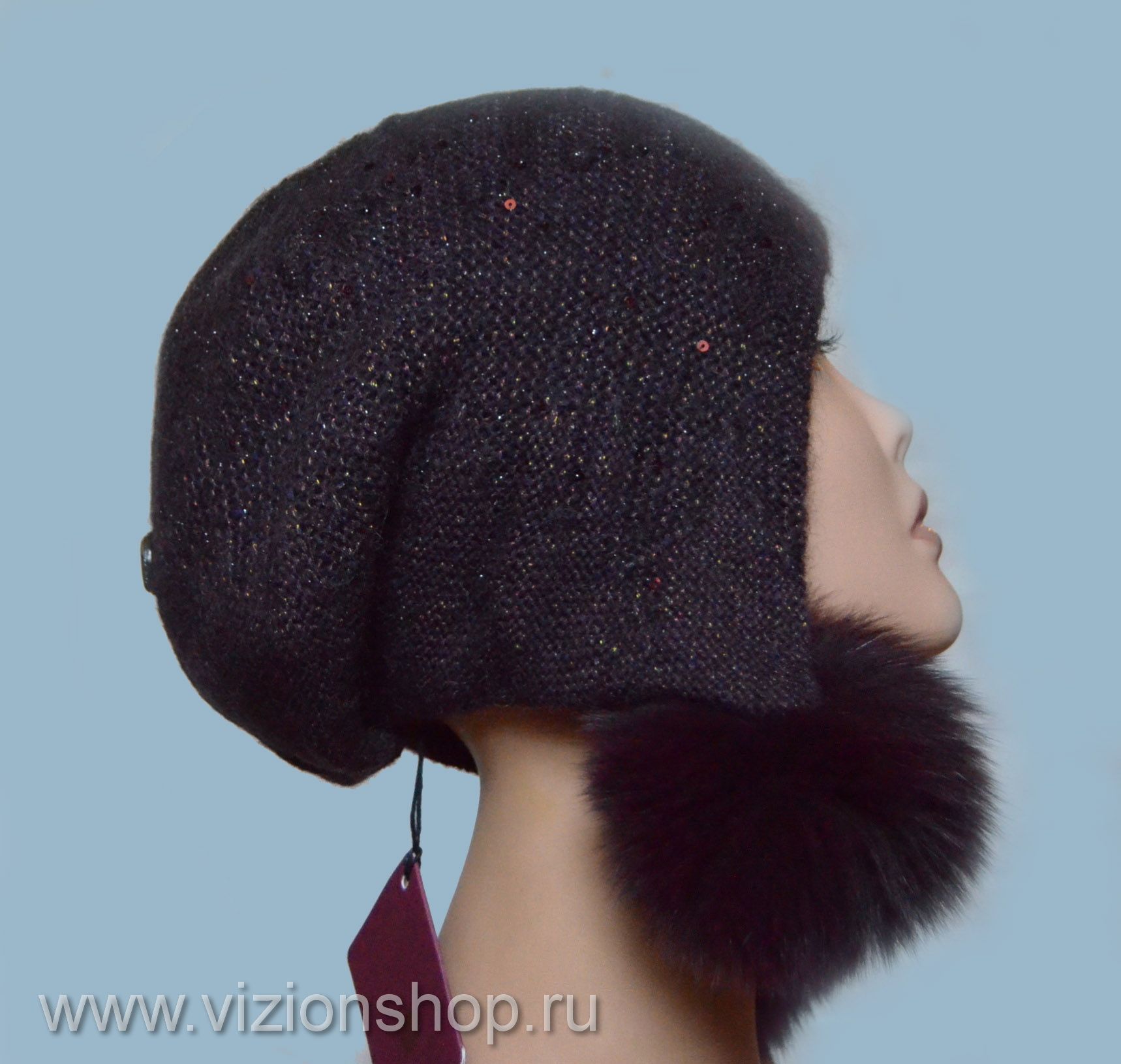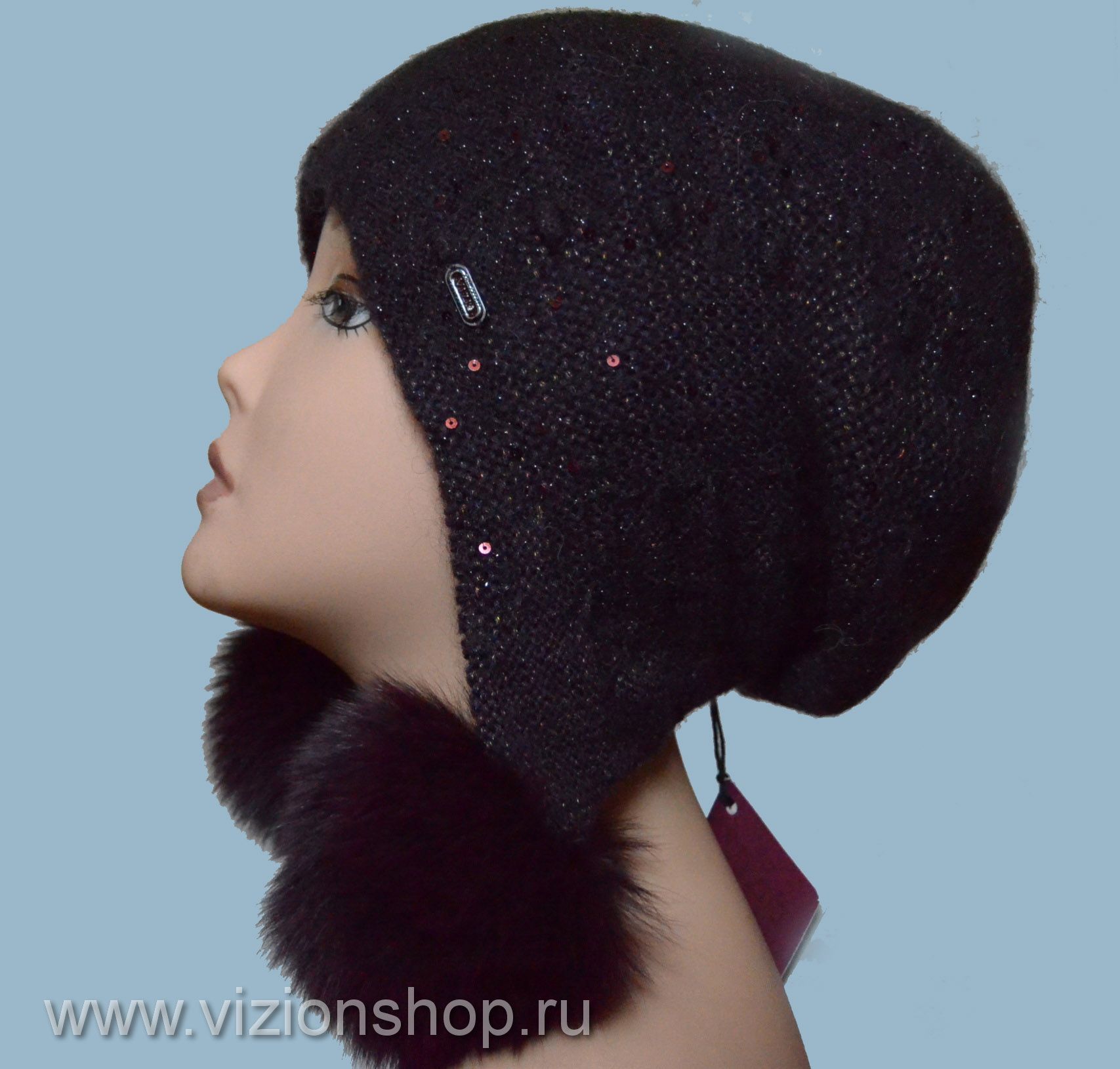 Модная вязаная шапка ушанка с помпонами коллекция зима 2018 - 2019 Vizio Визио 6240 сливовая купить в интернет магазине вязаных шапок для женщин в Москве от производителя итальянских вязаных головных уборов Vizio Collezione
