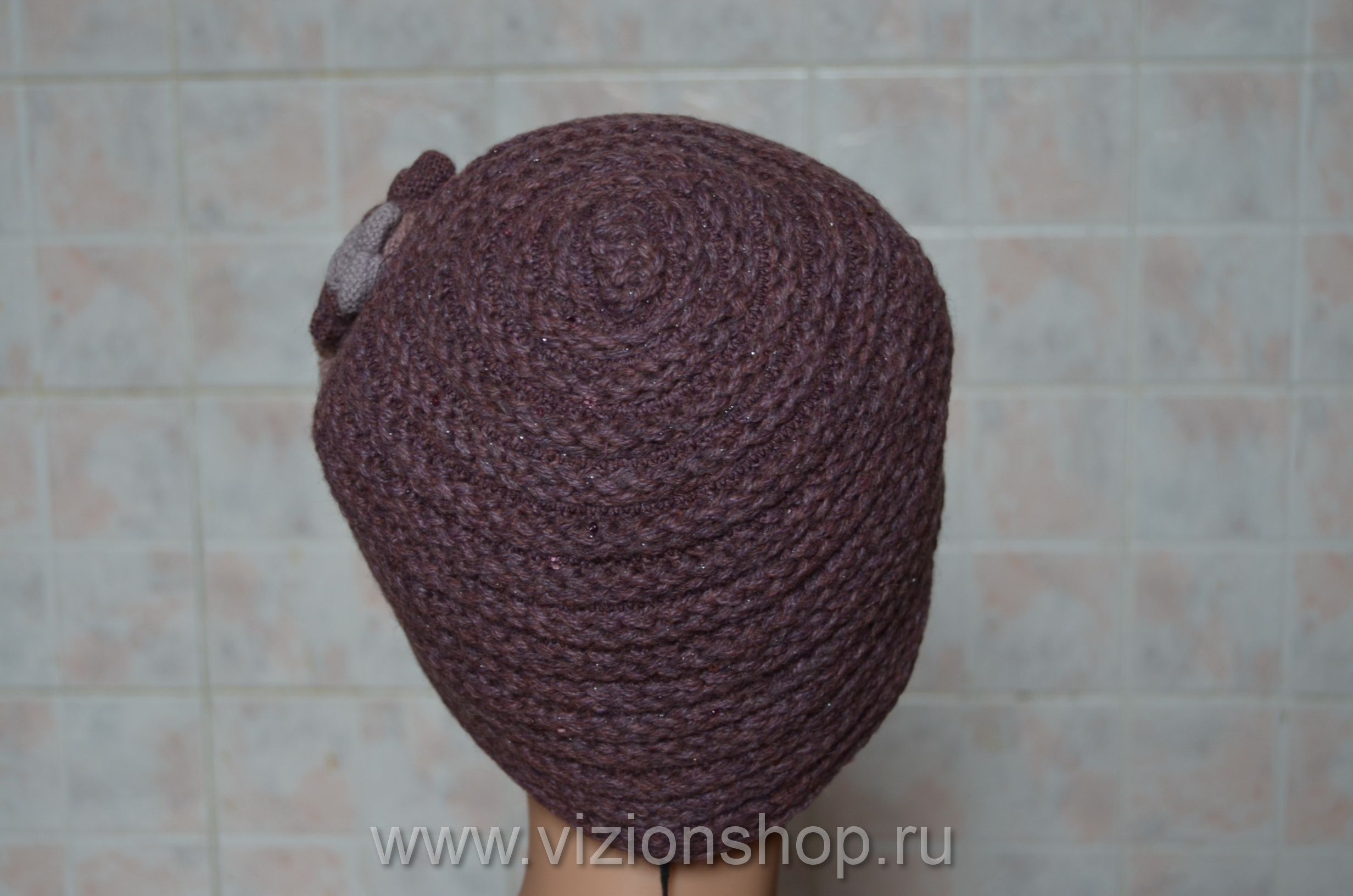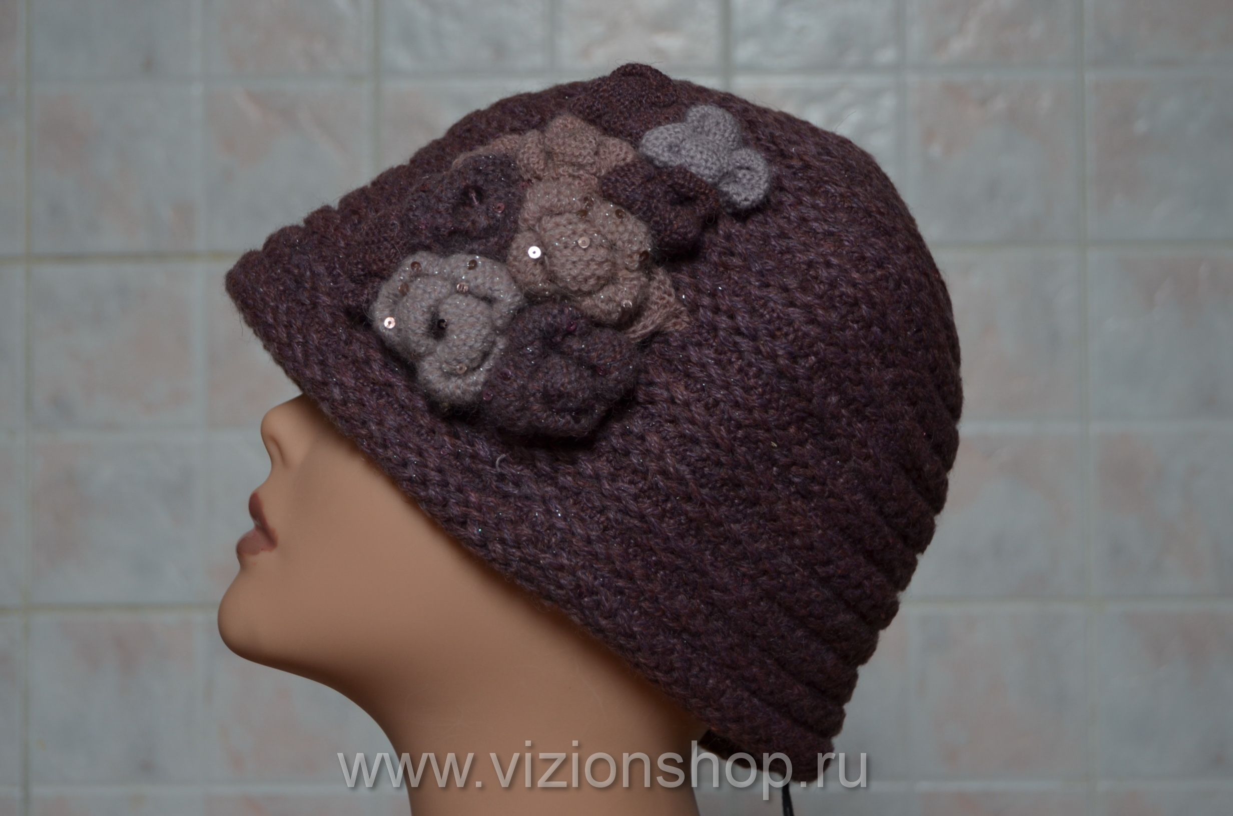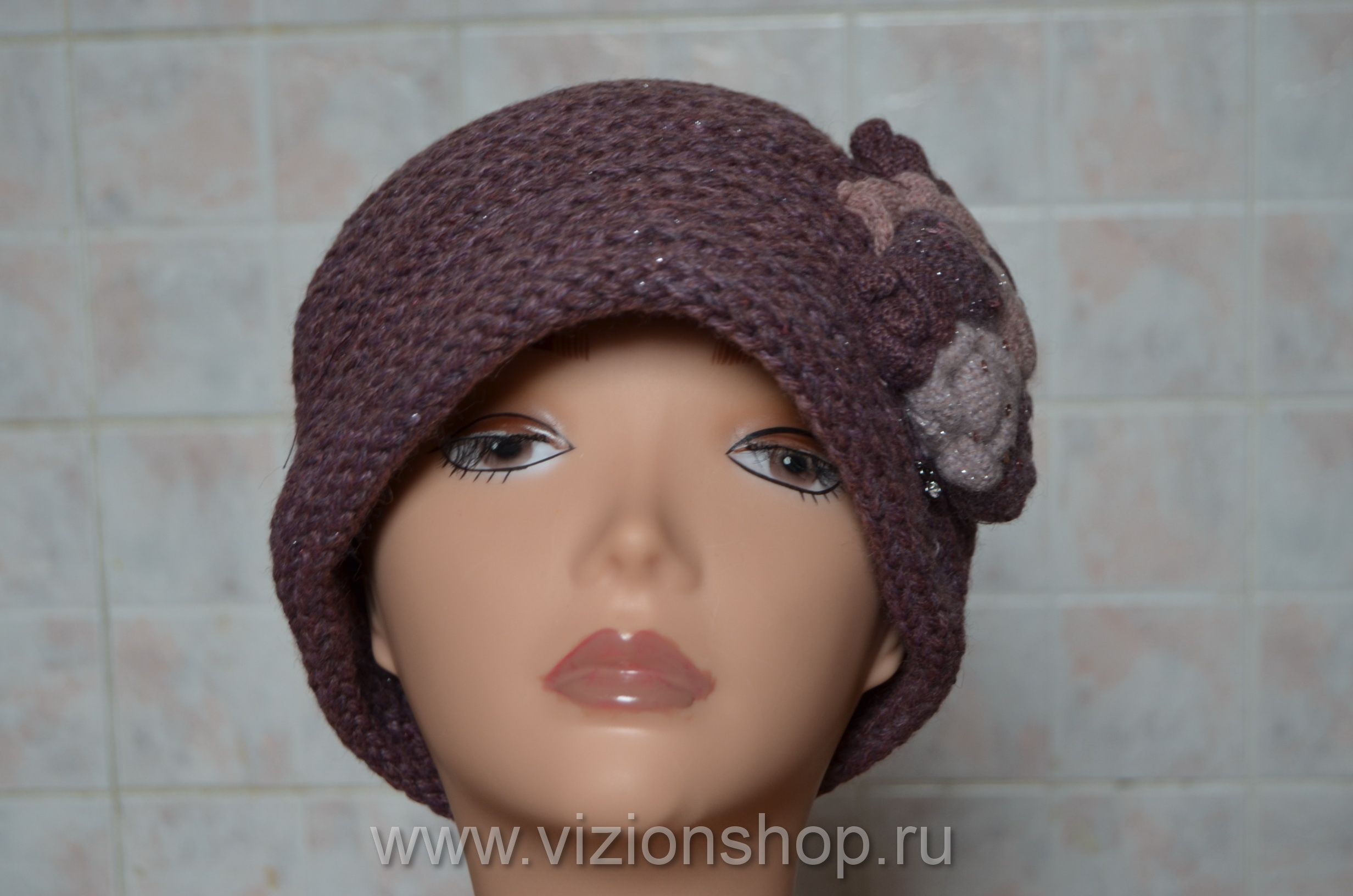 Женская зимняя шляпа Vizio 5394 P вязаная шляпа клош брусничного цвета из мохера и шерсти альпаки с розочками и пайетками из зимней коллекции шляп 2016 от итальянского модельера женских вязаных шляп и шапок Vizio Collezione в интернет магазине женских головных уборов