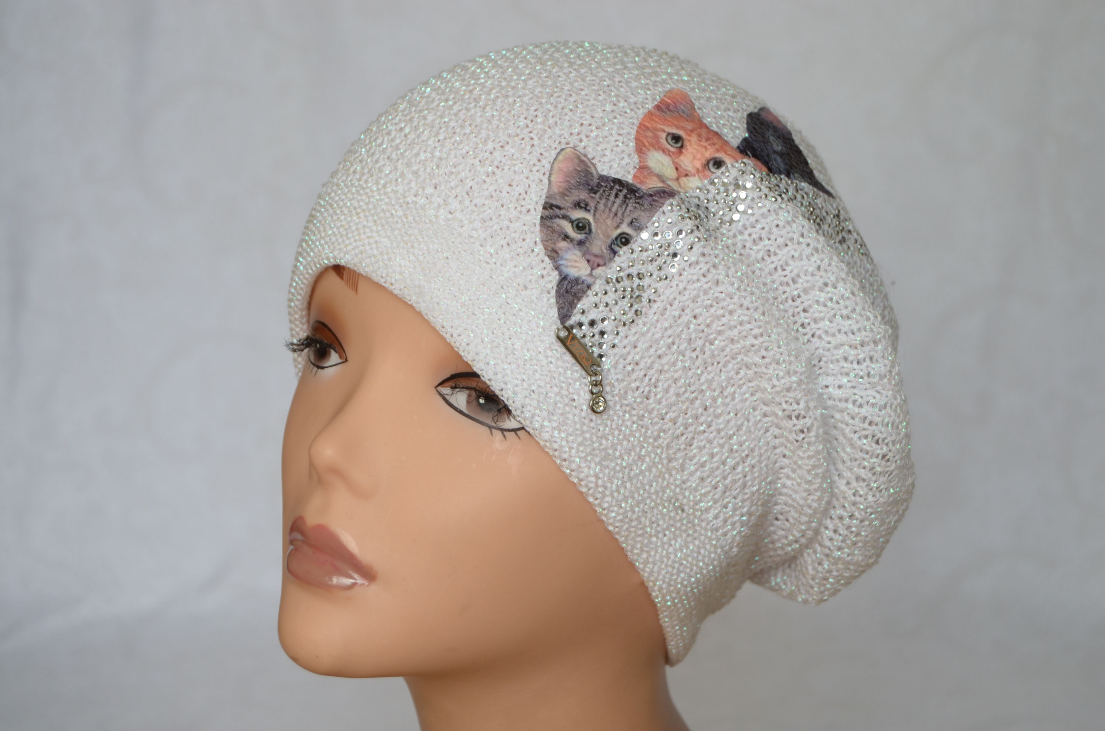 Вязаный женский берет из хлопка Vizio Италия 6307 коллекция хлопковых беретов для женщин итальянского производителя вязаных головных уборов Vizio Collezione. Модный женский берет из хлопка с украшениями в виде кошек