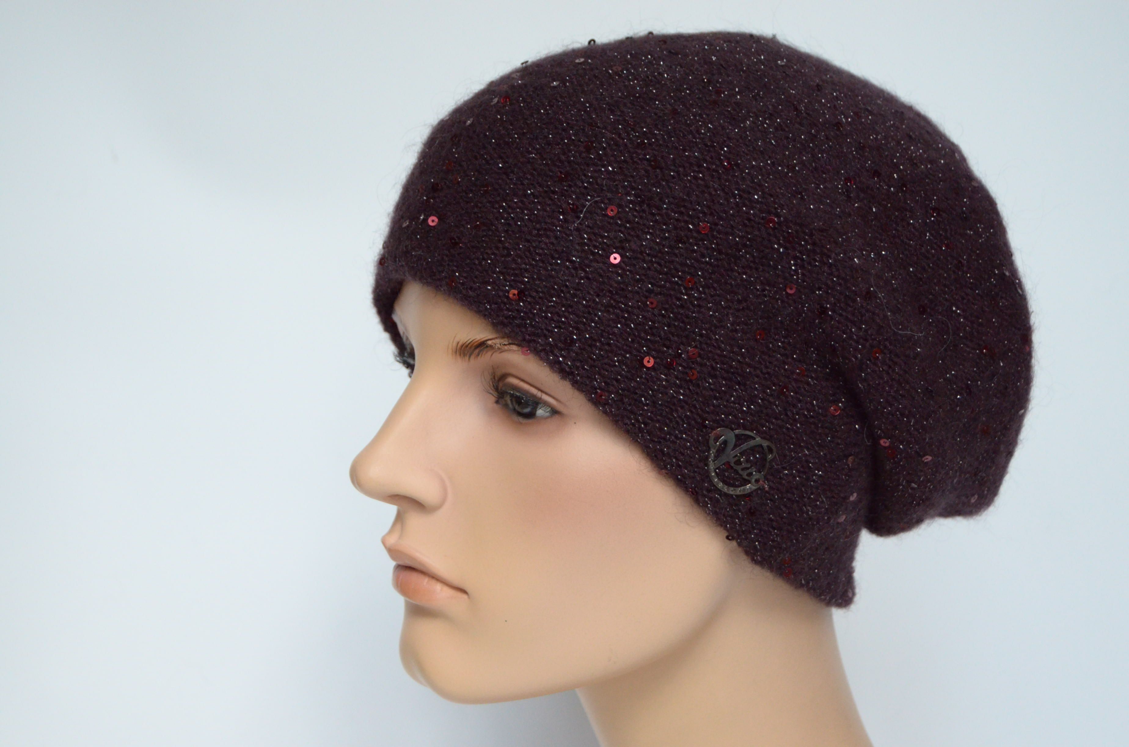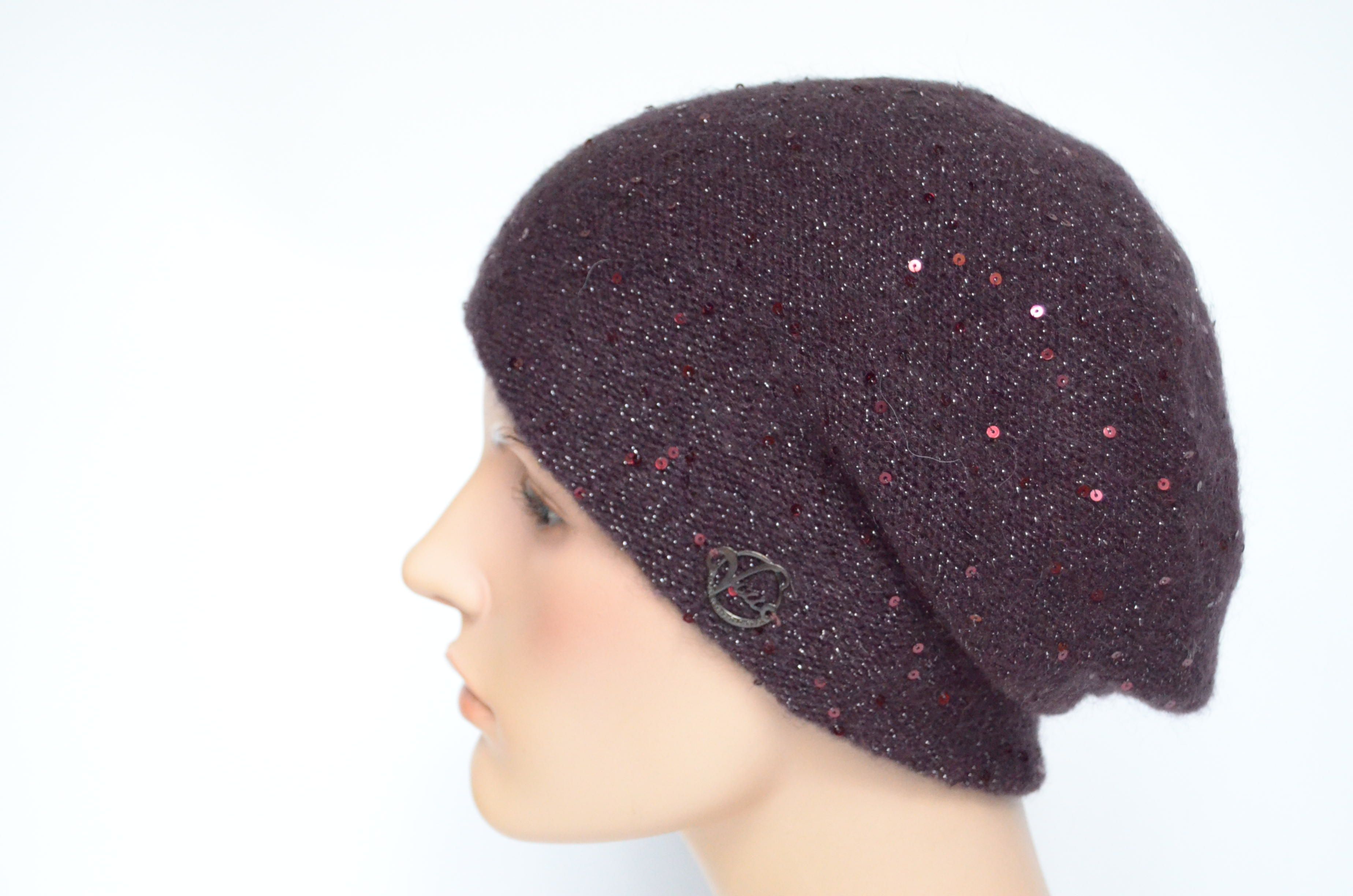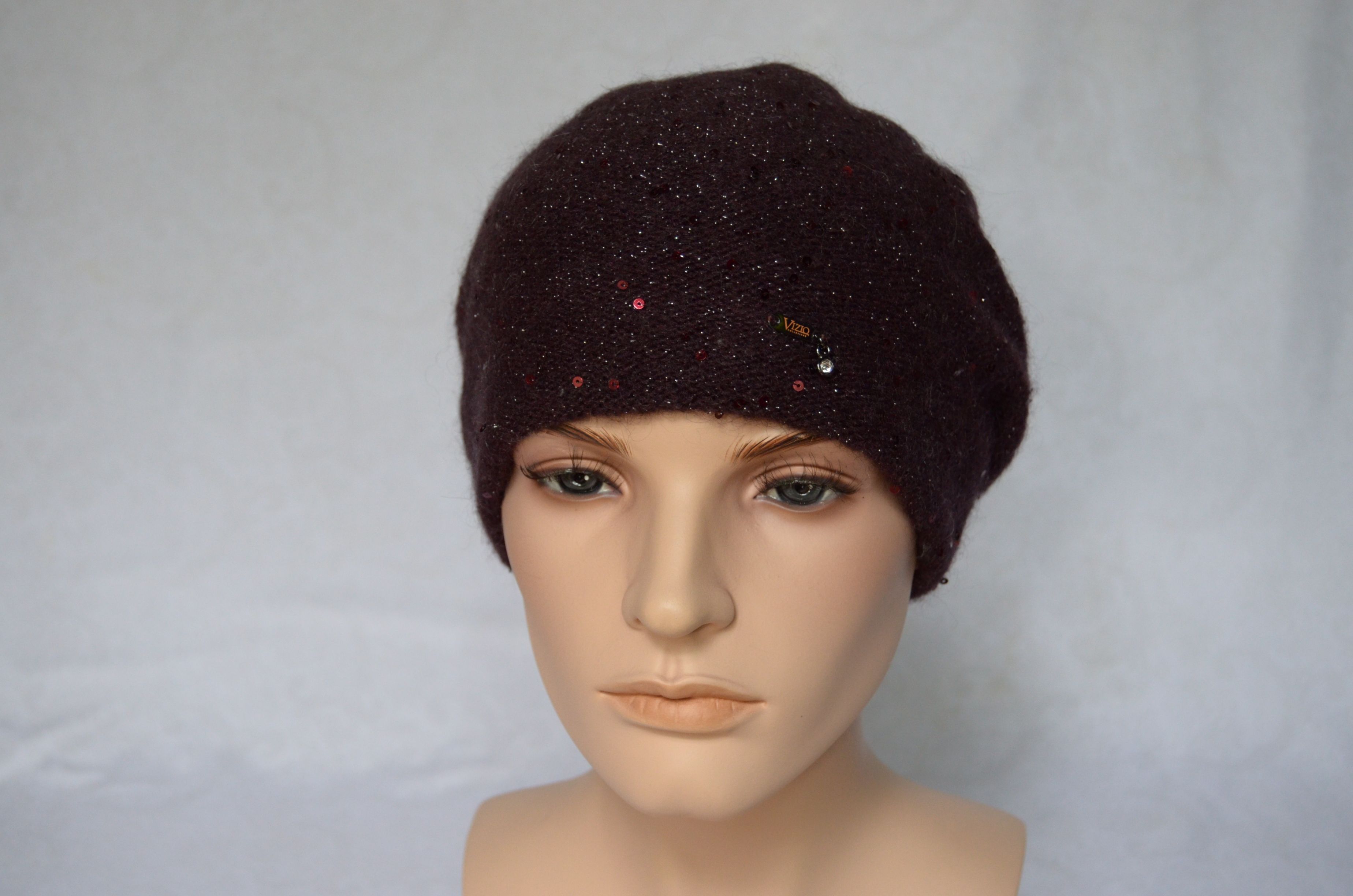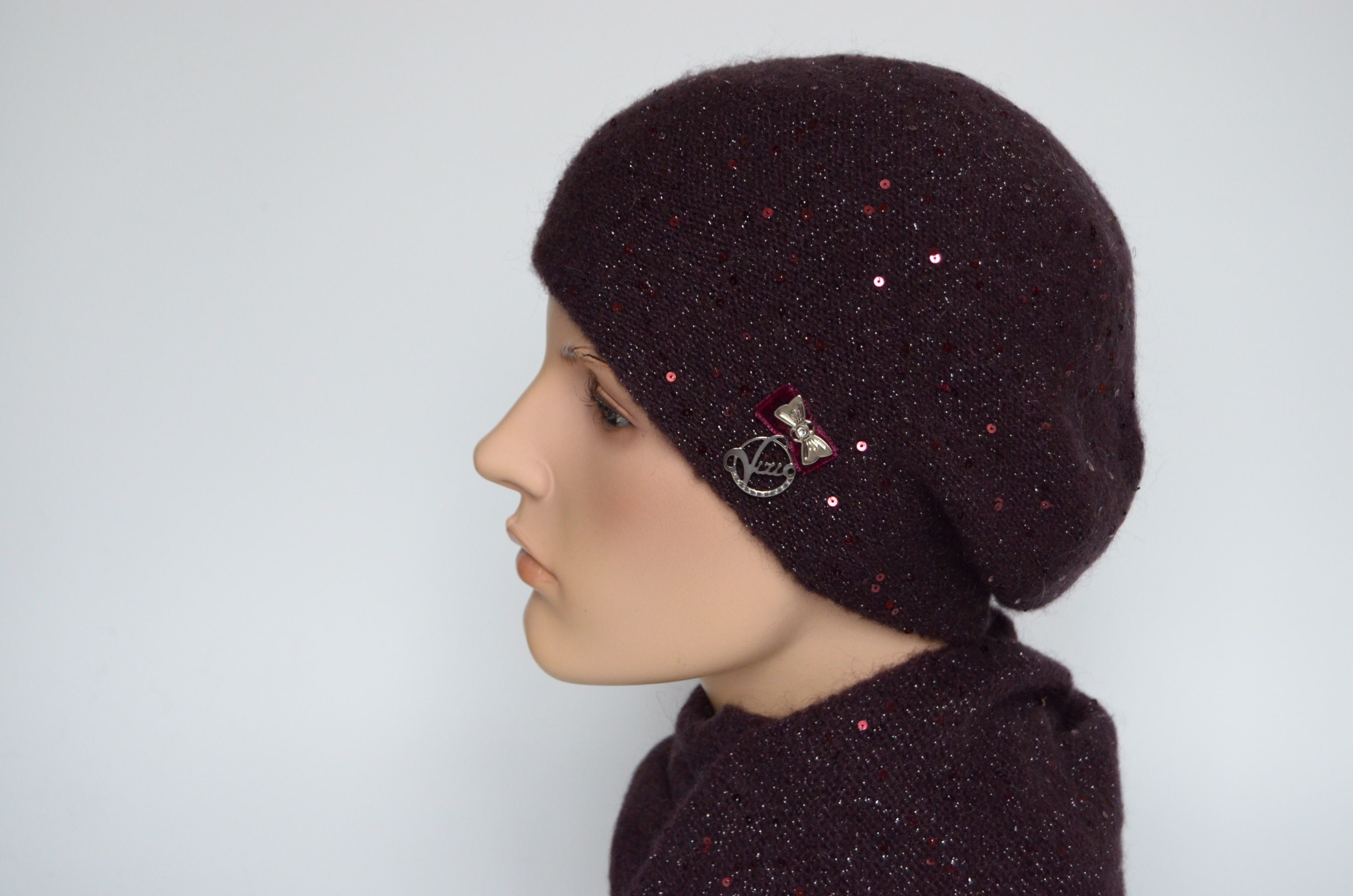 Купить женский вязаный берет сливового винного цвета с пайетками Vizio Италия вы можете в интернет магазине итальянских шапок и беретов для женщин с доставкой по Москве и России