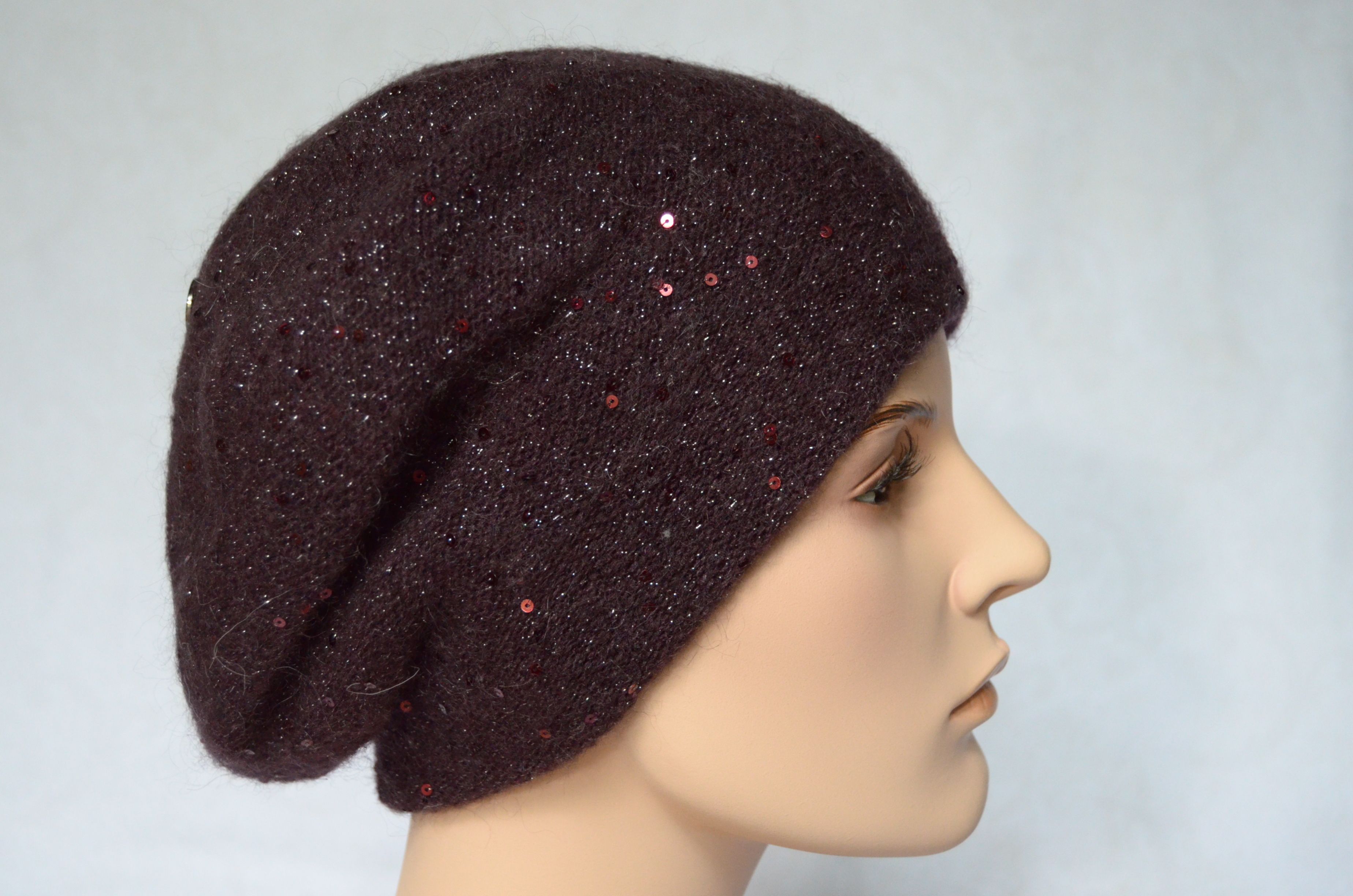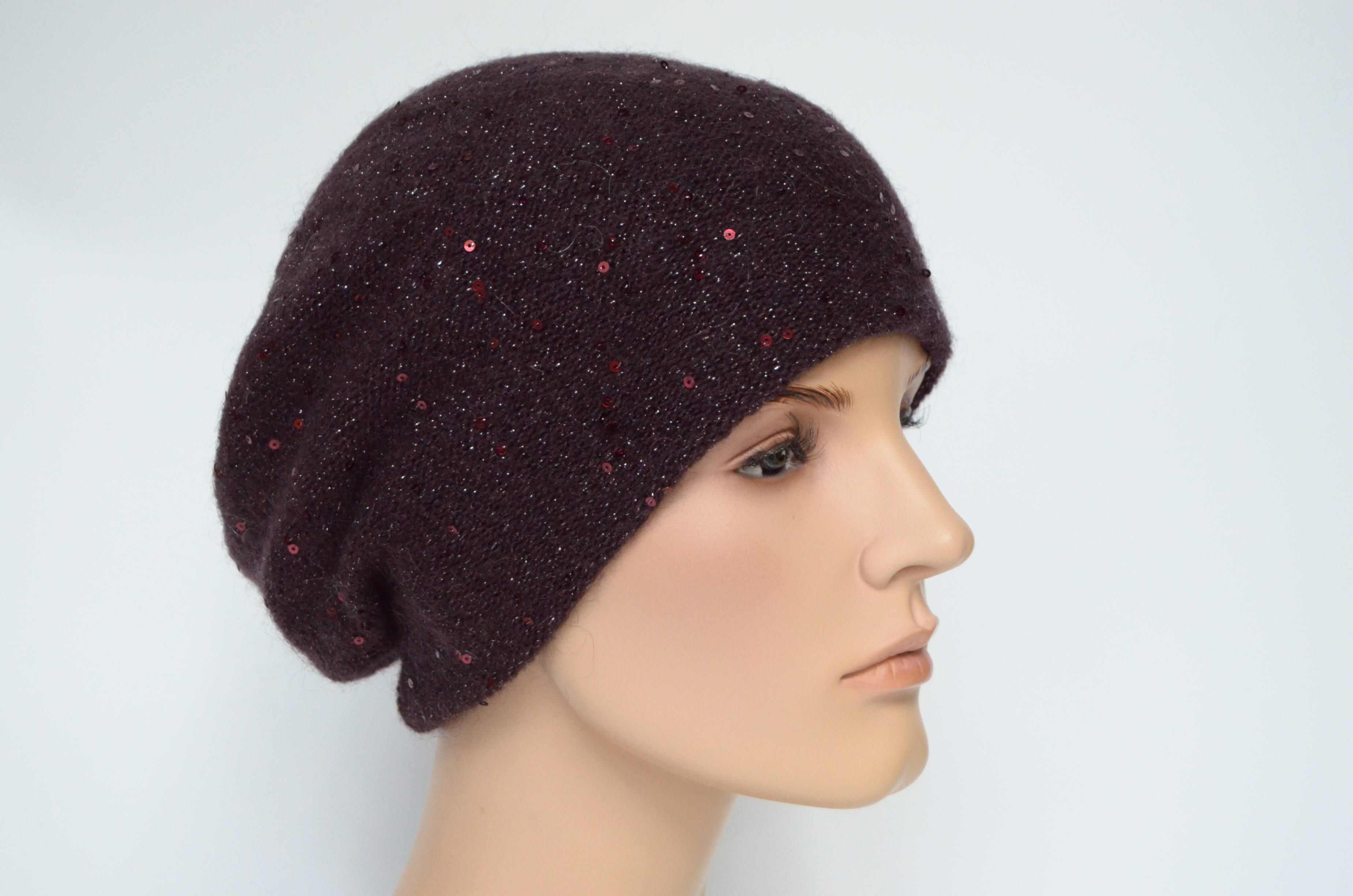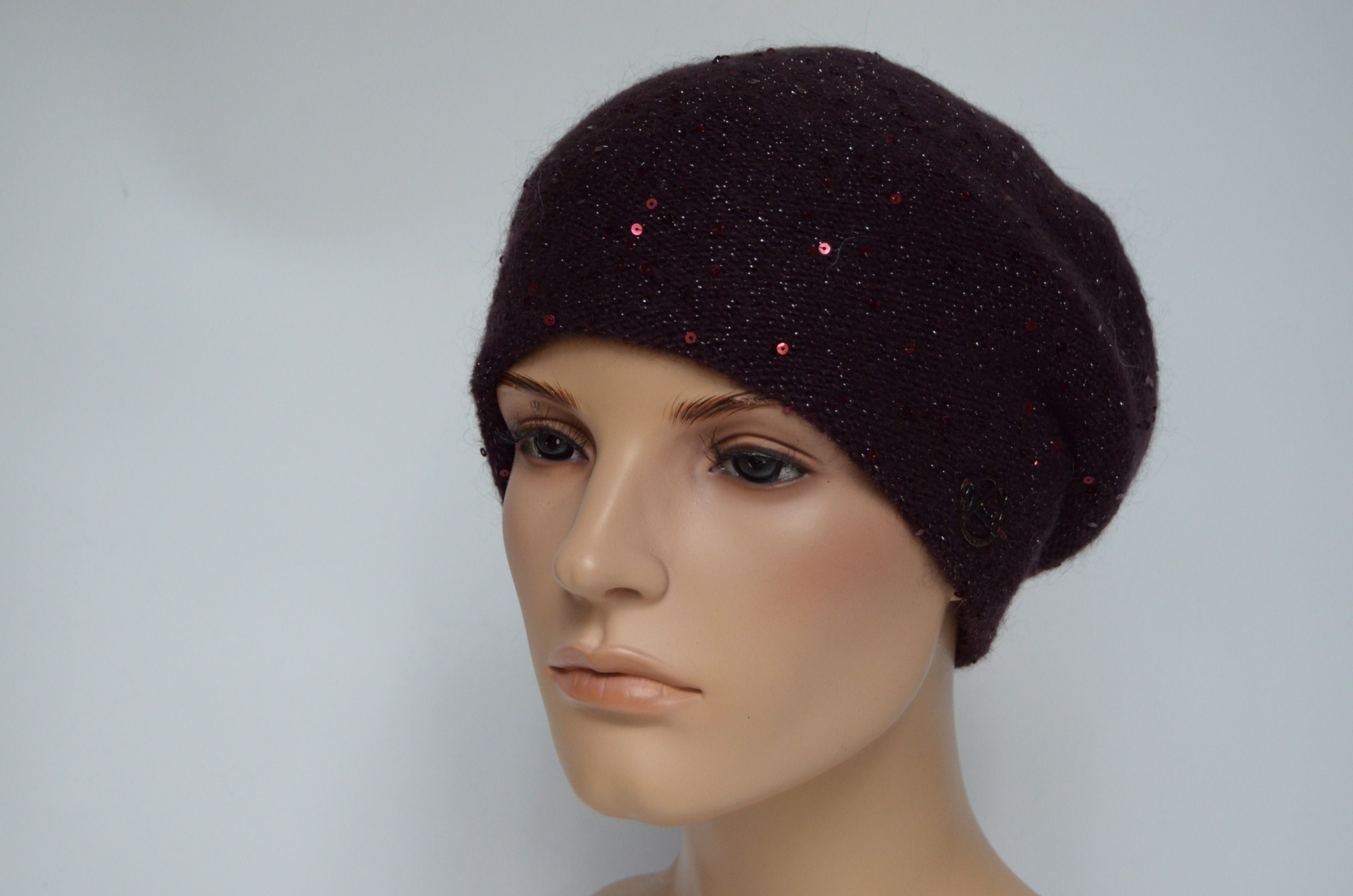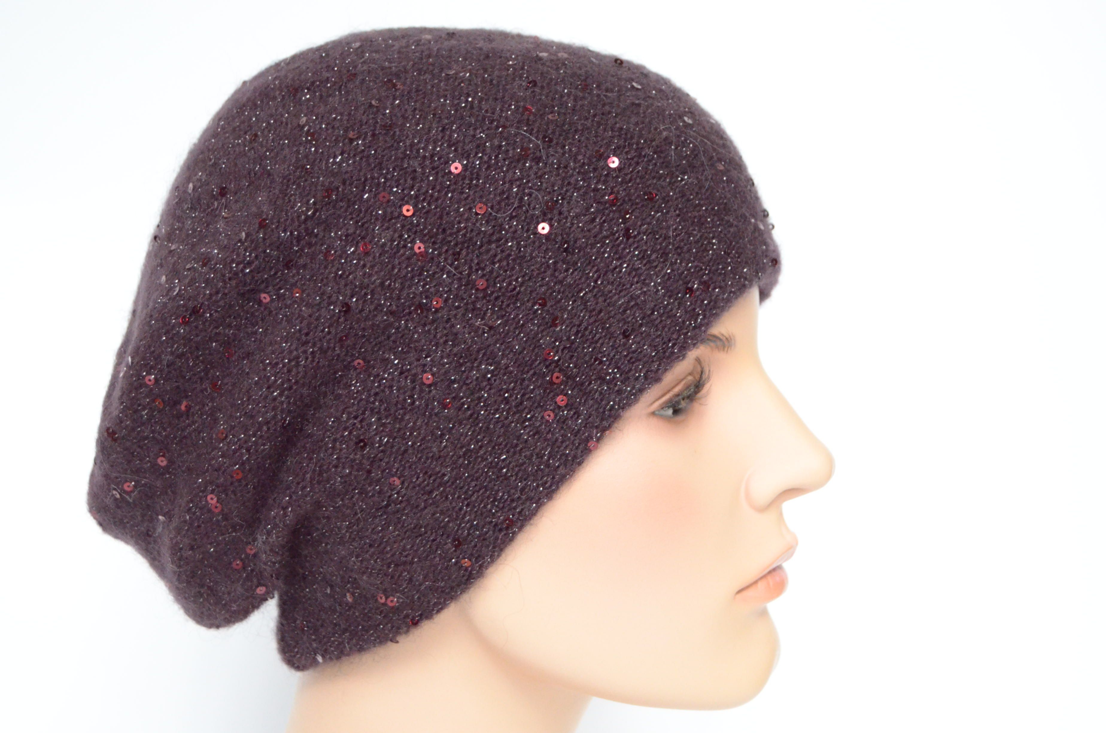 Купить женский вязаный берет сливового винного цвета с пайетками Vizio Италия вы можете в интернет магазине итальянских шапок и беретов для женщин с доставкой по Москве и России