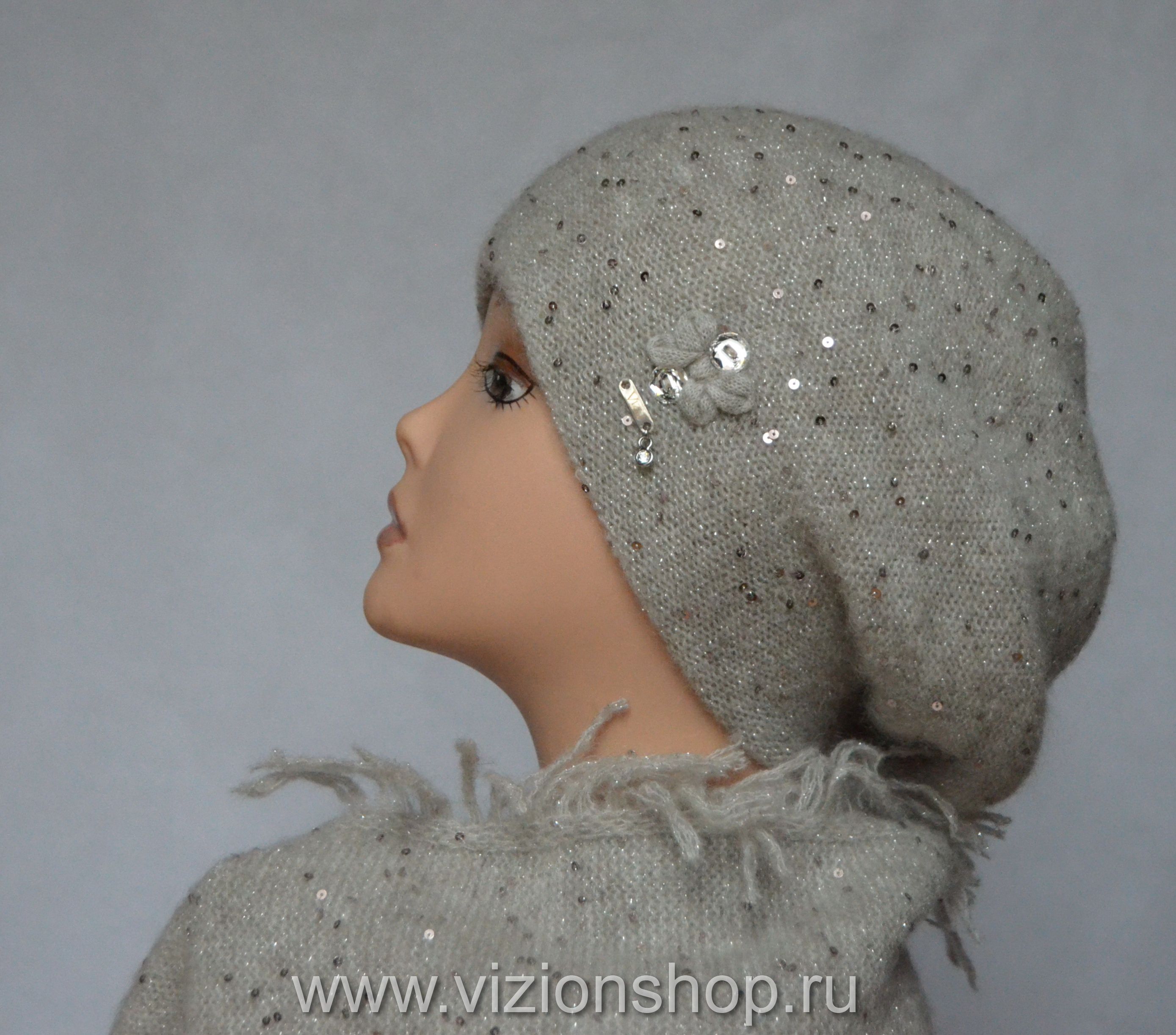 Состав берета: мохер 35 %, полиамид 25 %, шерсть 32 %, пайетки, полиэстер 6 %, эластан 2 %